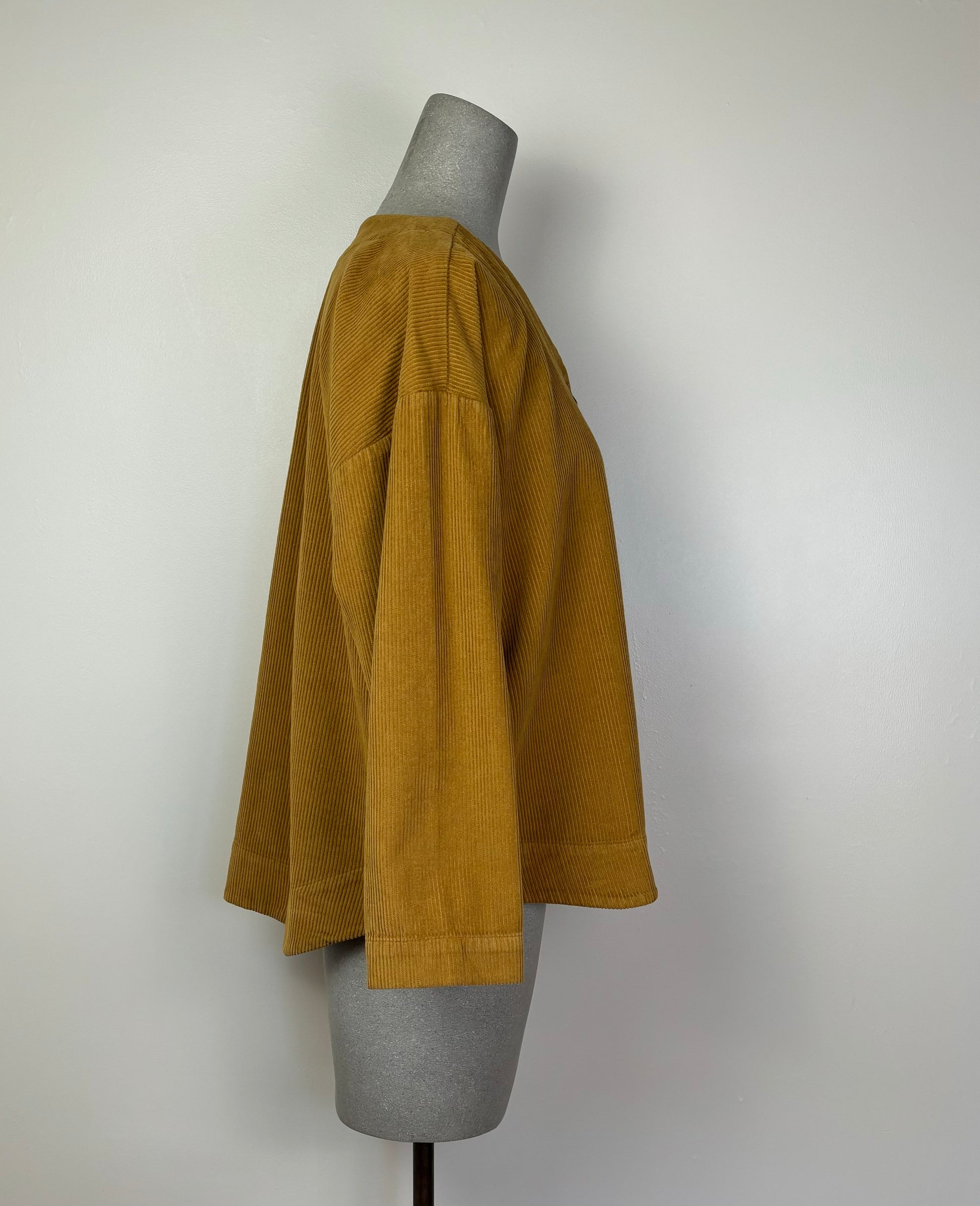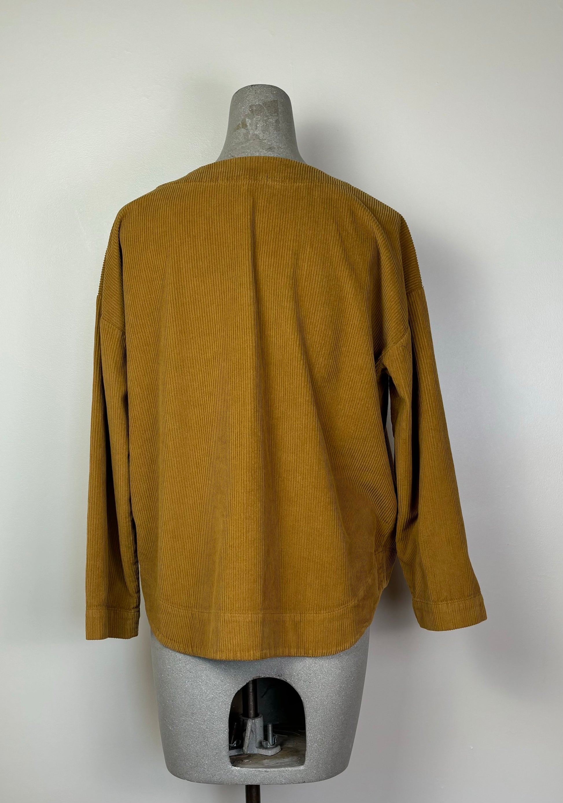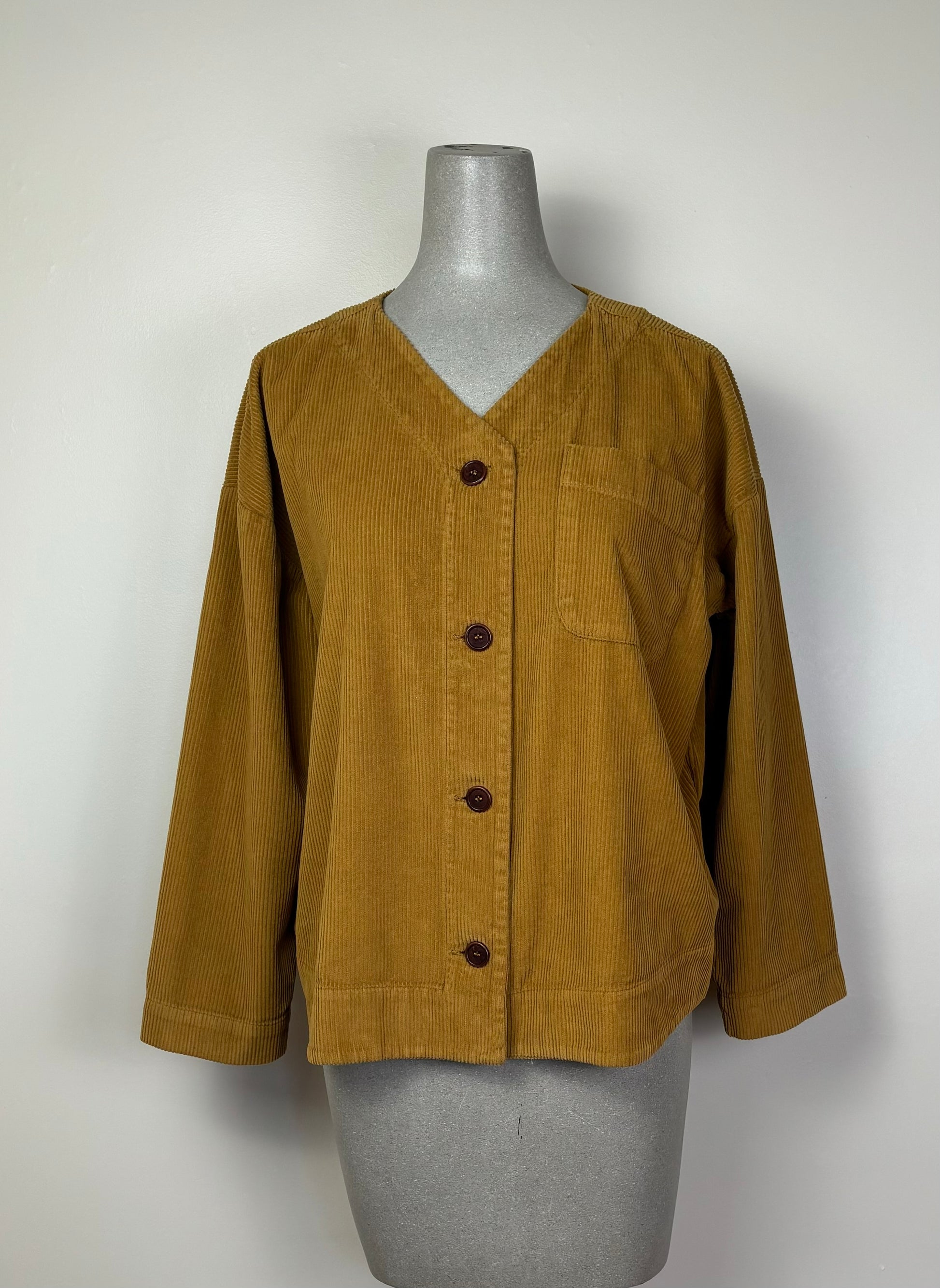 The Acer Shirt in organic cotton corduroy is a boxy V-neck style with a button down front and full length sleeves. Features a front patch pocket on the left chest.