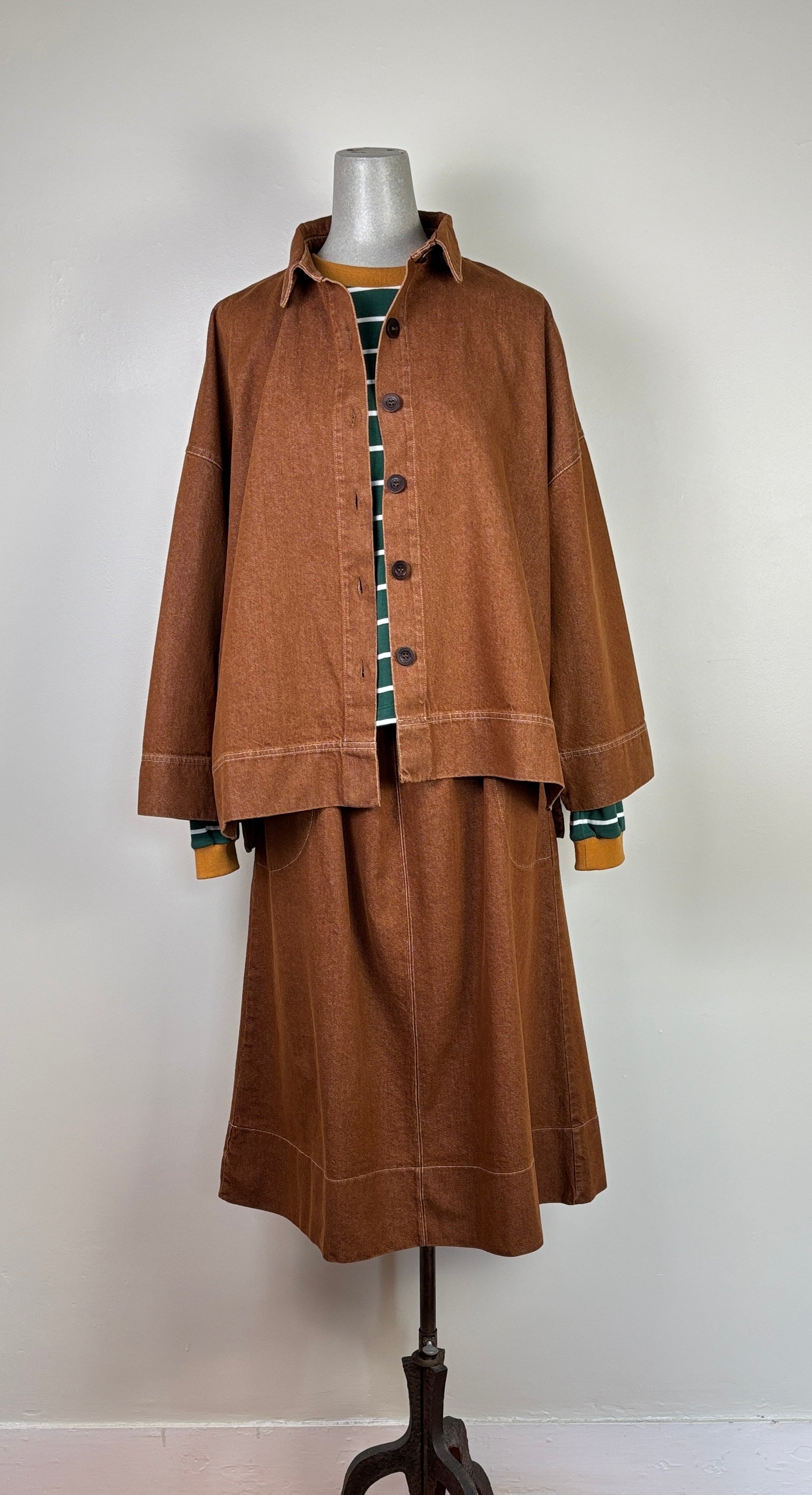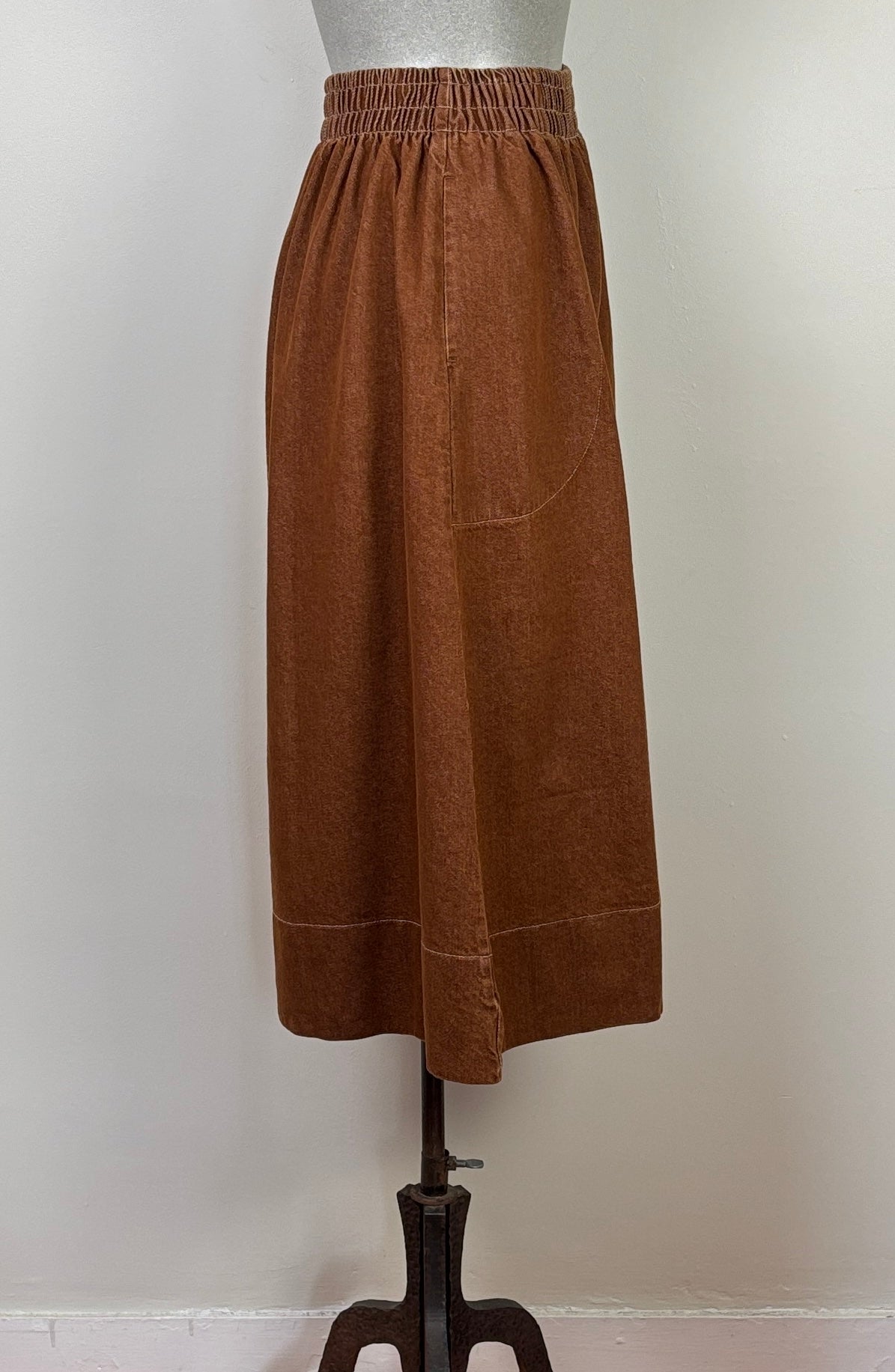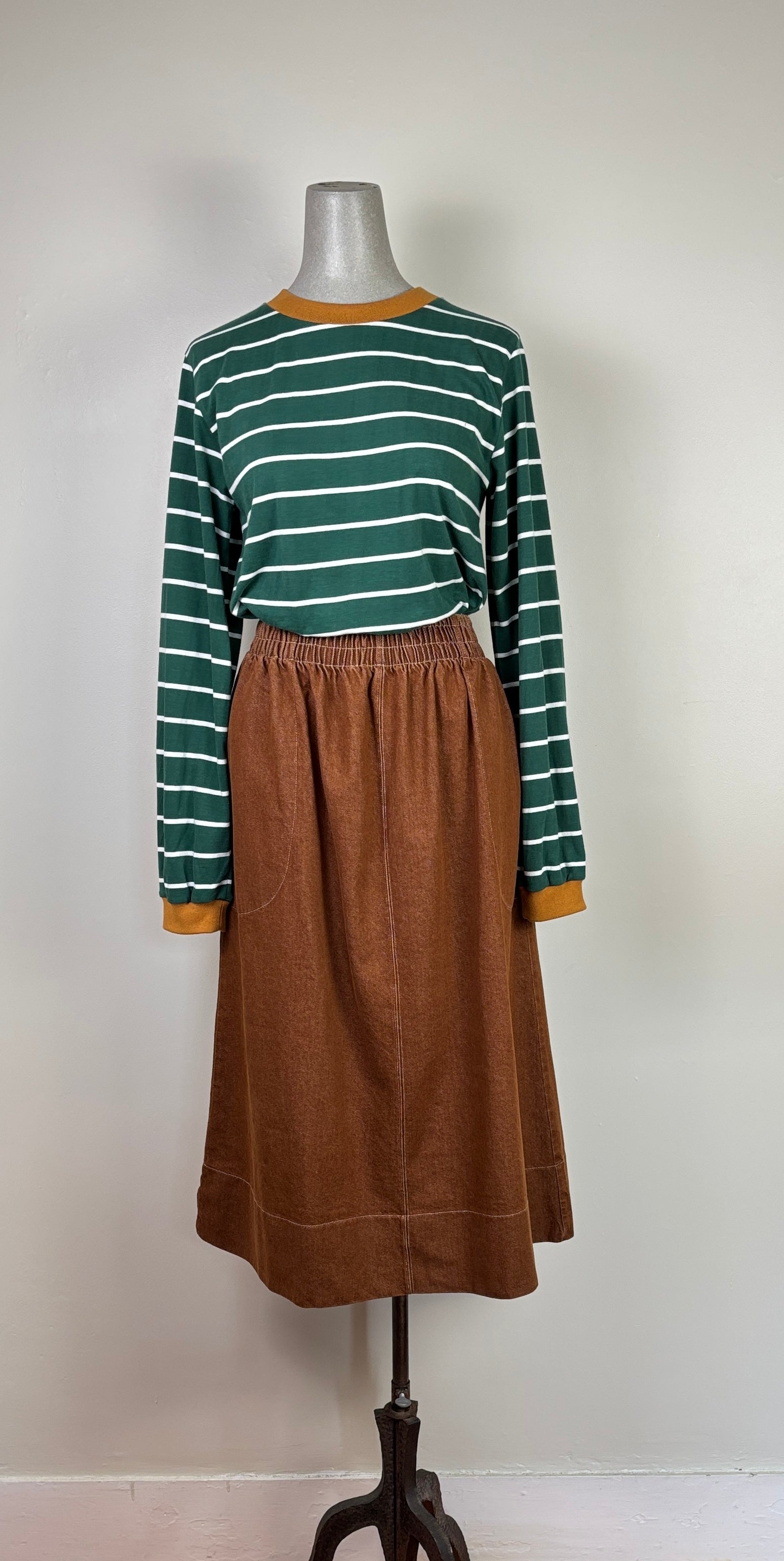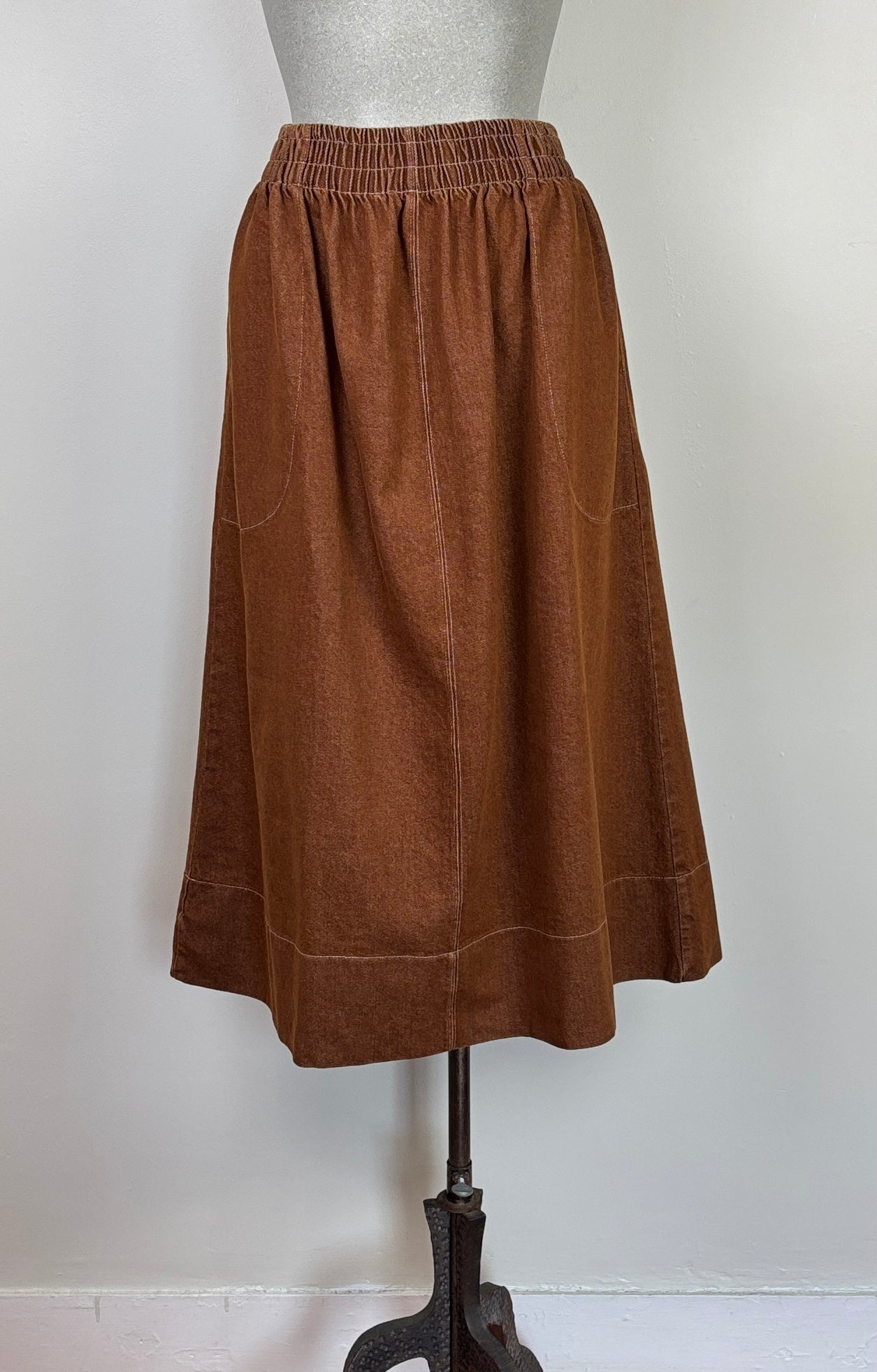 A pull on skirt in a mid-weight brushed denim. The elasticated waistband has contrast topstitching which carries through the style. Deep front pockets set on the side seams, center front seam, and deep hem. Fit is traditional.60% cotton, 40% recycled cottonColor Bark BrownCold water machine wash on gentle cycle. Hang dry or minimal machine dry on low heat.Made ethically in Portugal