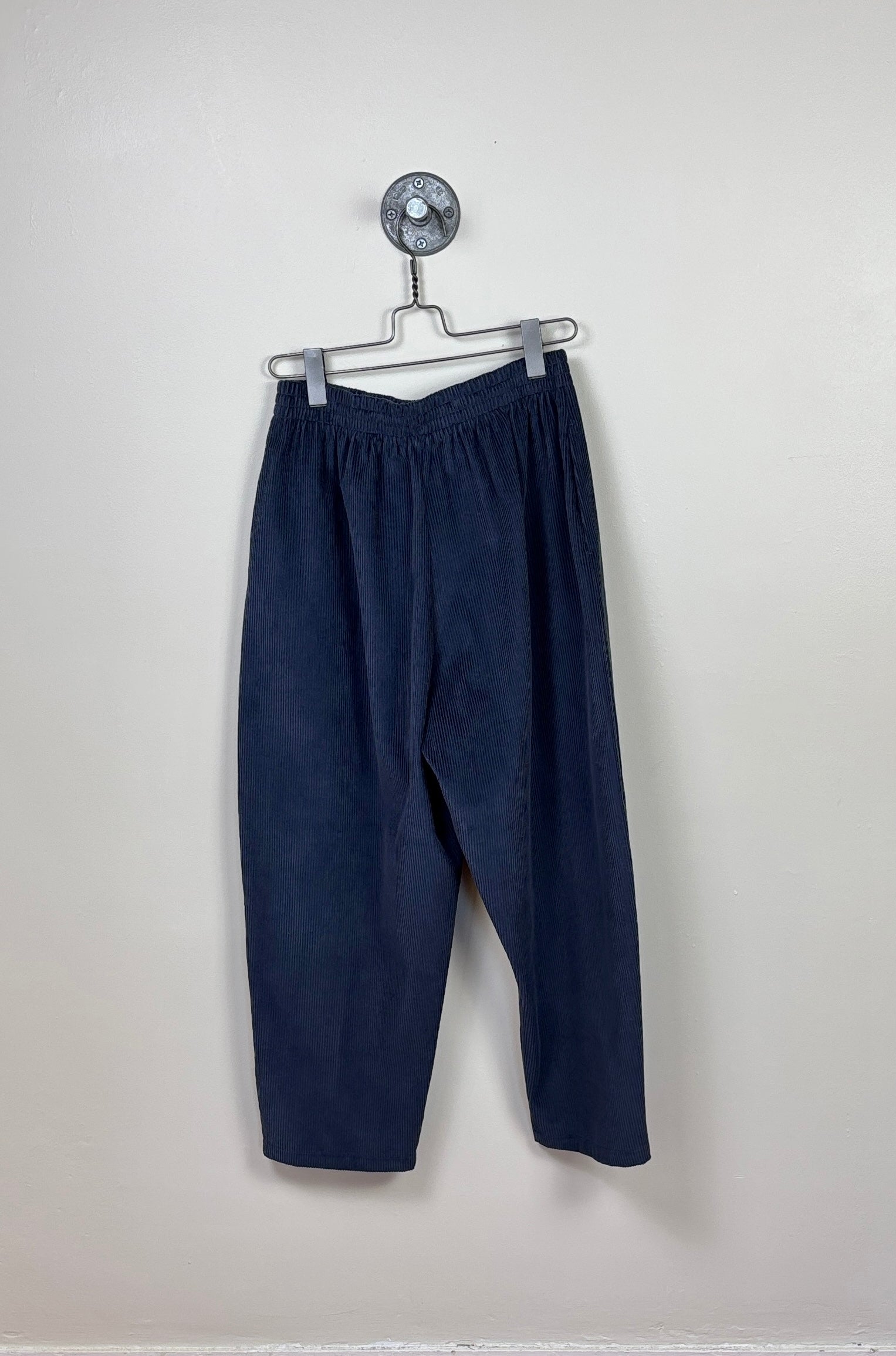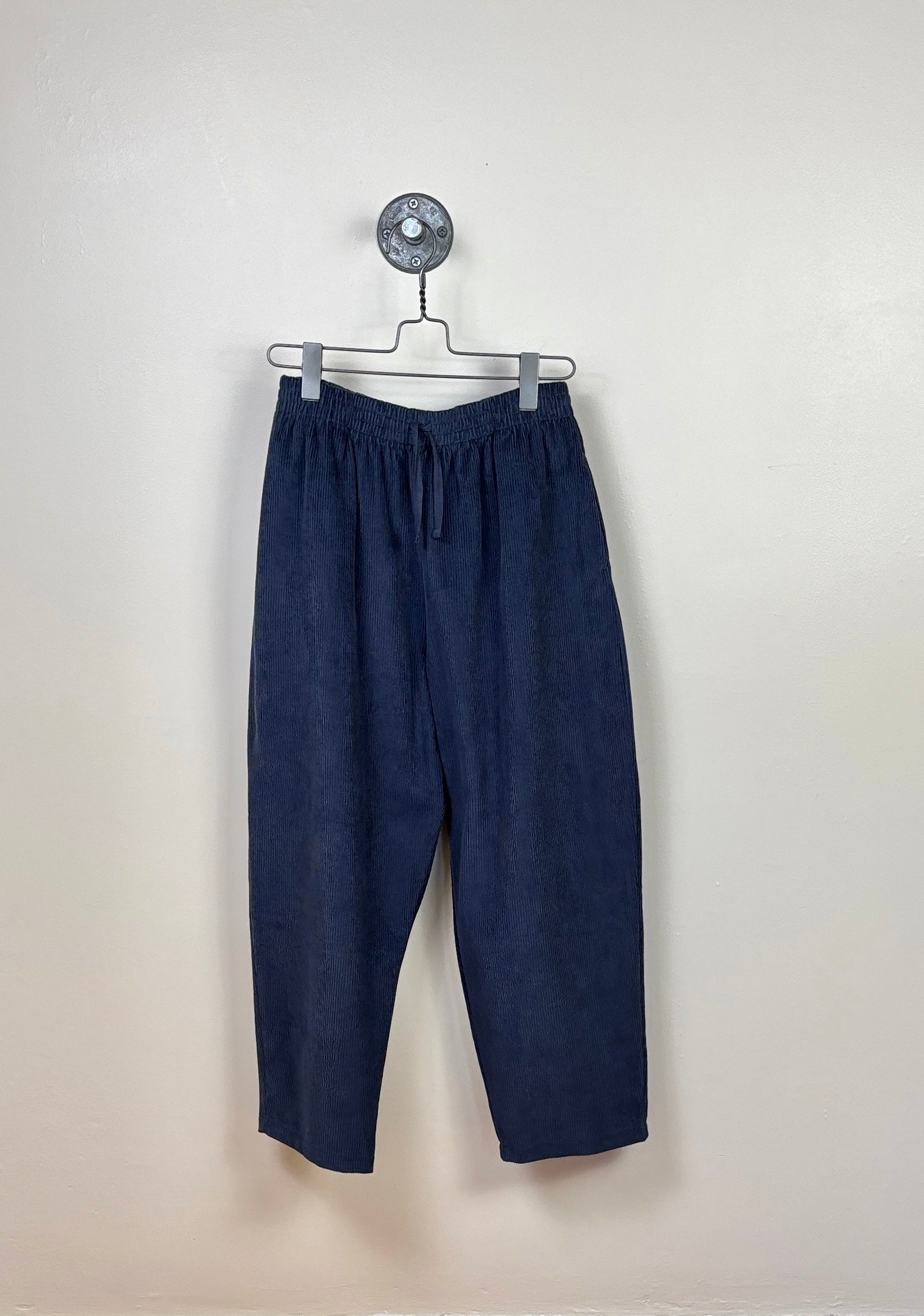 A pull on pant in a medium wale corduroy. The triple stitched elasticated waistband has a drawcord for adjustment. Side seam pockets, curved leg that tapers to a cropped length. Fit is meant to be relaxed.