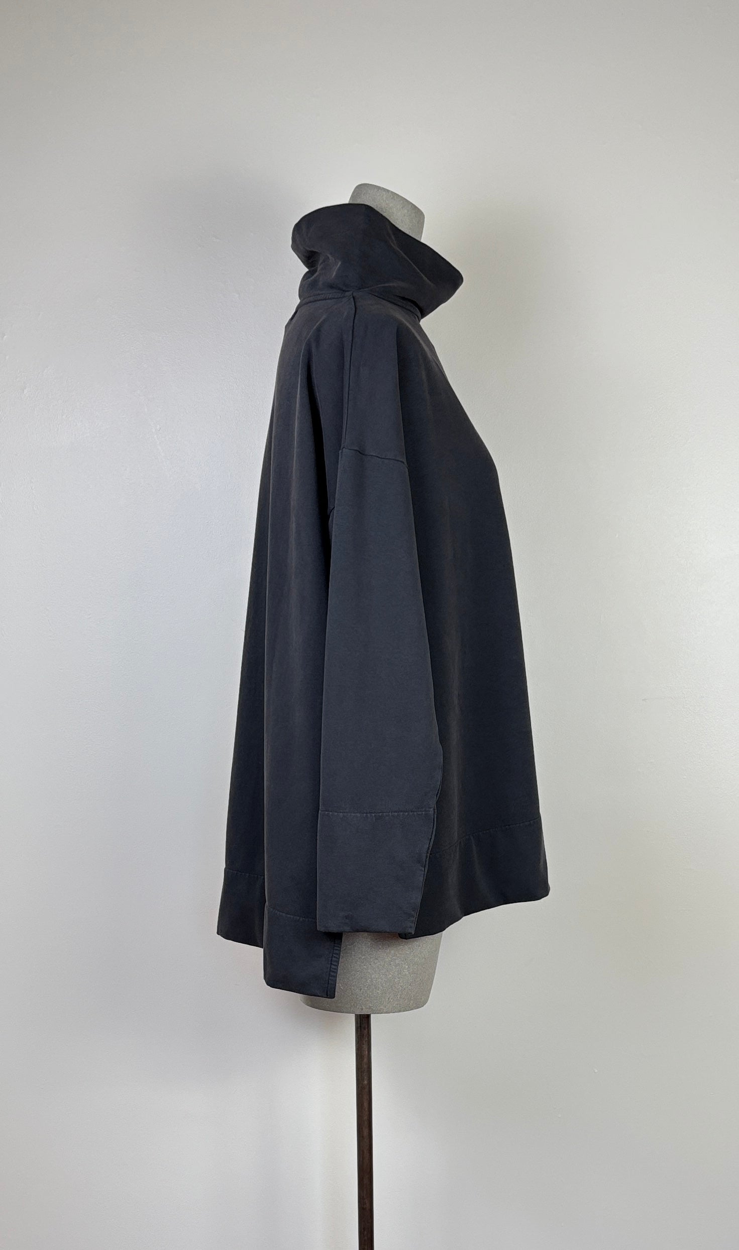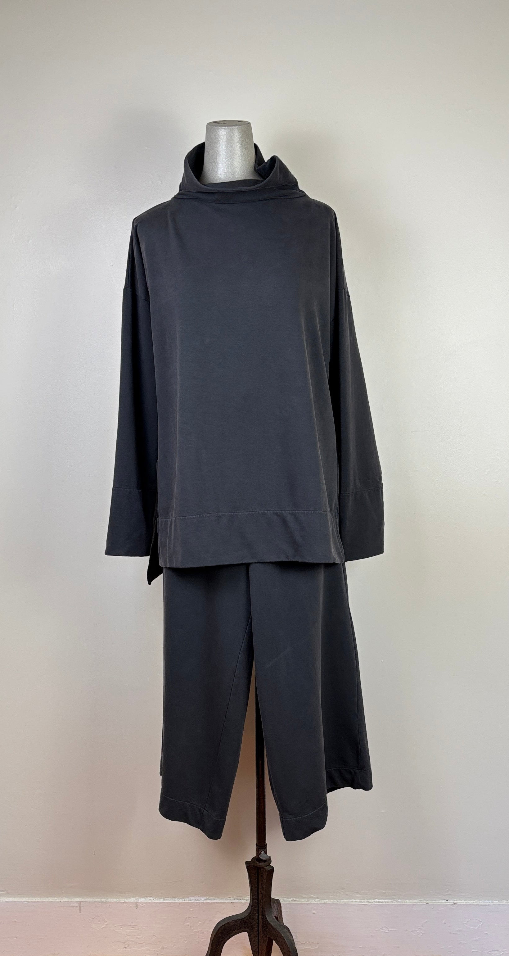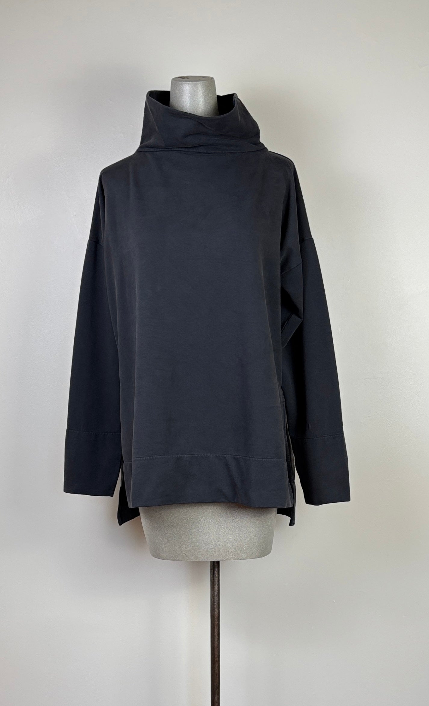 In the cotton felpe, a sweatshirt material with a flat top finish and velvety soft backing. This style has a standup neck, drop shoulder with a deep hem at the cuffs, boxy body with side slits and a high/low hemline. Fit is relaxed.