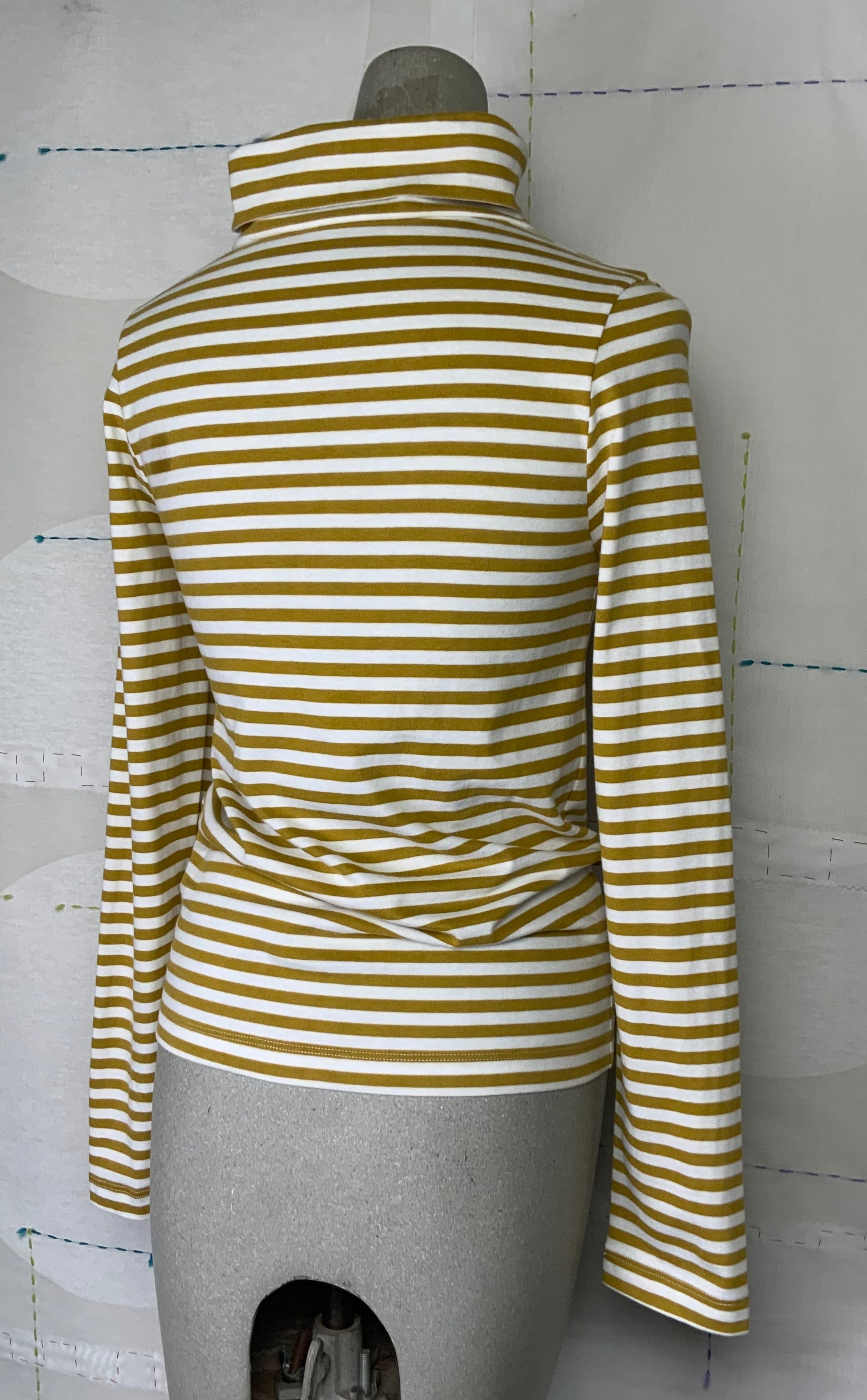 The Pine-Sue is a slimline notched tall neck top with full length sleeves, crafted in a striped brushed jersey.