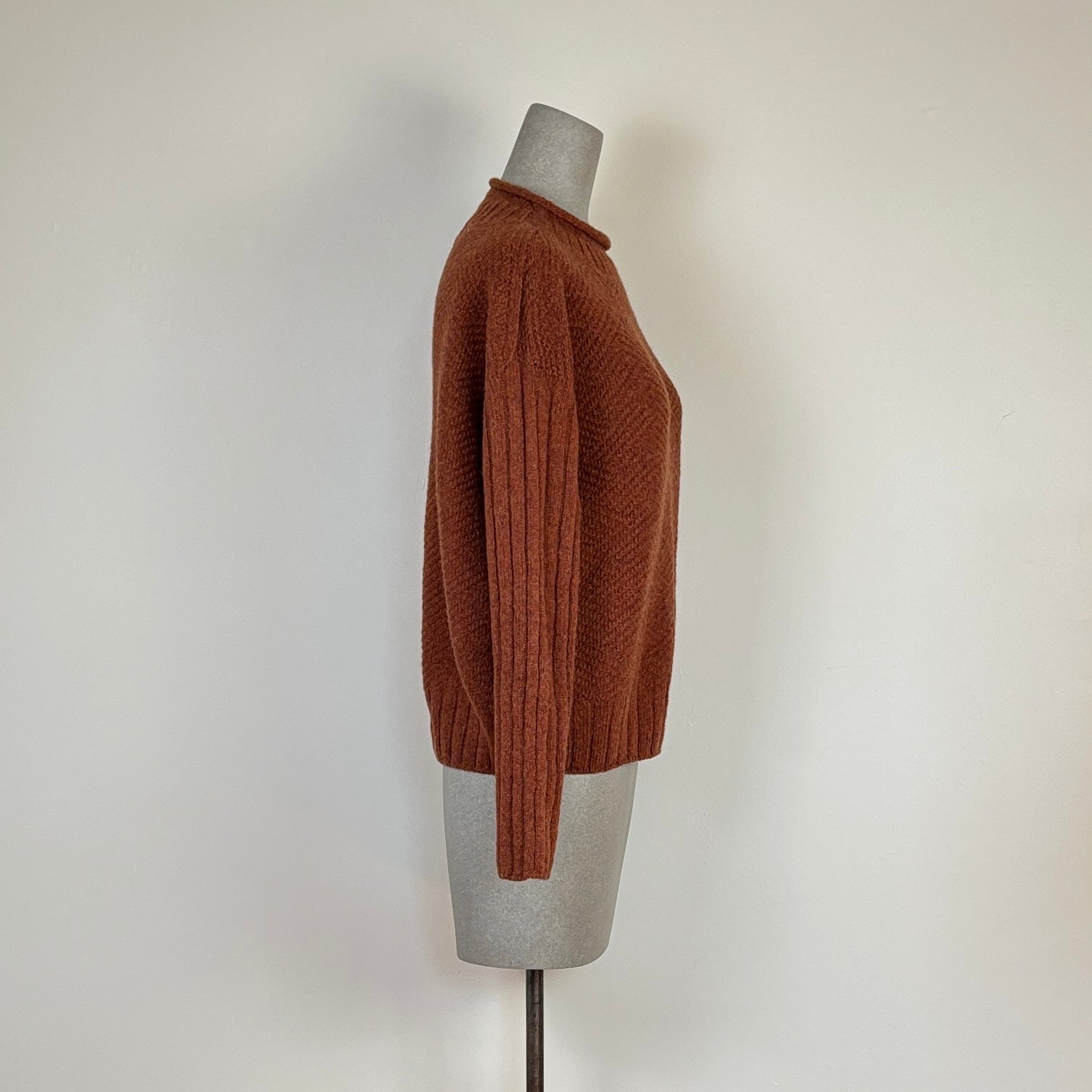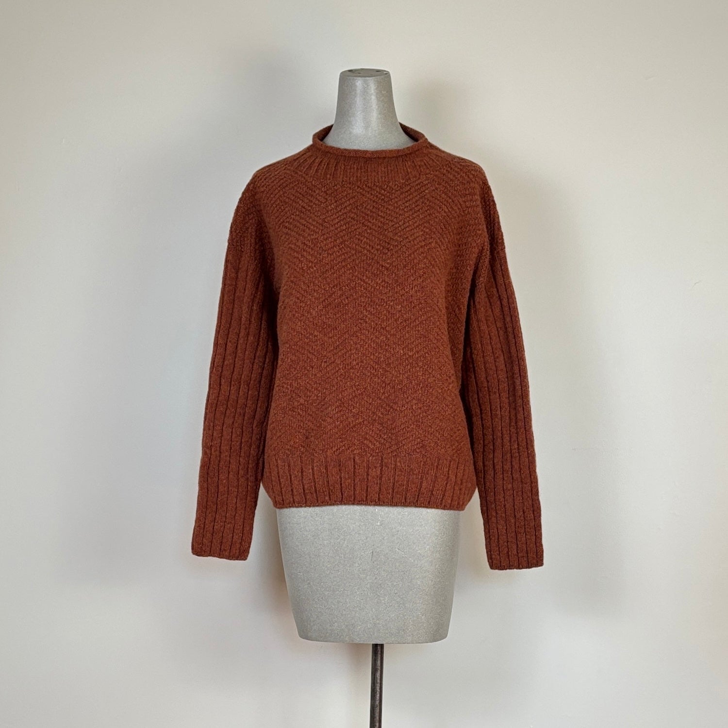 A lambswool knit pullover featuring a rolled round neck, full rib sleeve, and chevron stitch detail across the body.Part of the British knitwear collection, this style is knitted using state of the art Japanese seamless knitting machine which create fully finished pieces with almost no yarn waste.100% lambswoolColor Rust MarlHand wash in cold water. Lay flat to dryMade ethically in the UK.