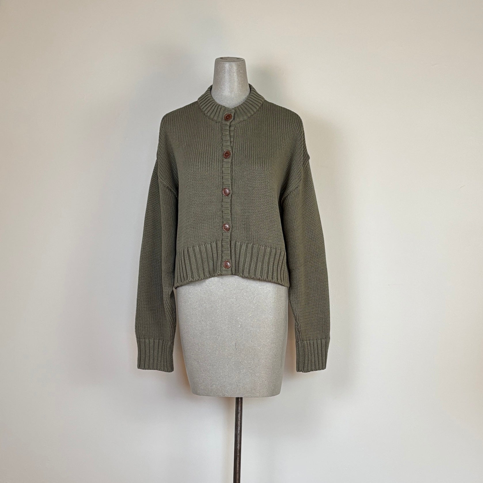 A cropped boxy cardigan with a button down placket and rib knit detail to the collar, cuffs and hem. Buttons are a sustainable Corozo.100% organic cottonColor Soft KhakiHand wash in cold water. Lay flat to dryMade ethically in Portugal