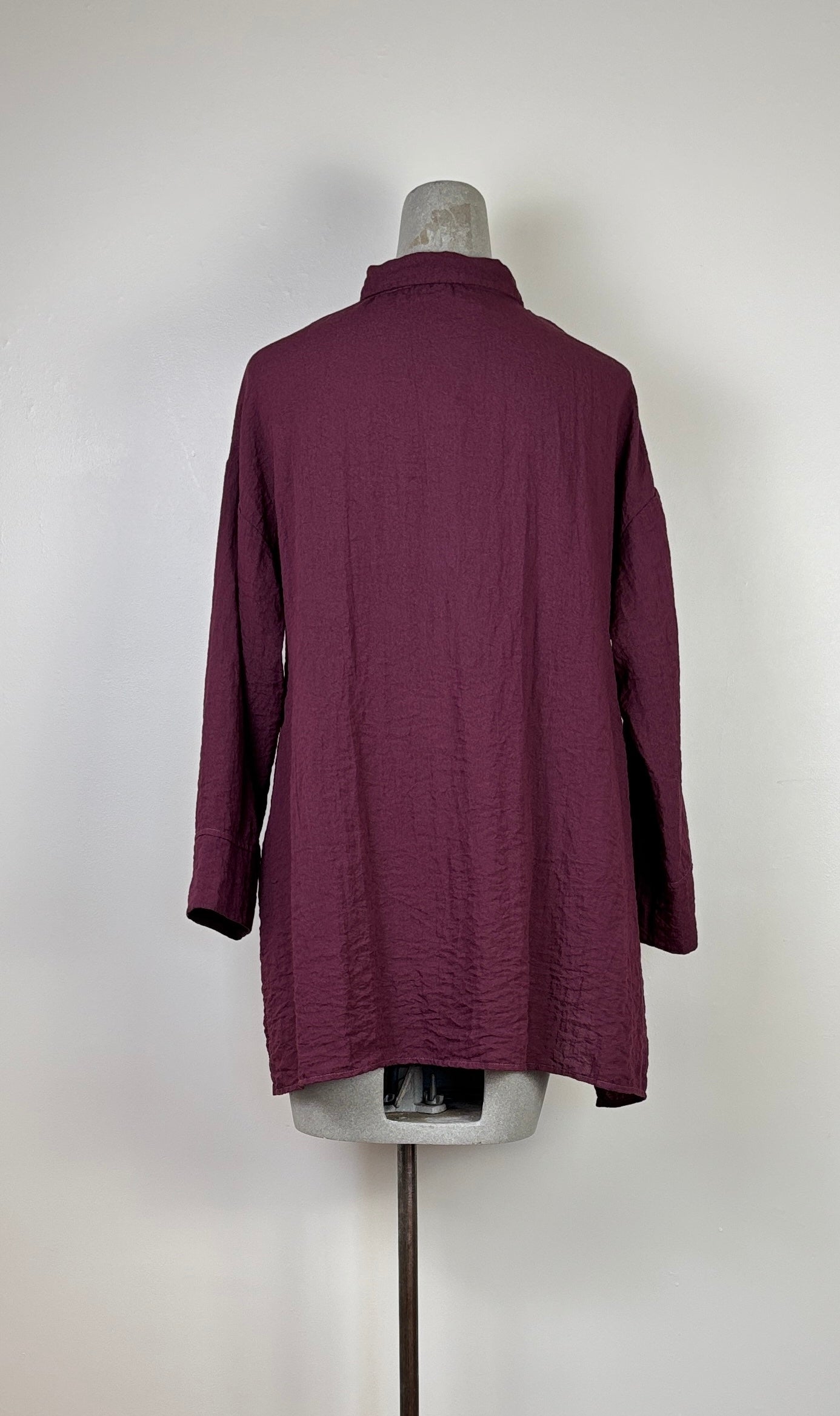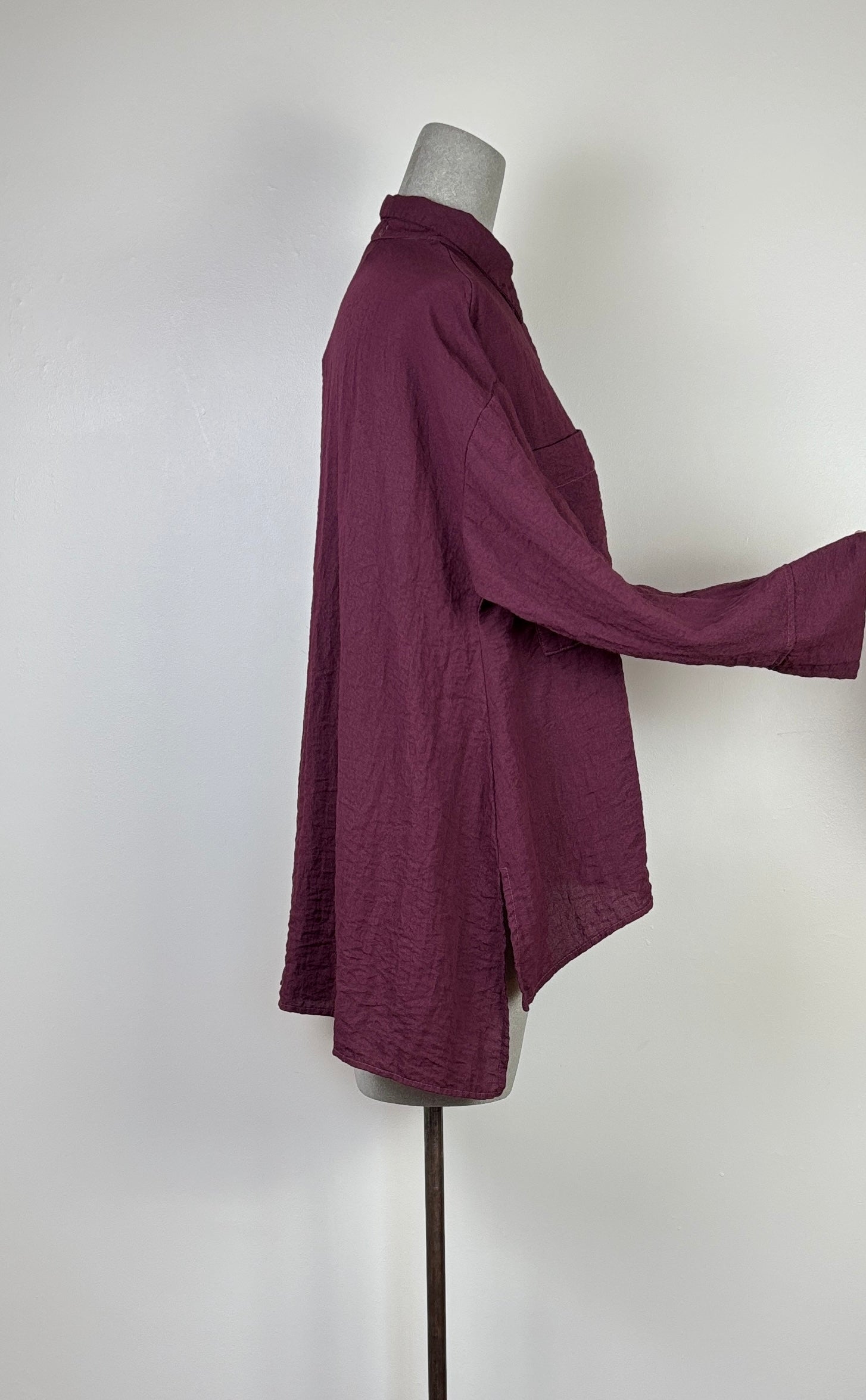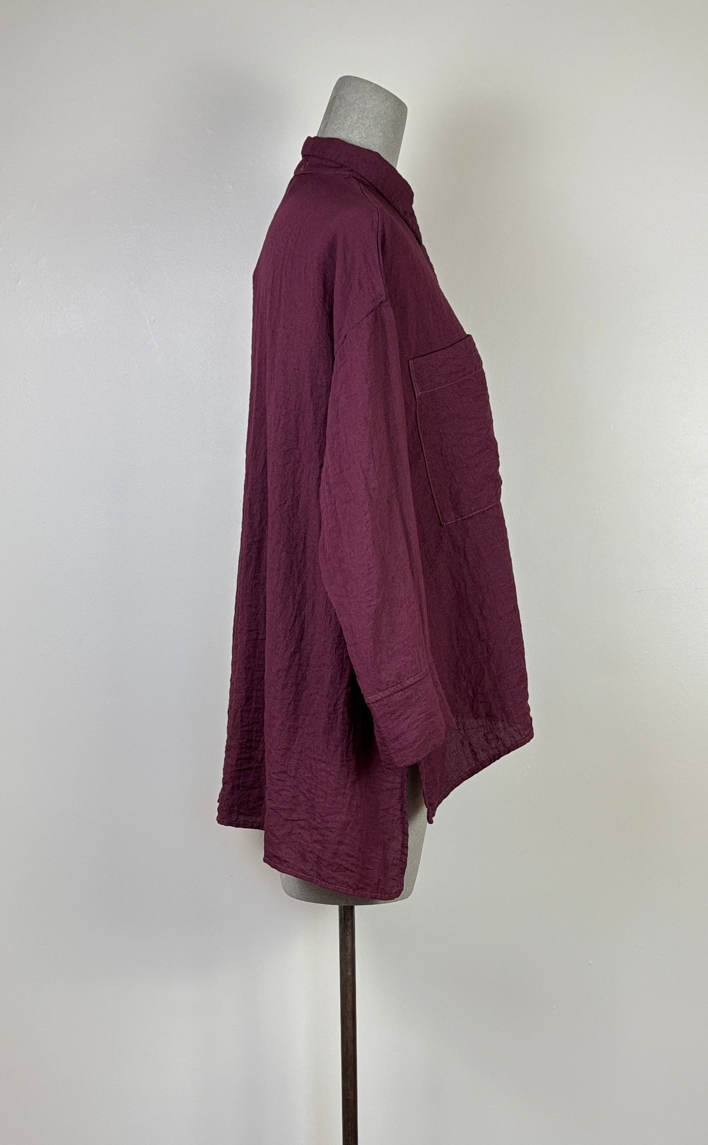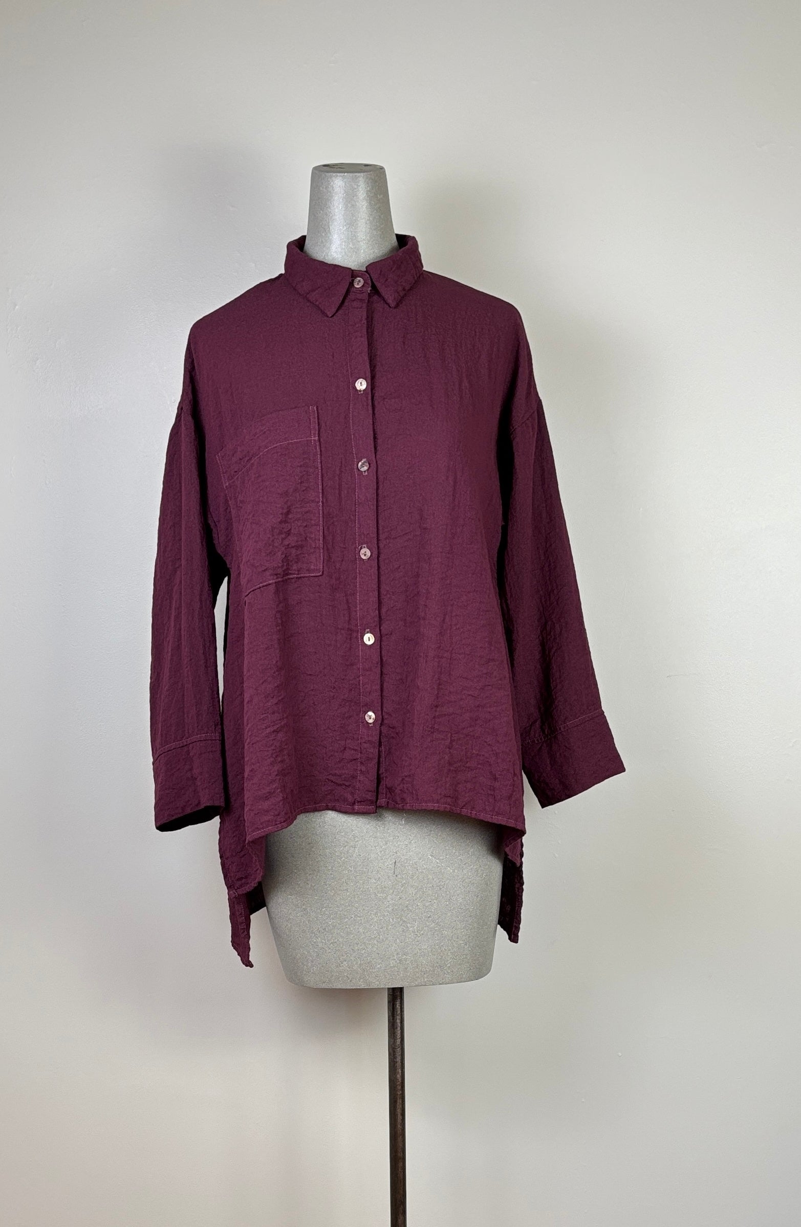 From the fall parachute collection, a button front collared shirt with a single front patch pocket, A-line body, drop shoulder on wrist length sleeves with deep hem cuffs, and a high/low hemline with side slits. Fit is relaxed and generous.