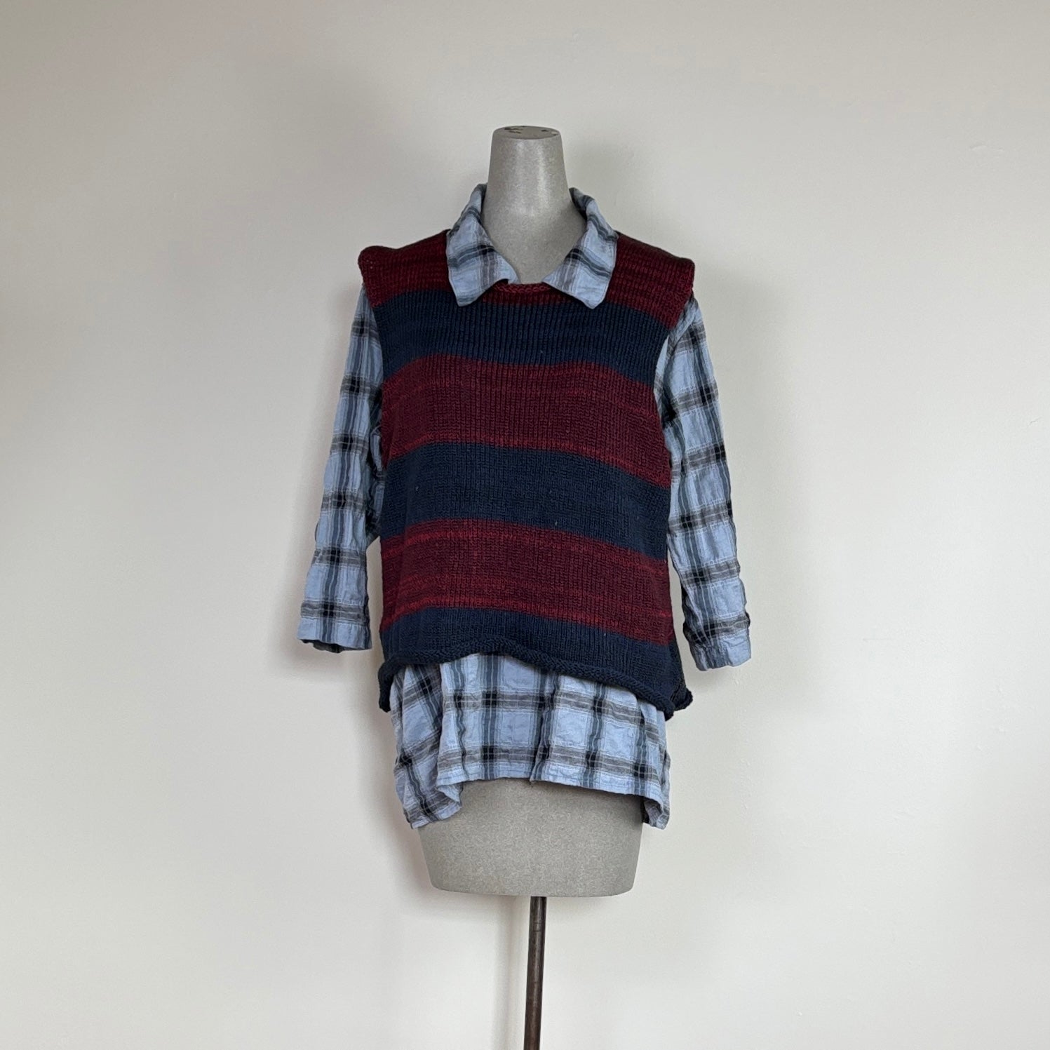 A button front, collared shirt with 3/4 sleeves, and a curved high/low hemline. Fabric is a puckered plaid. Fit is traditional and we recommend sizing up for a more relaxed look.