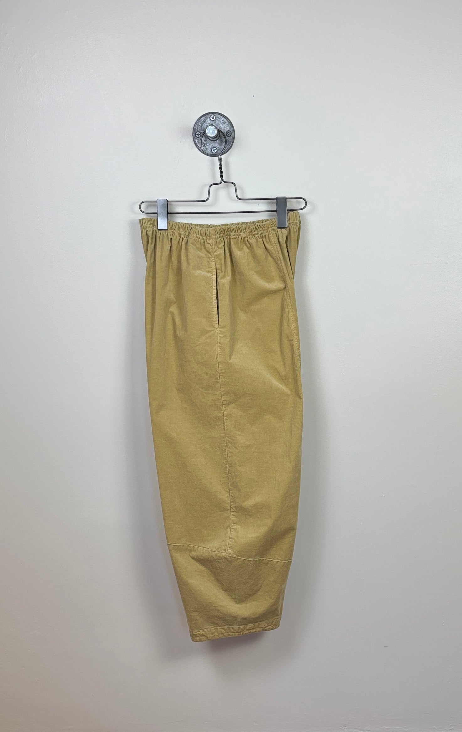 In the velvety and stretchy mini corduroy, an easy pull on pant with elastic waist, and curved “lantern” leg. Length will hit most at the ankle and fit will be relaxed through the thigh and calf.