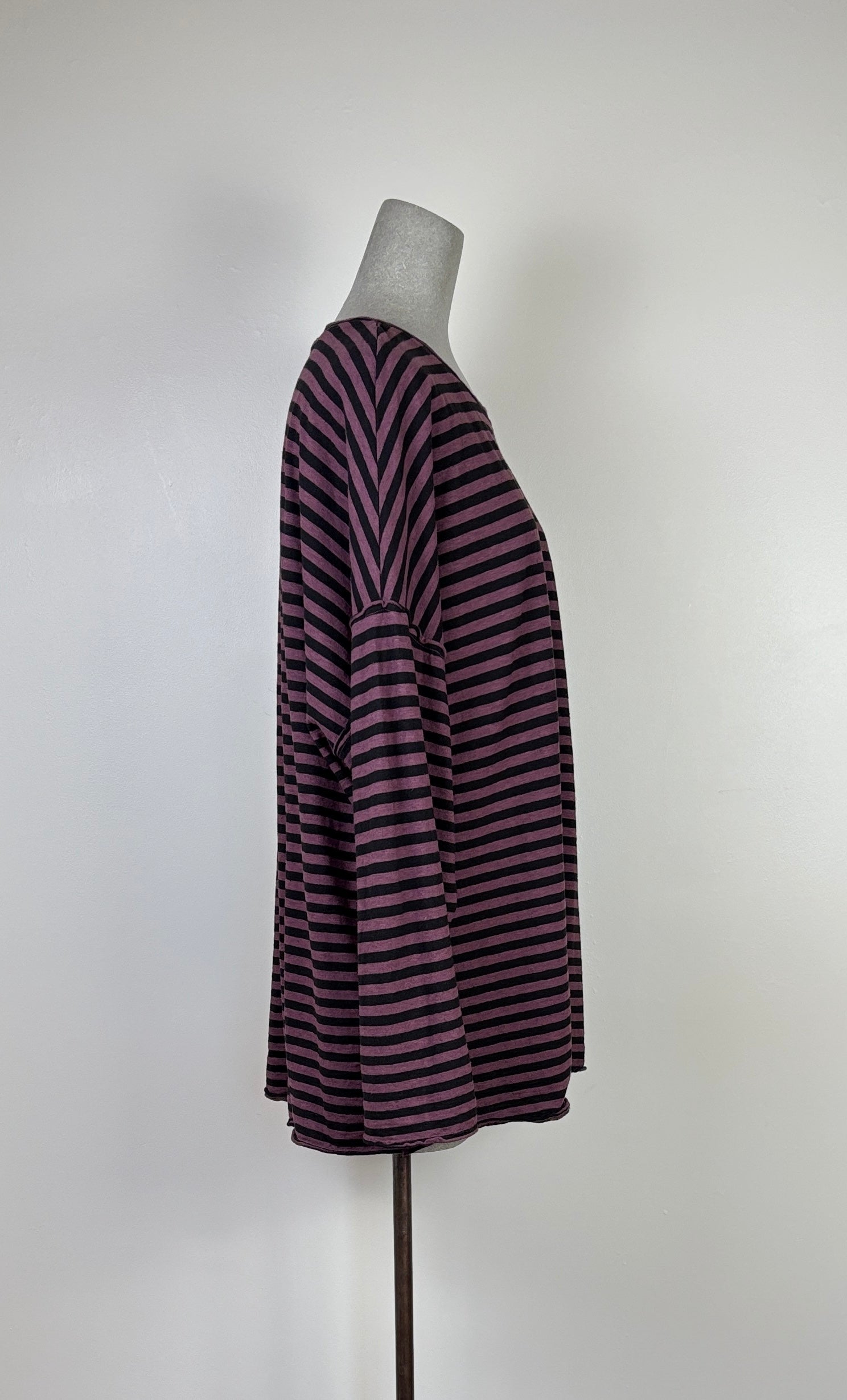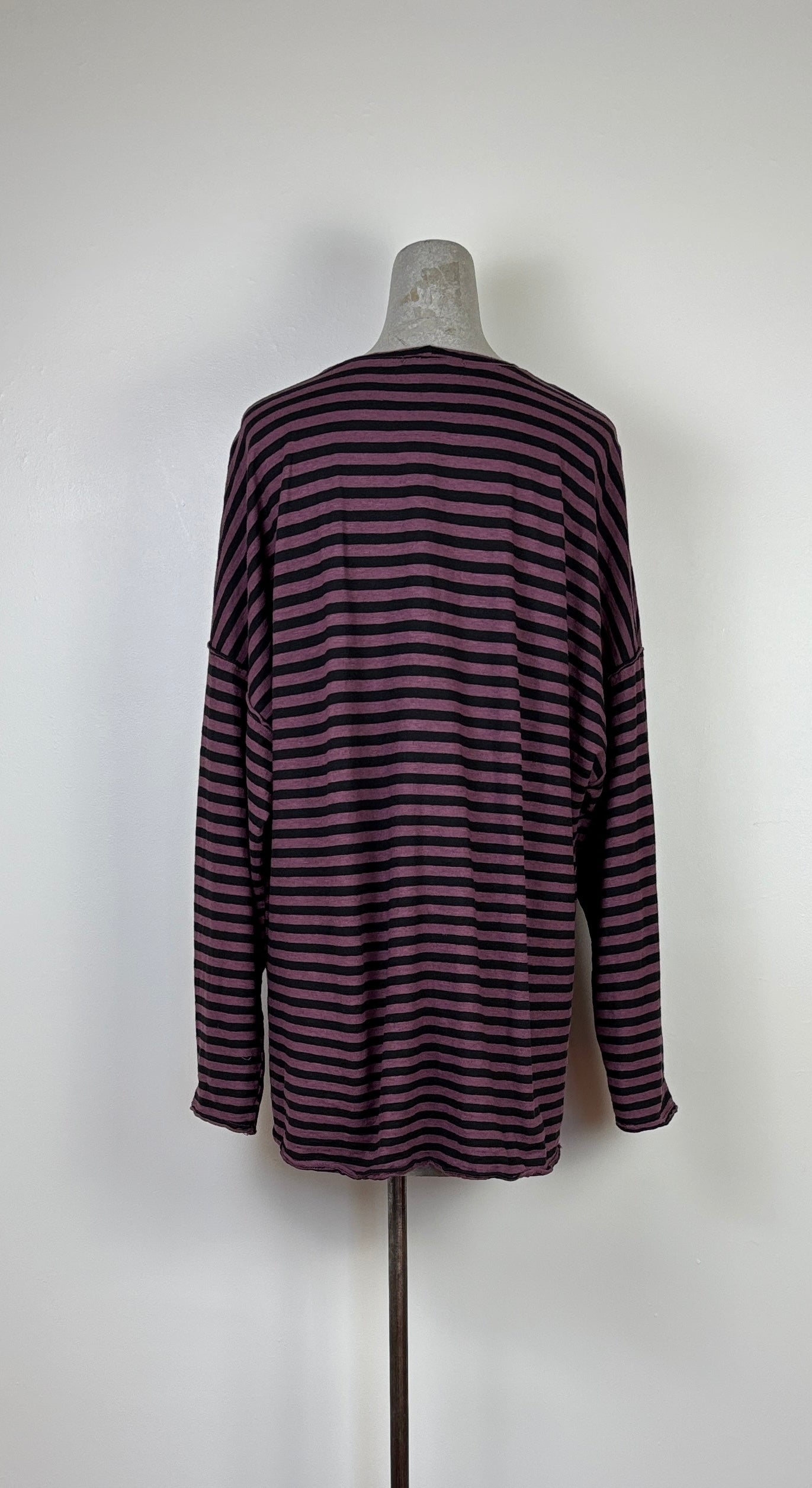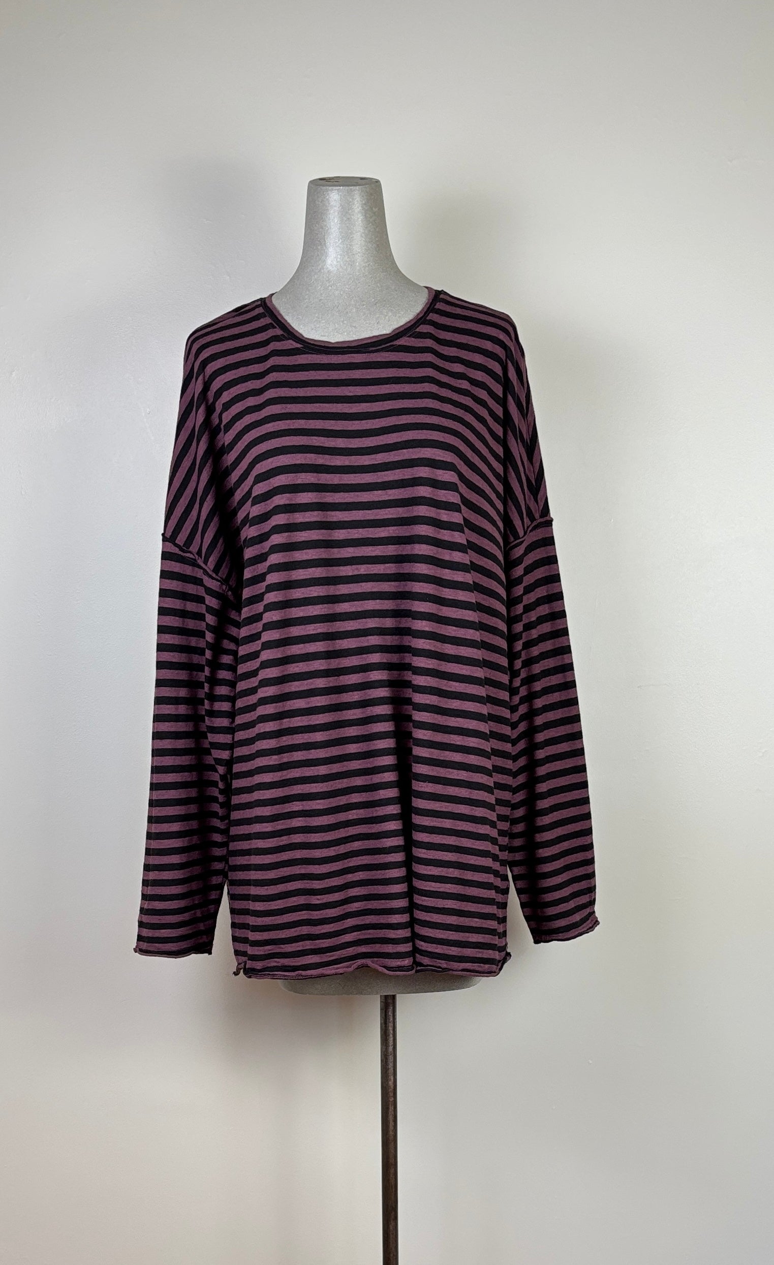 From the black stripe group, an oversized tee shirt with drop shoulders, long sleeves, and rolled raw edges at sleeves and hem. Fit is generous and oversized.