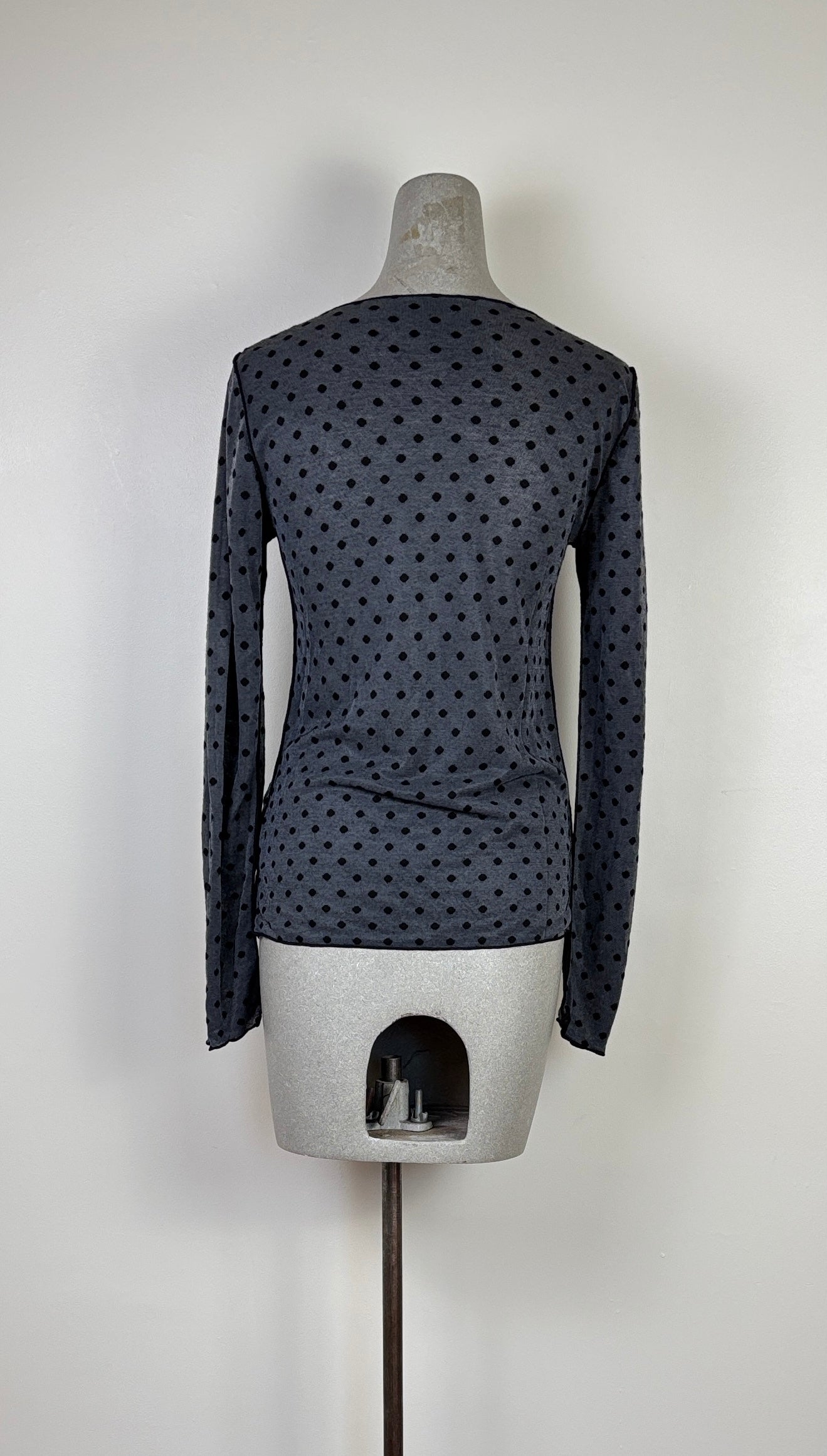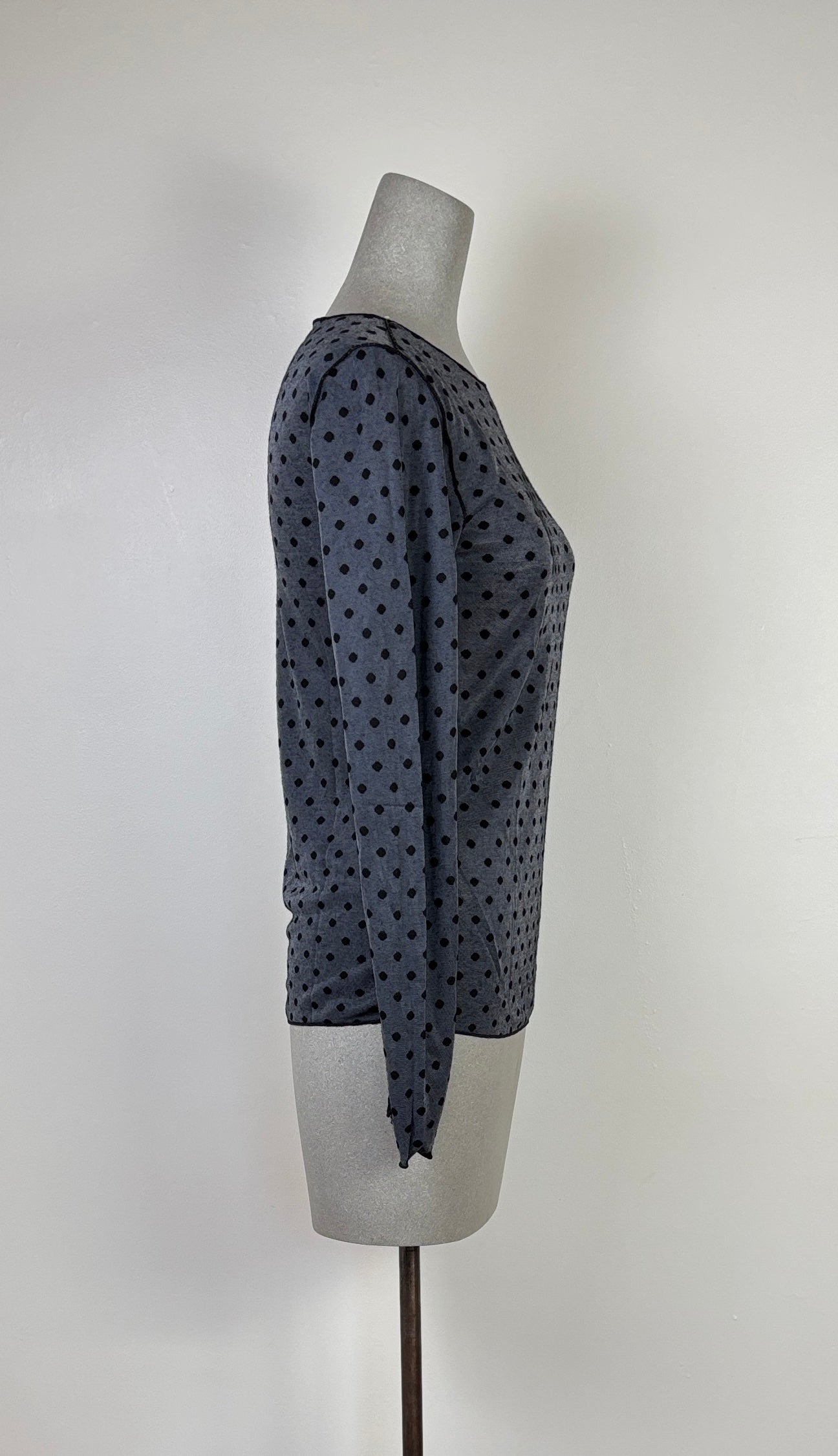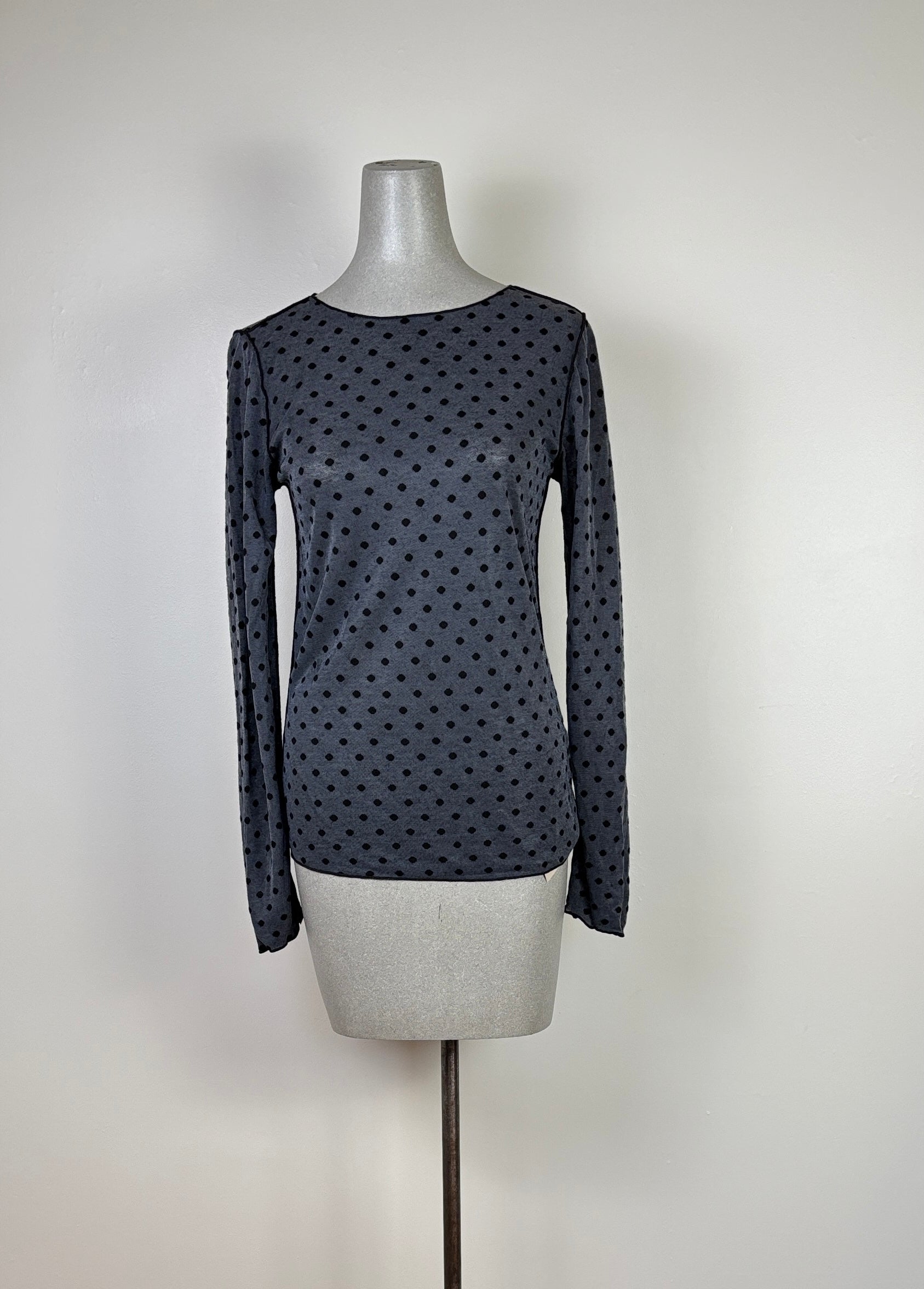 From the mesh dot collection, a long sleeve, round neck, long sleeve tee with pearl edges.
