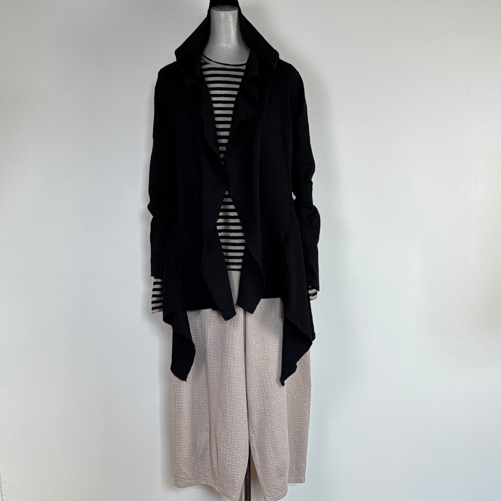 From the puckered double-cloth group, a textured fabric with a thermal feel, this relaxed jacket has an open front that gently cascades, a hood, long sleeves and a swing style asymmetrical hemline.