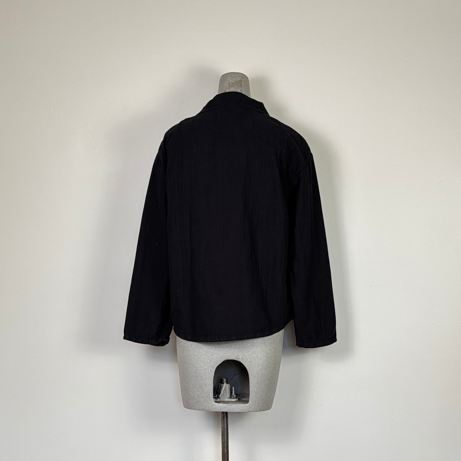 A popover top with a slit open neck with a collar, wrist length sleeves, and boxy body with an angled seam that crosses from shoulder to front right notched hip. Fabric is a heavy cotton gauze.100% cottonColor BlackHand or gentle cycle machine wash in cold water with other dark pieces. Hang dry. Steam as needed.Made in USA