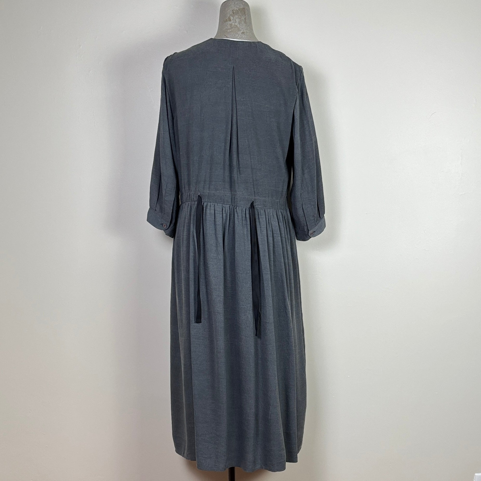 In an elegant viscose/linen fabric, this fully lined dress has a round slit neckline, mid arm sleeves with banded and buttoned cuff, a set waist with a gathered skirt, and side pockets. The back has an inverted pleat and a webbed drawstring at the center back waist.
