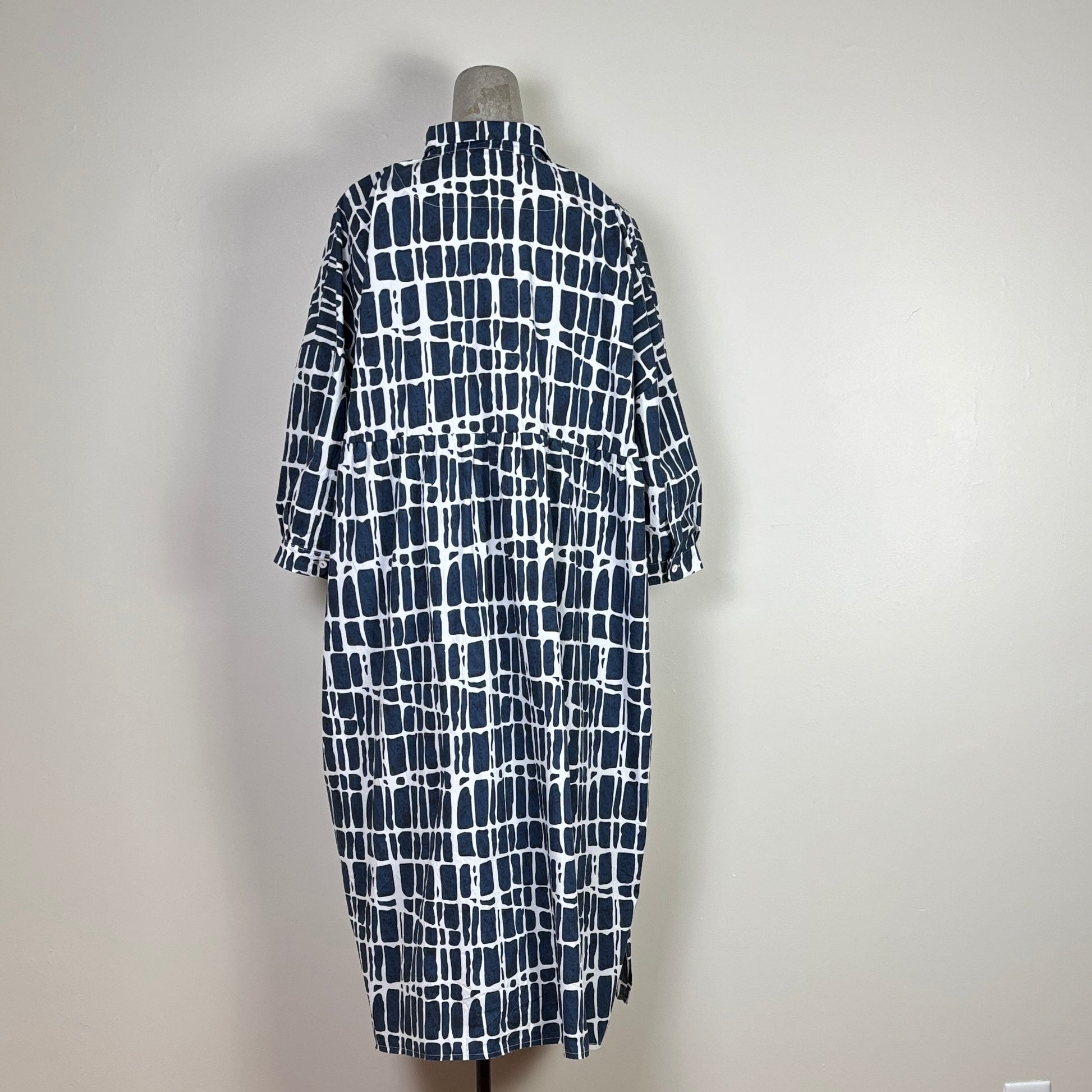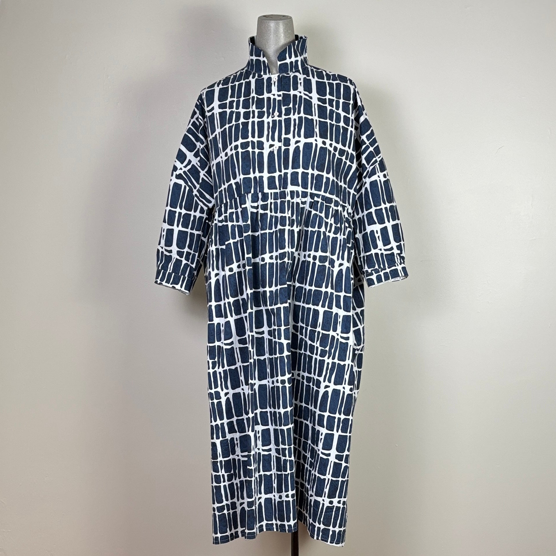 From the printed cotton percale collection, this pop-over style dress has a rounded collar that can stand up, three button front placket, below the elbow length sleeves with button cuffs, a dropped and gathered waist will hit most mid-upper torso, two set in front pockets, and a raw edge hem. Fit is meant to be generous.