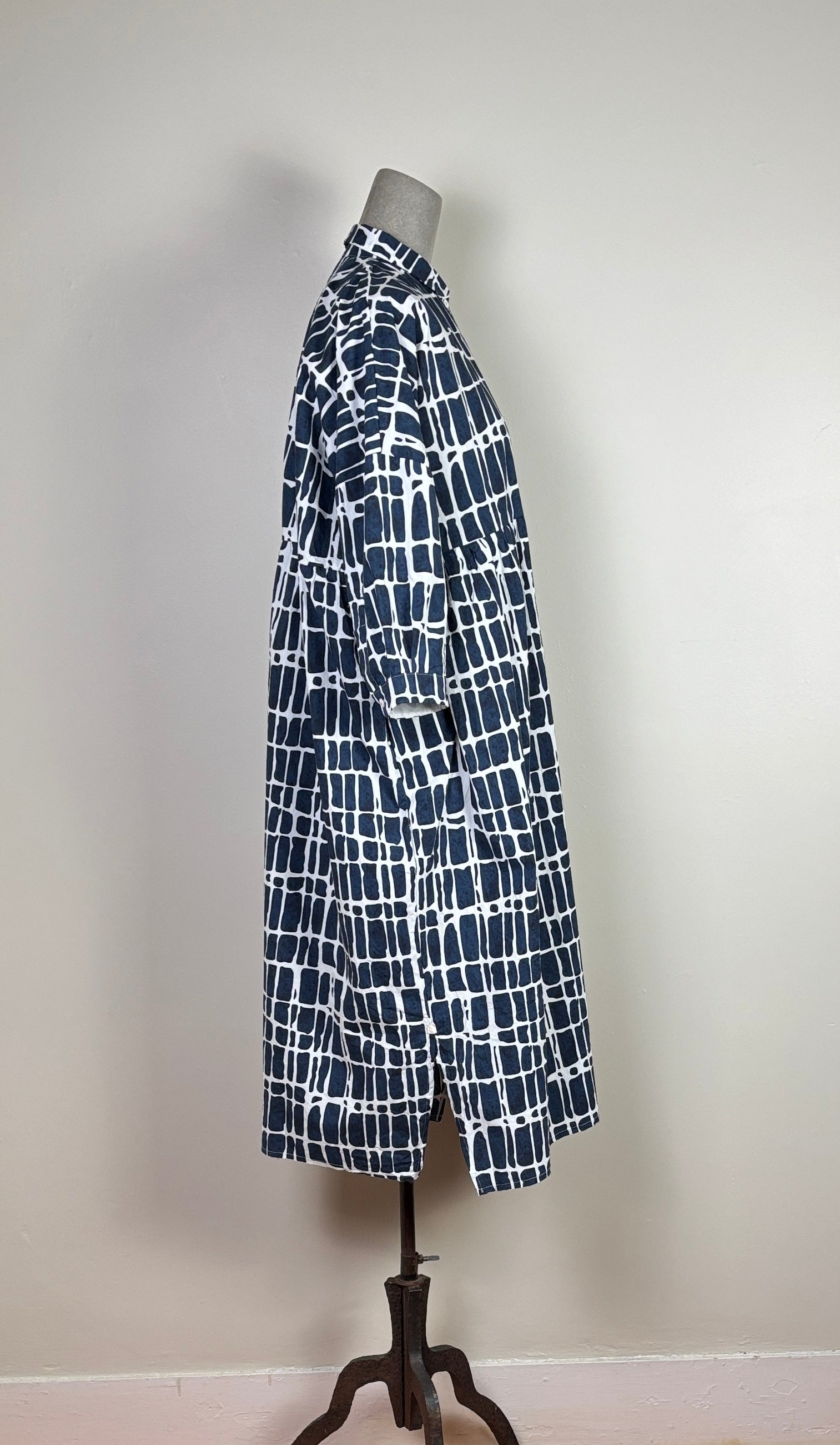 From the printed cotton percale collection, this pop-over style dress has a rounded collar that can stand up, three button front placket, below the elbow length sleeves with button cuffs, a dropped and gathered waist will hit most mid-upper torso, two set in front pockets, and a raw edge hem. Fit is meant to be generous.100% cottonColor Blue CheckGentle cycle machine wash in cold water. Hang to dry,Made in Italy