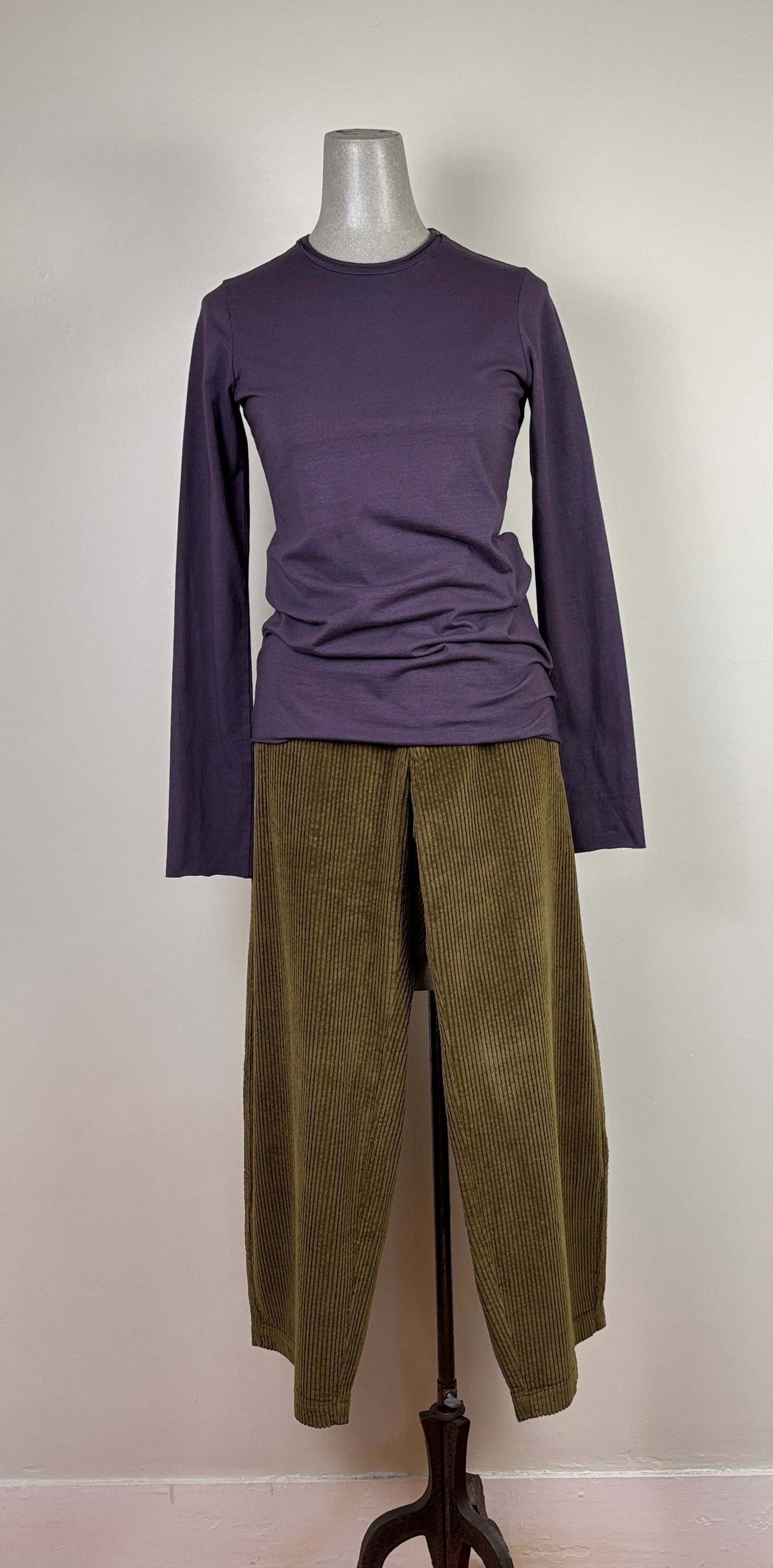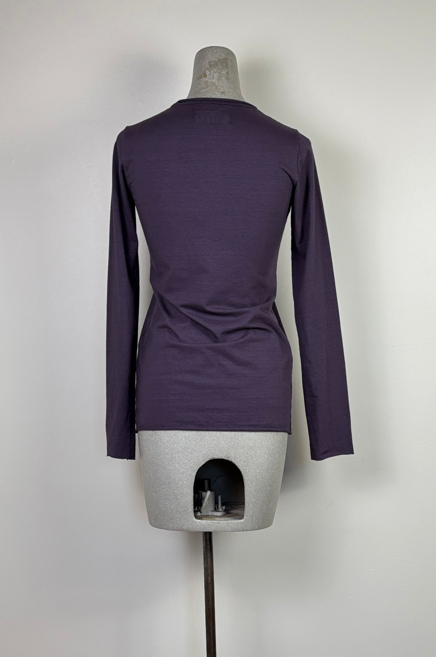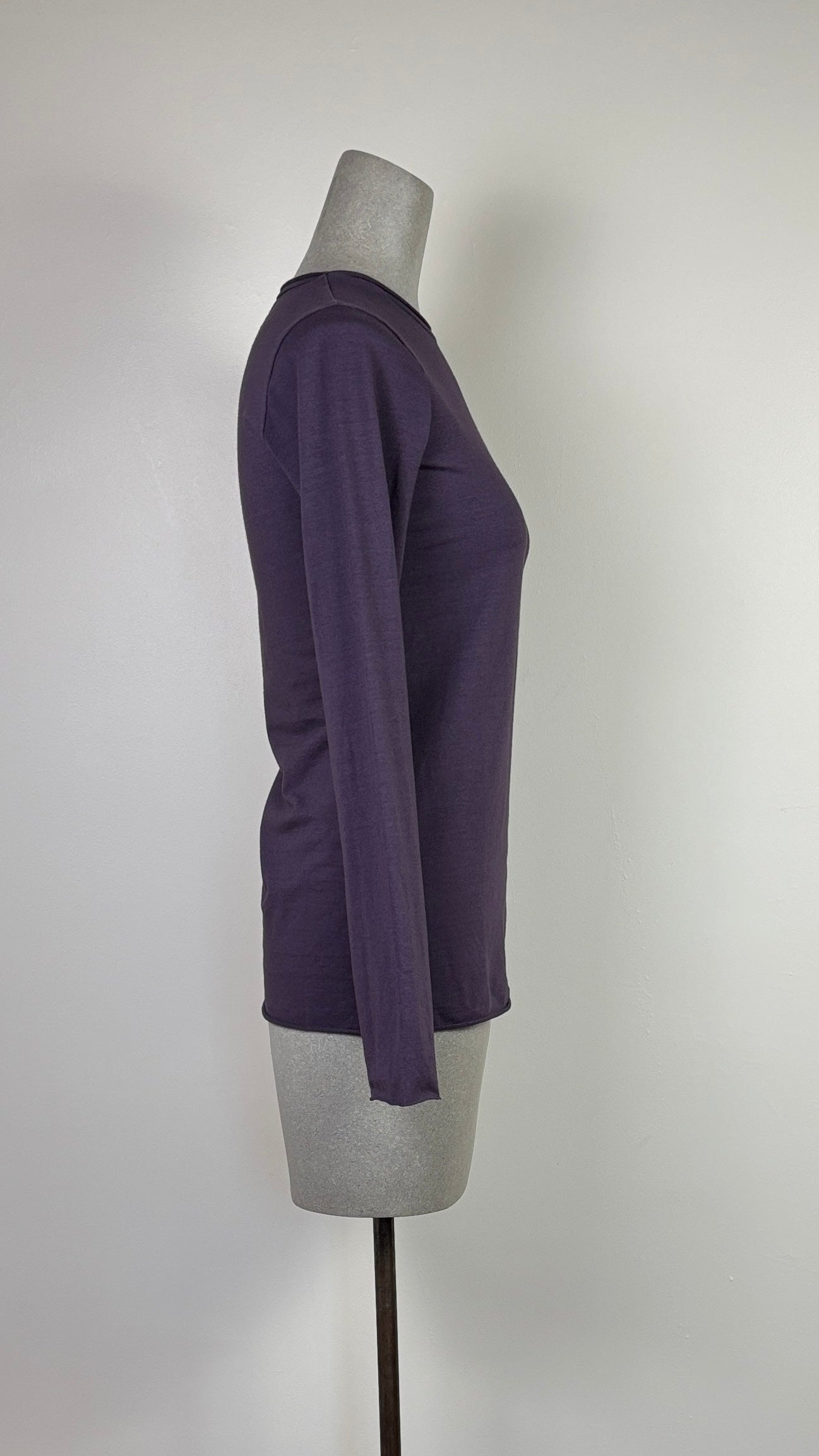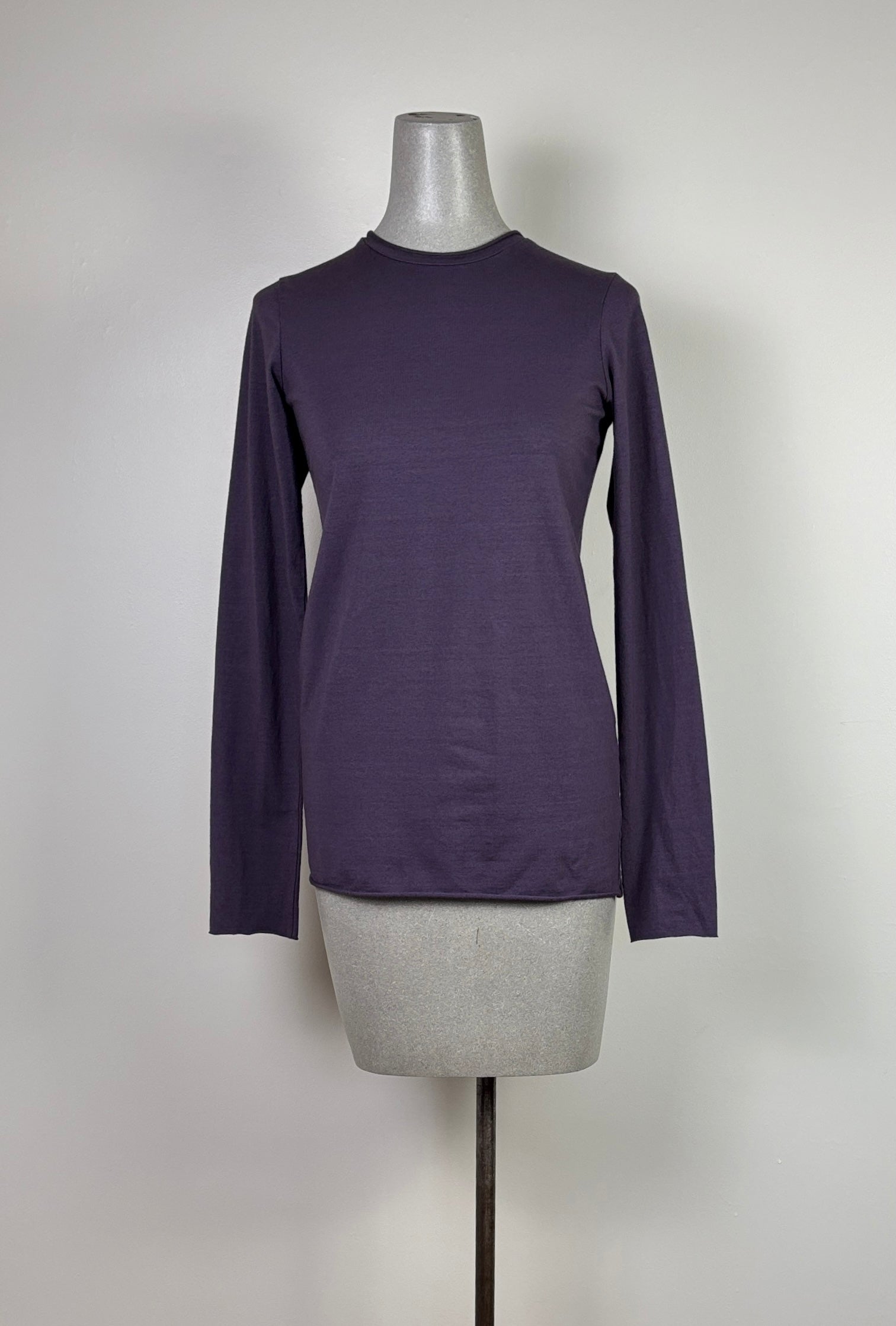 In fabric cocache, a cotton and cashmere blend, a classic round neck top with rolled edges at the neck, sleeves and hem. Fit should be snug. Measurement from center shoulder to hemline on size 0 is 25”