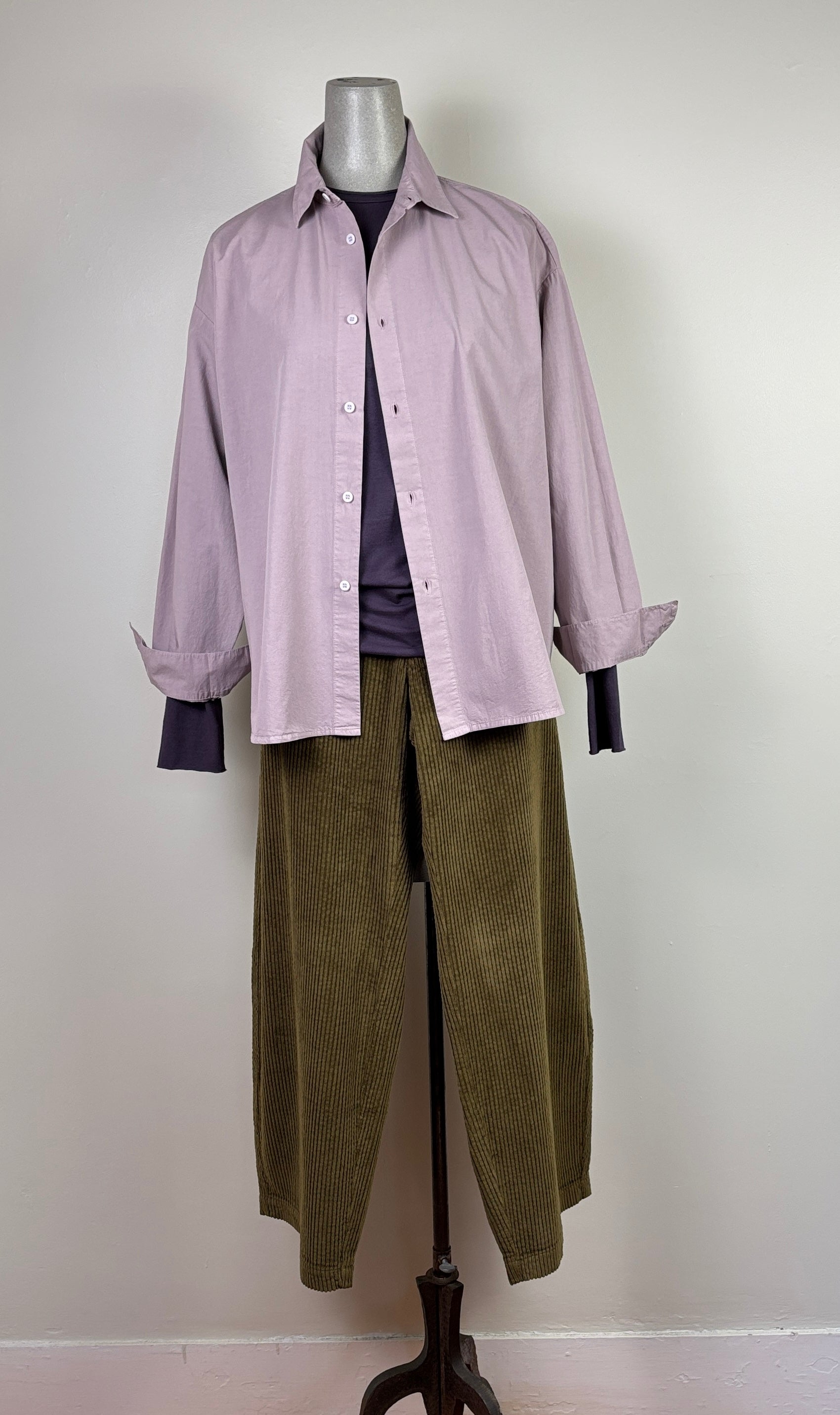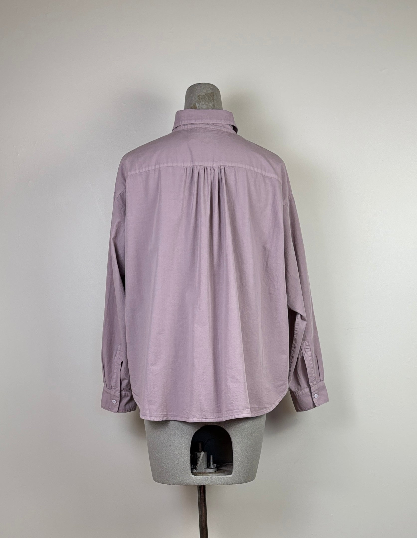 In fabric egitto, a medium weight Egyptian cotton, this front button shirt has a boxy, collar, single button cuff long sleeves, curved hemline and soft gathers at the center back. Fit is relaxed to generous. Measurements on size 0, center shoulder to hem 24”, side seam under arm to side seam under arm laid flat 24”