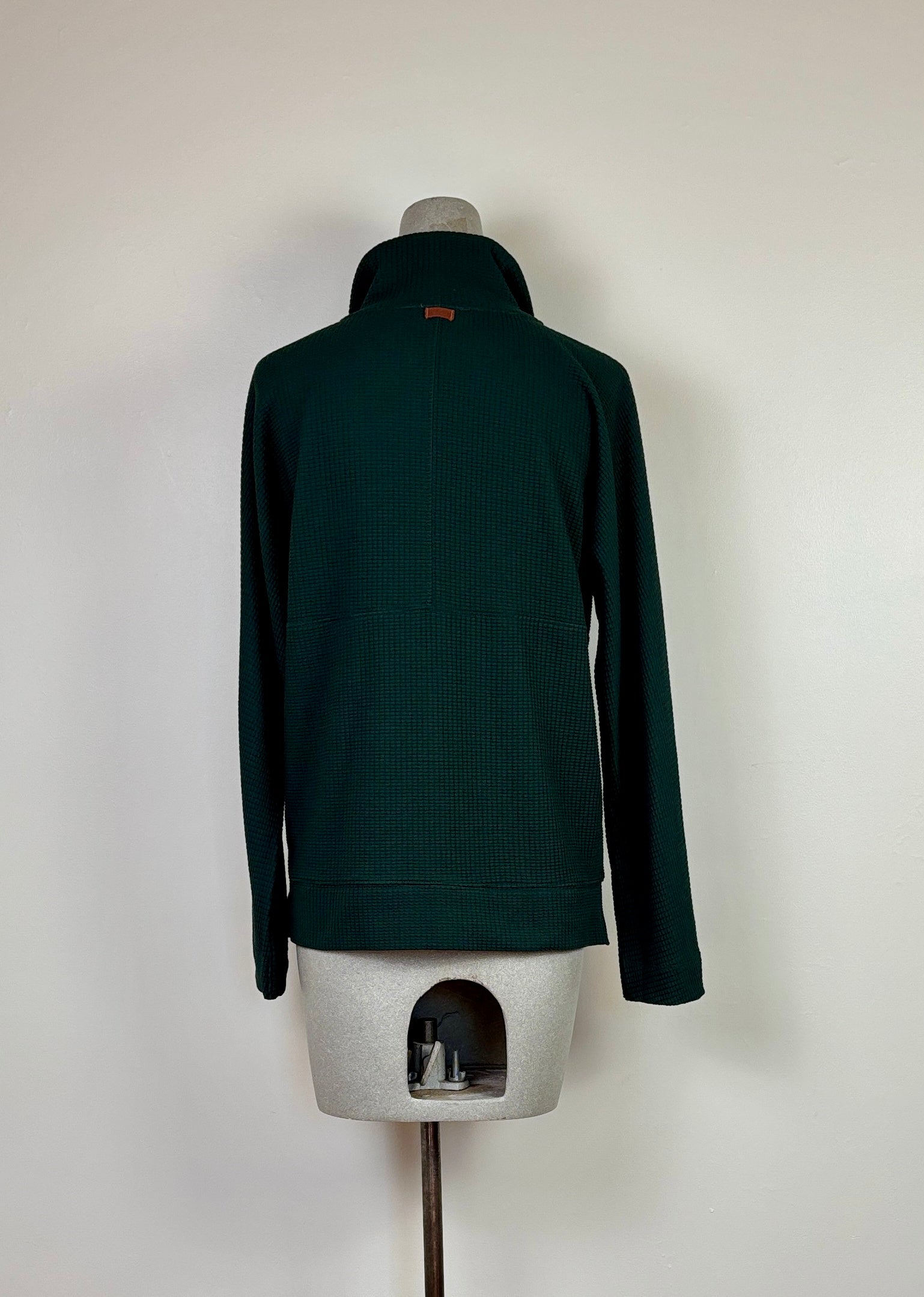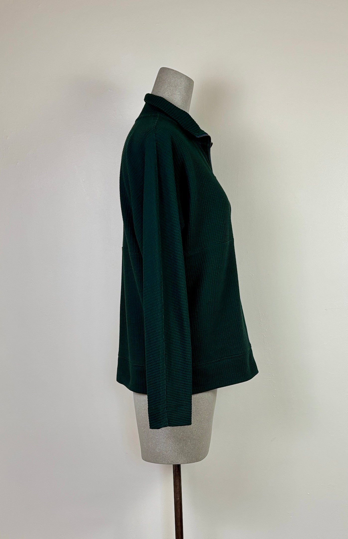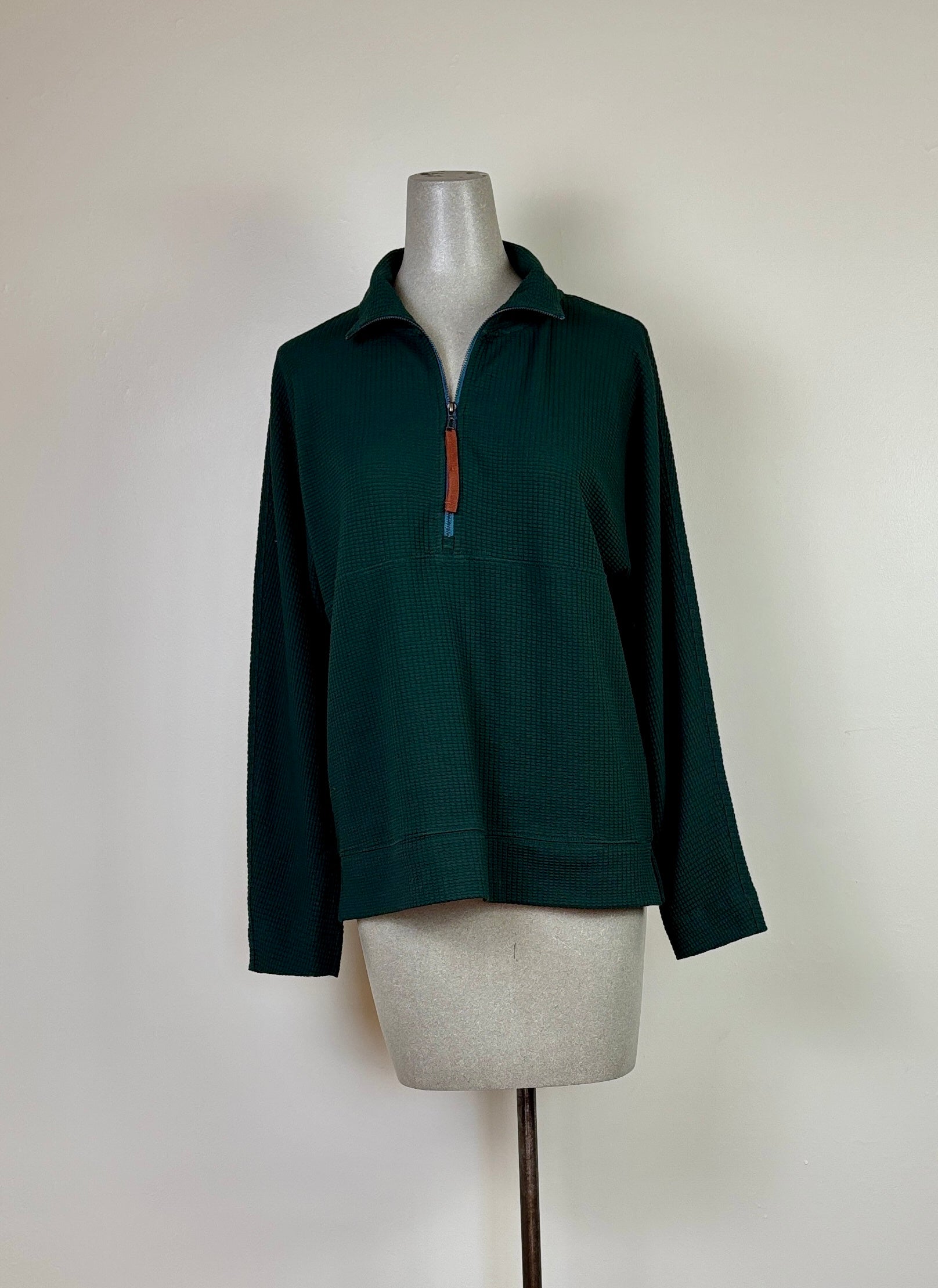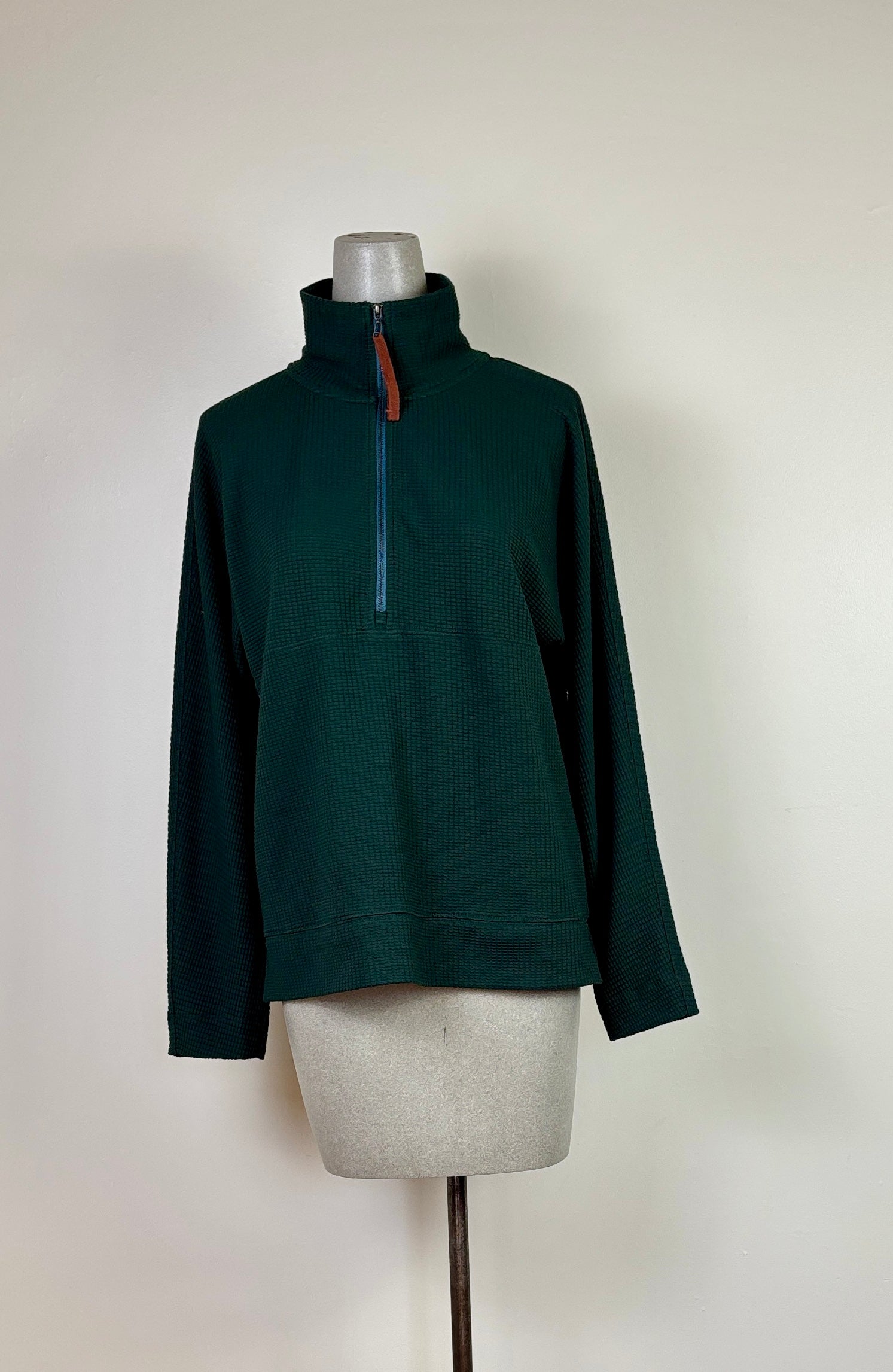 In textured waffle, a half-zip pullover with dropped shoulders and a relaxed fit, longer body length for extra coverage, and intentionally oversized (size down if you prefer less volume)