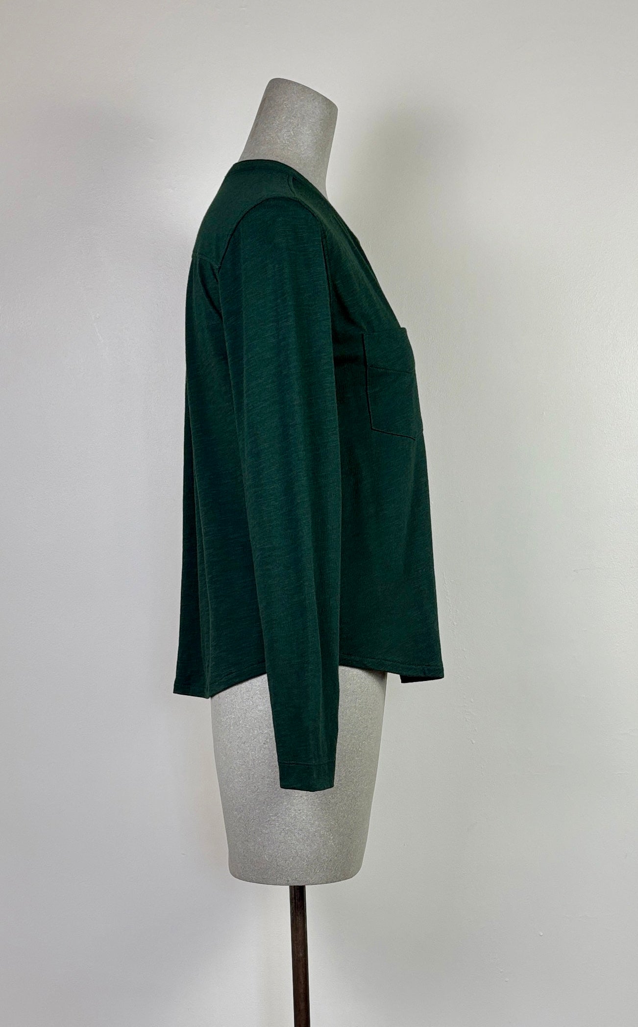 In flame modal, a slub cotton and modal blend with softness and drape, this tee has set-in sleeves and a slightly shaped waist with a fit that skims the body without being too fitted. Like a woven shirt, it has a mandarin collar, button placket, and front pockets, and a back yoke with a box pleat.