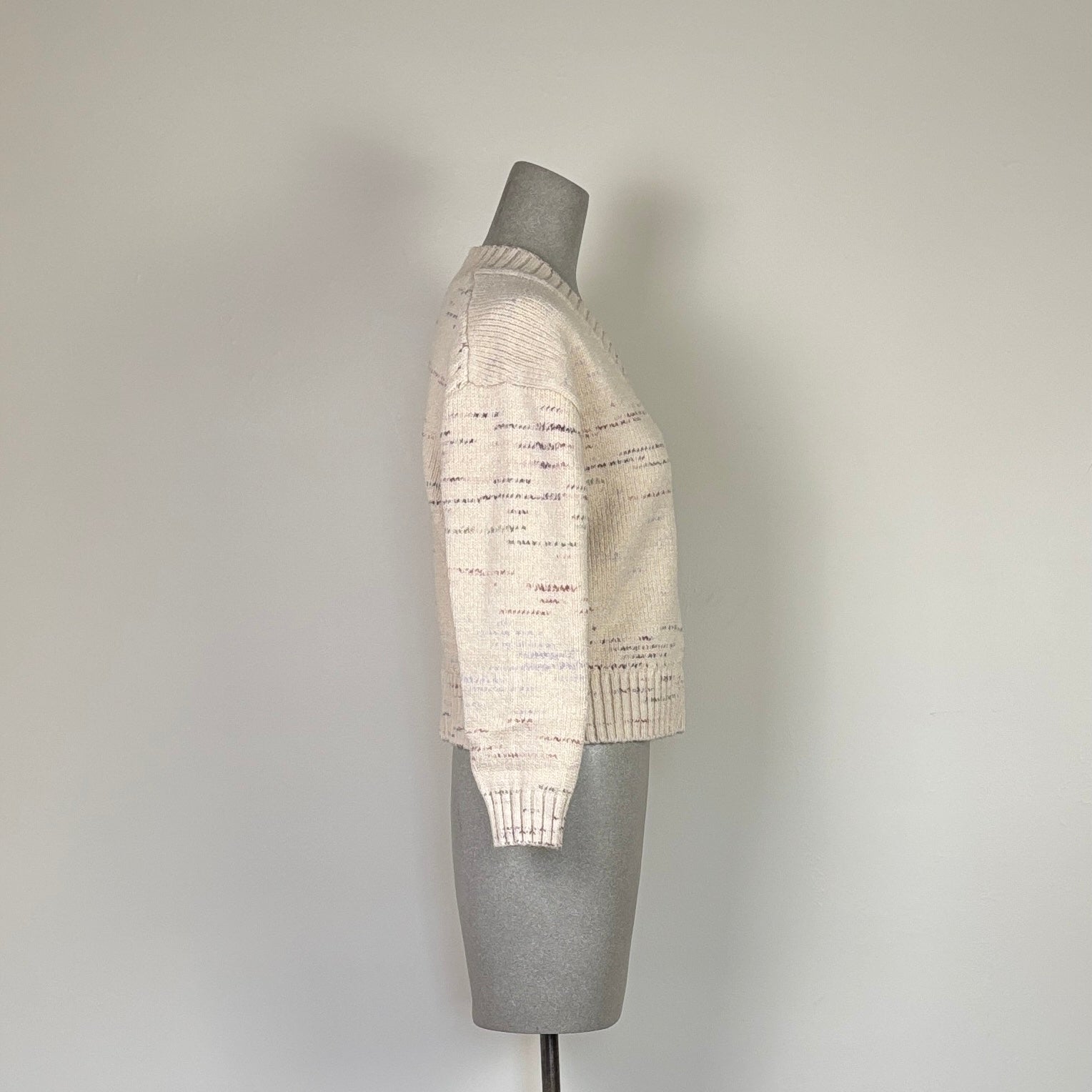 In the space dyed yarn, a super soft and warm knit made mostly of cotton, this yarn offers comfort with a novel space-dye. Designed with a wide rib trim and dropped shoulders, this sweater has a relaxed, oversized fit.75% cotton, 15% polyester, 9% acrylic, 1% spandexColor Eggshell ComboHand wash in cold water and rinse. Lay flat to dry.Made in China