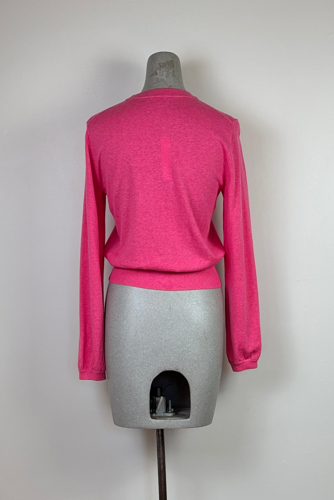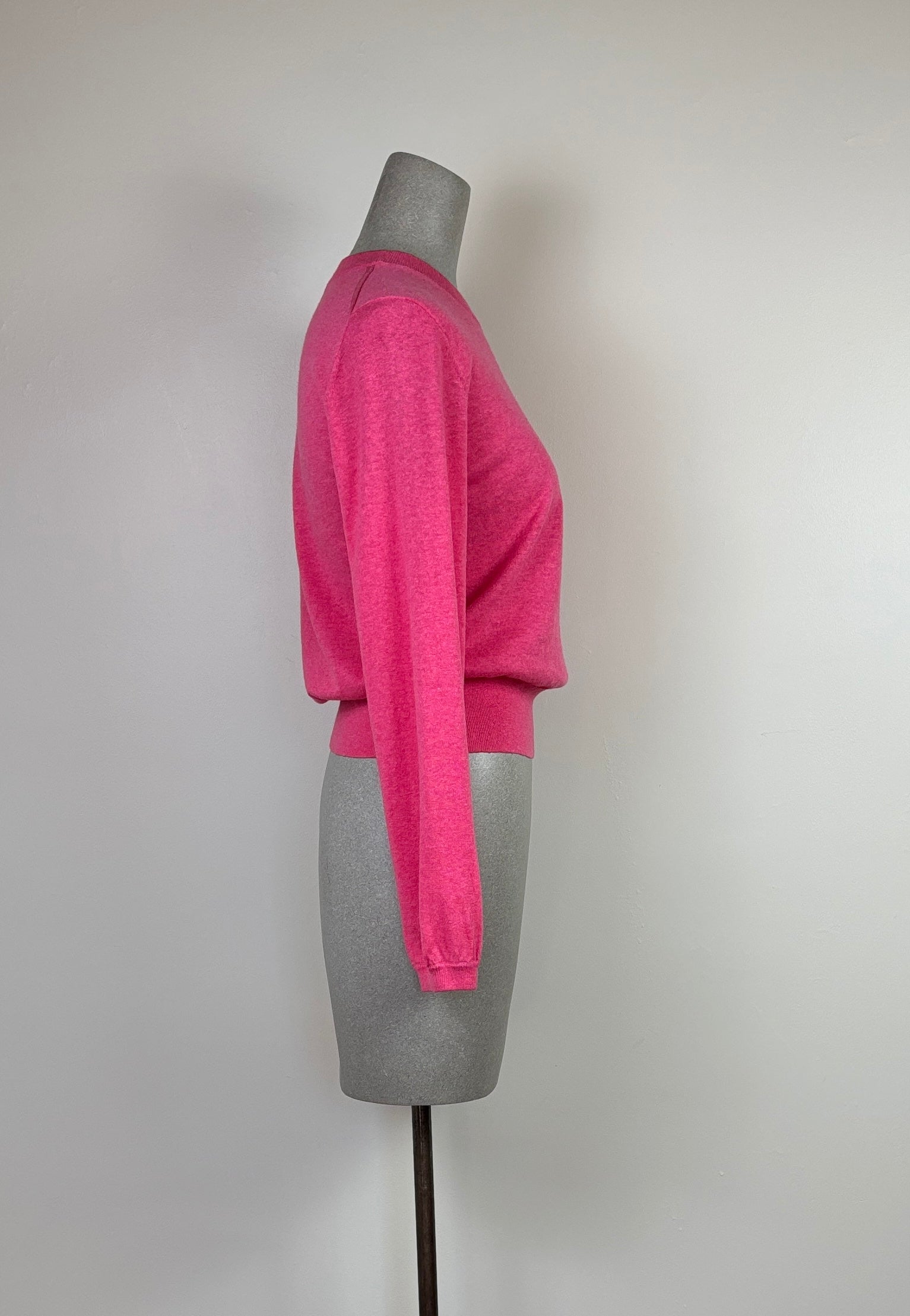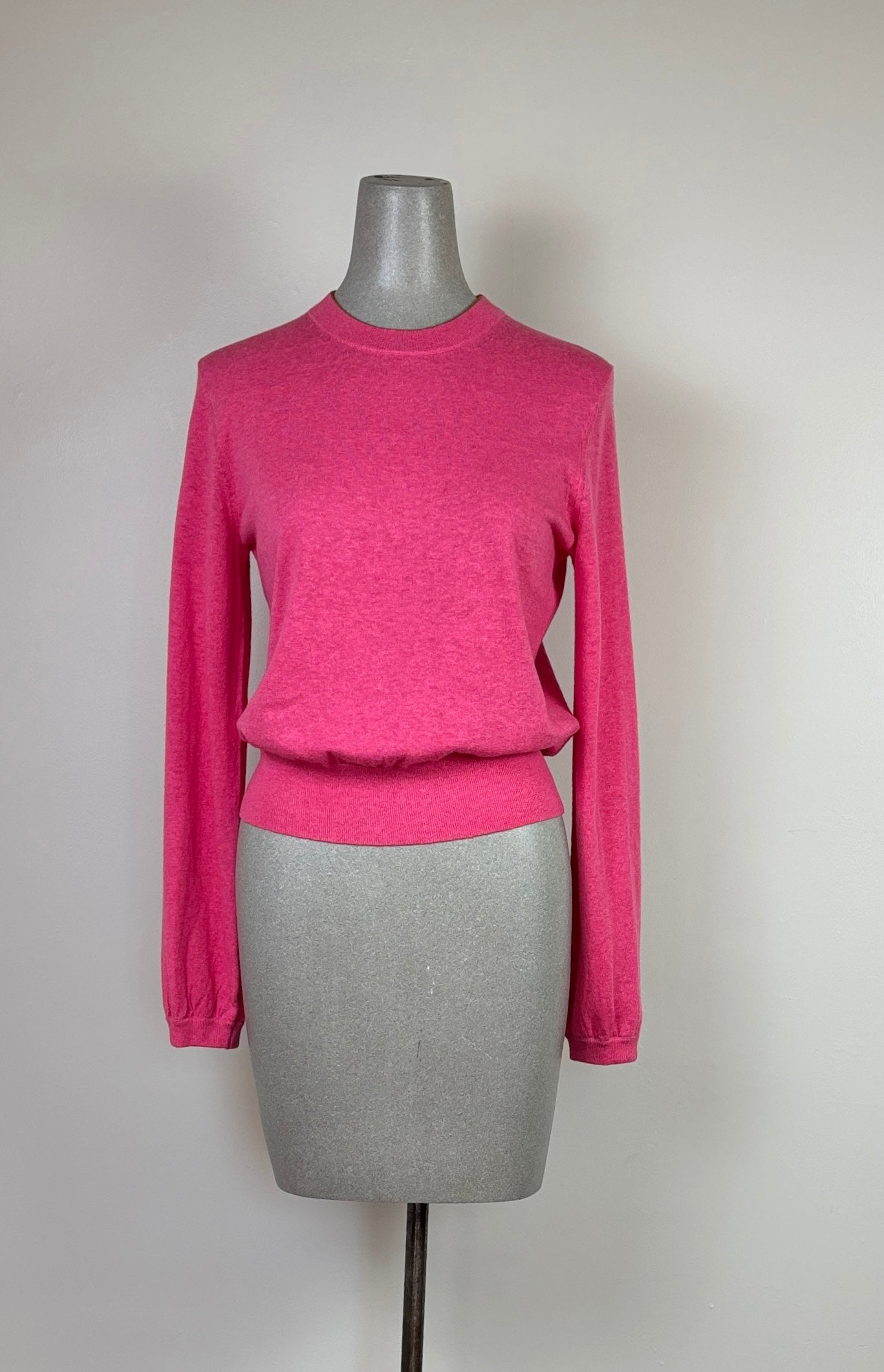 In the fine gauge cotton blend, a lightweight pullover with set in sleeves with a shirred detail at the sleeve opening, a ribbed bottom hem, and contrast trim inside the neckline. This style will skim the body without being too fitted.