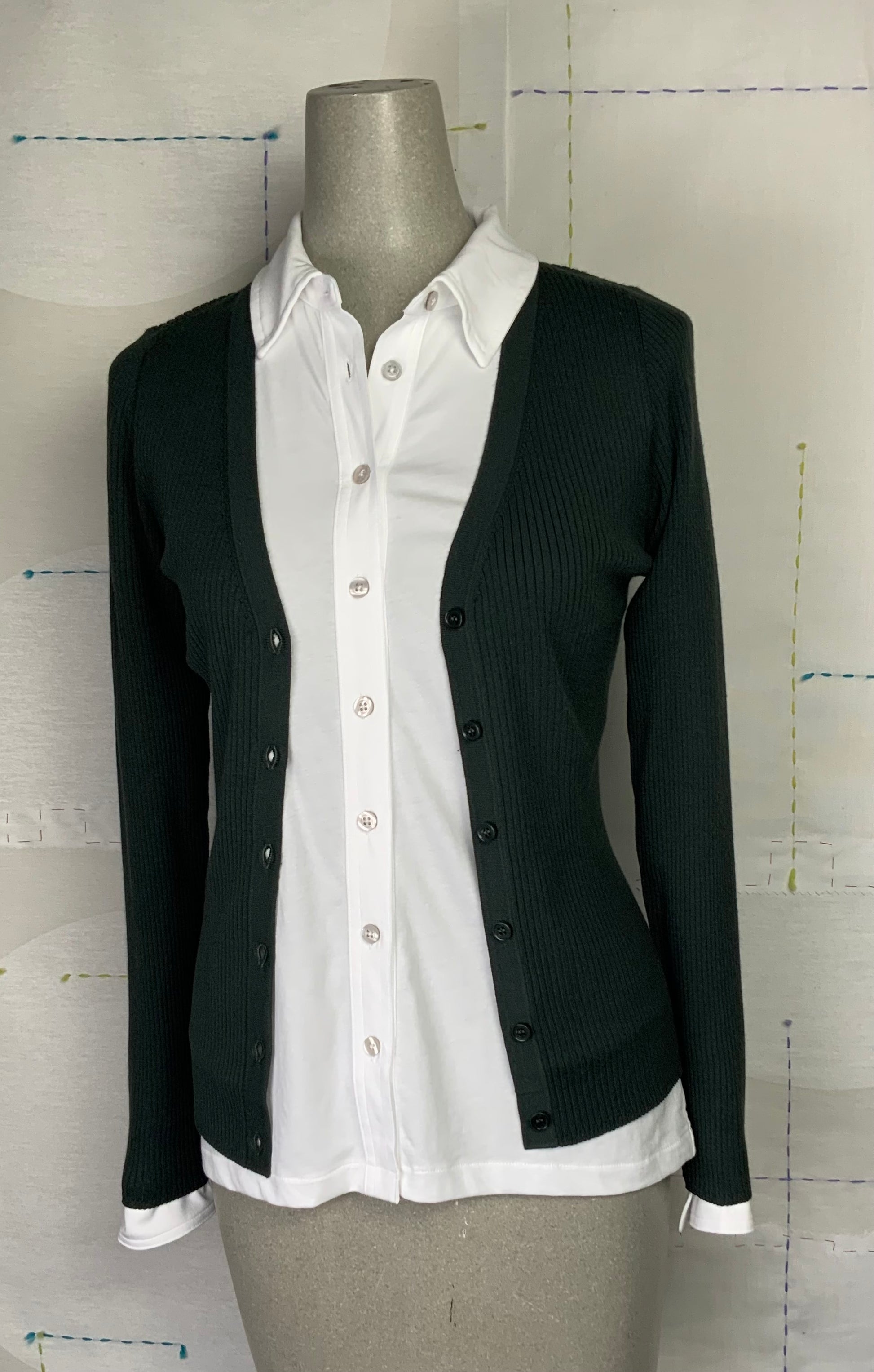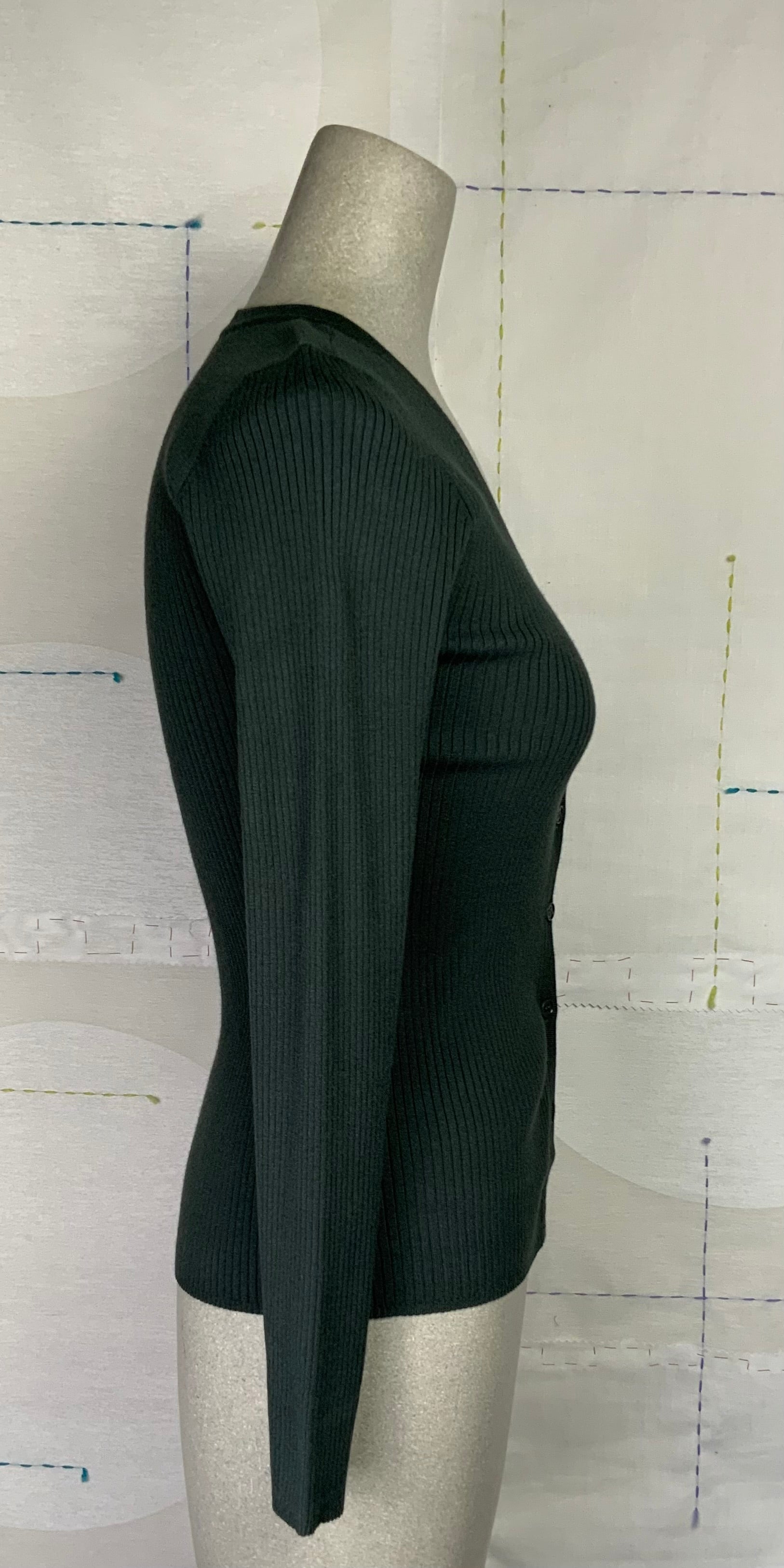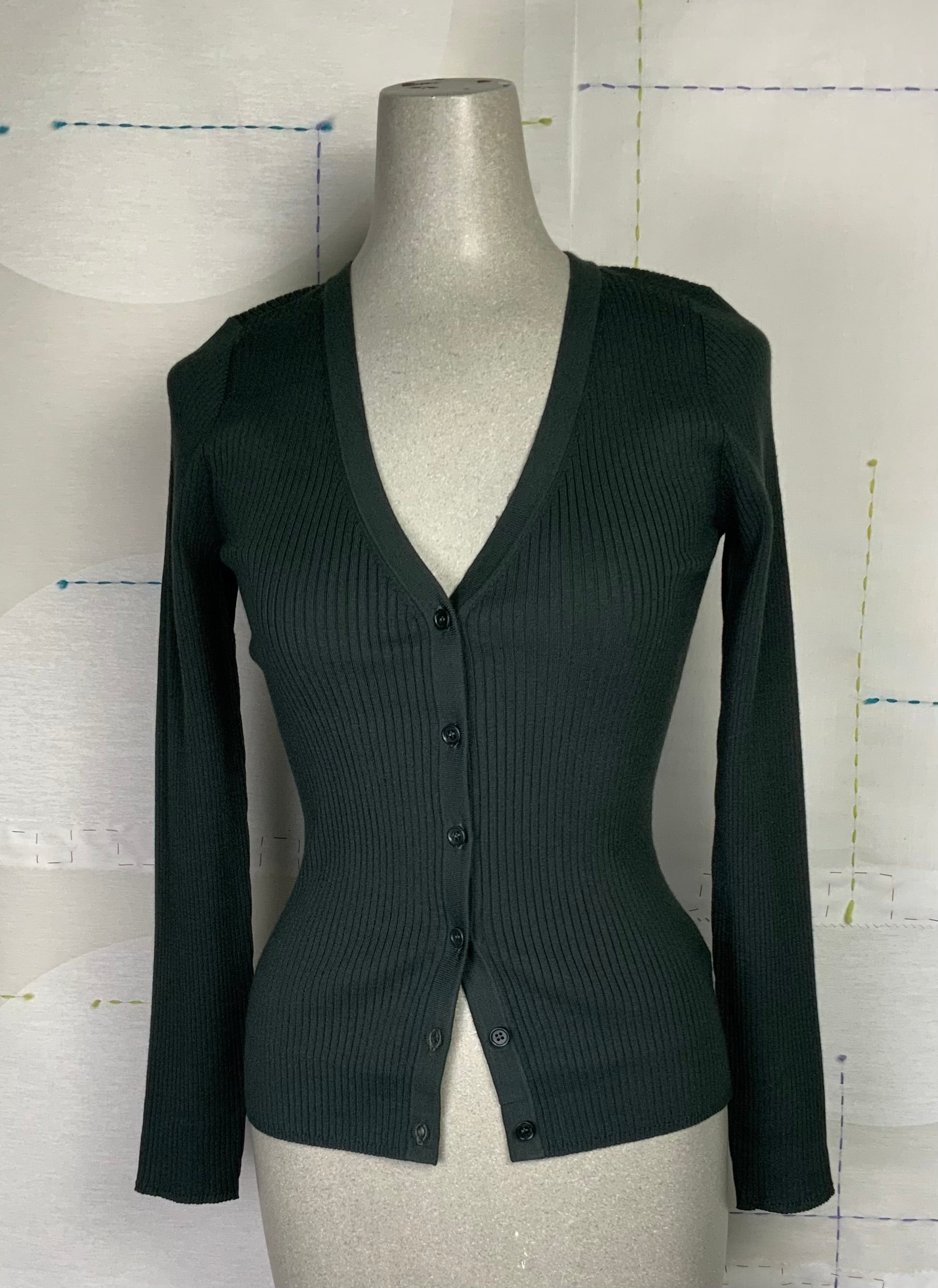 In the fine gauge stretch knit, a classic button front V-neck cardigan with a fitted silhouette Size medium measures 23 1/2” from shoulder to bottom edge.