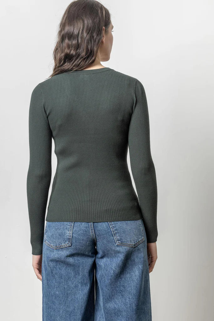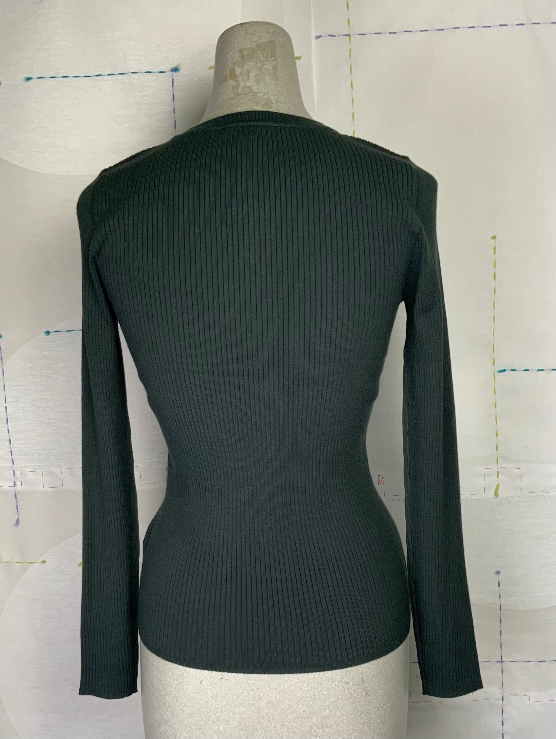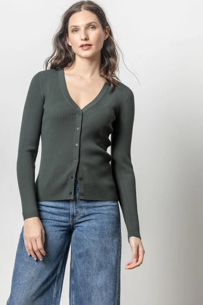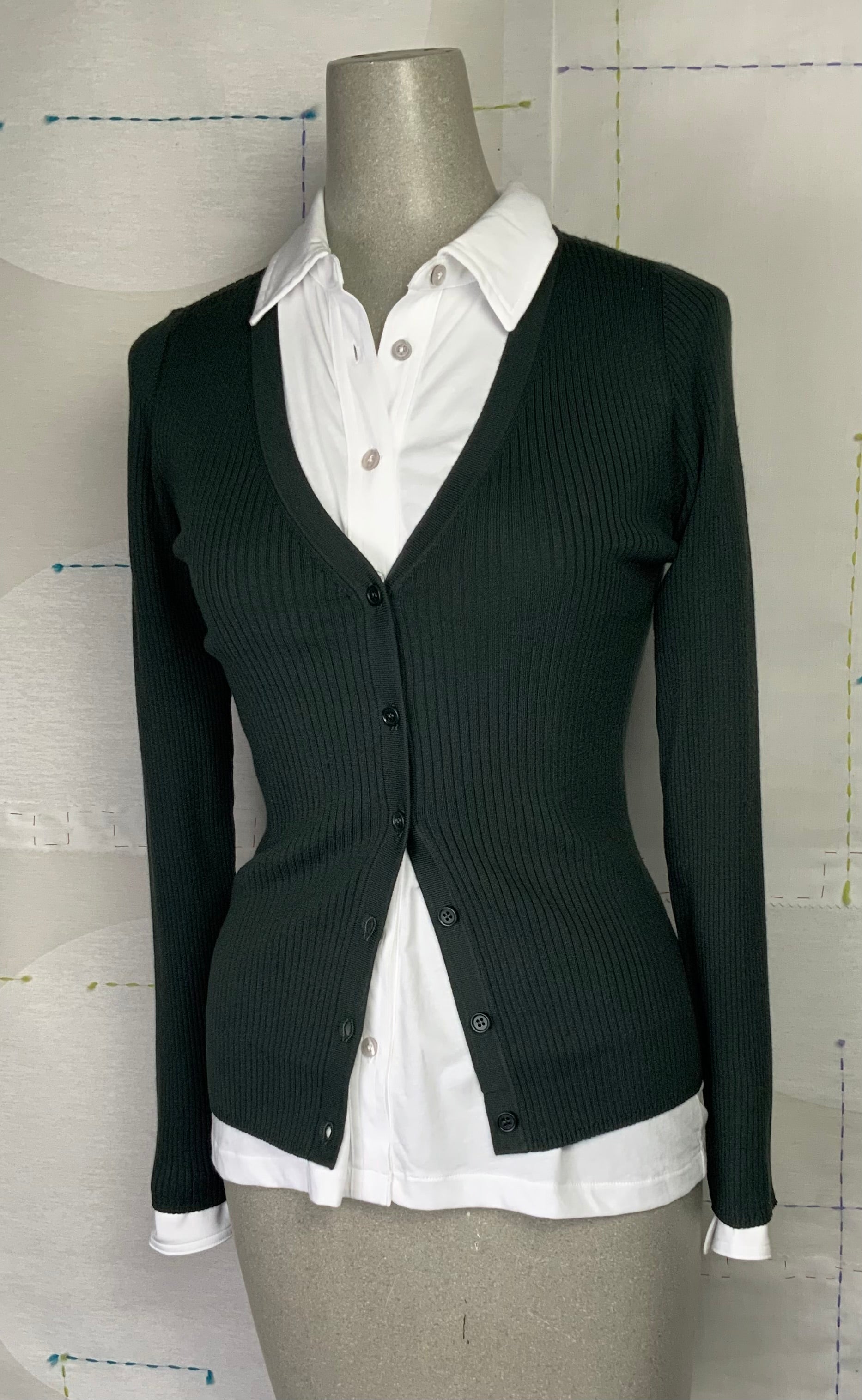 In the fine gauge stretch knit, a classic button front V-neck cardigan with a fitted silhouette Size medium measures 23 1/2” from shoulder to bottom edge.