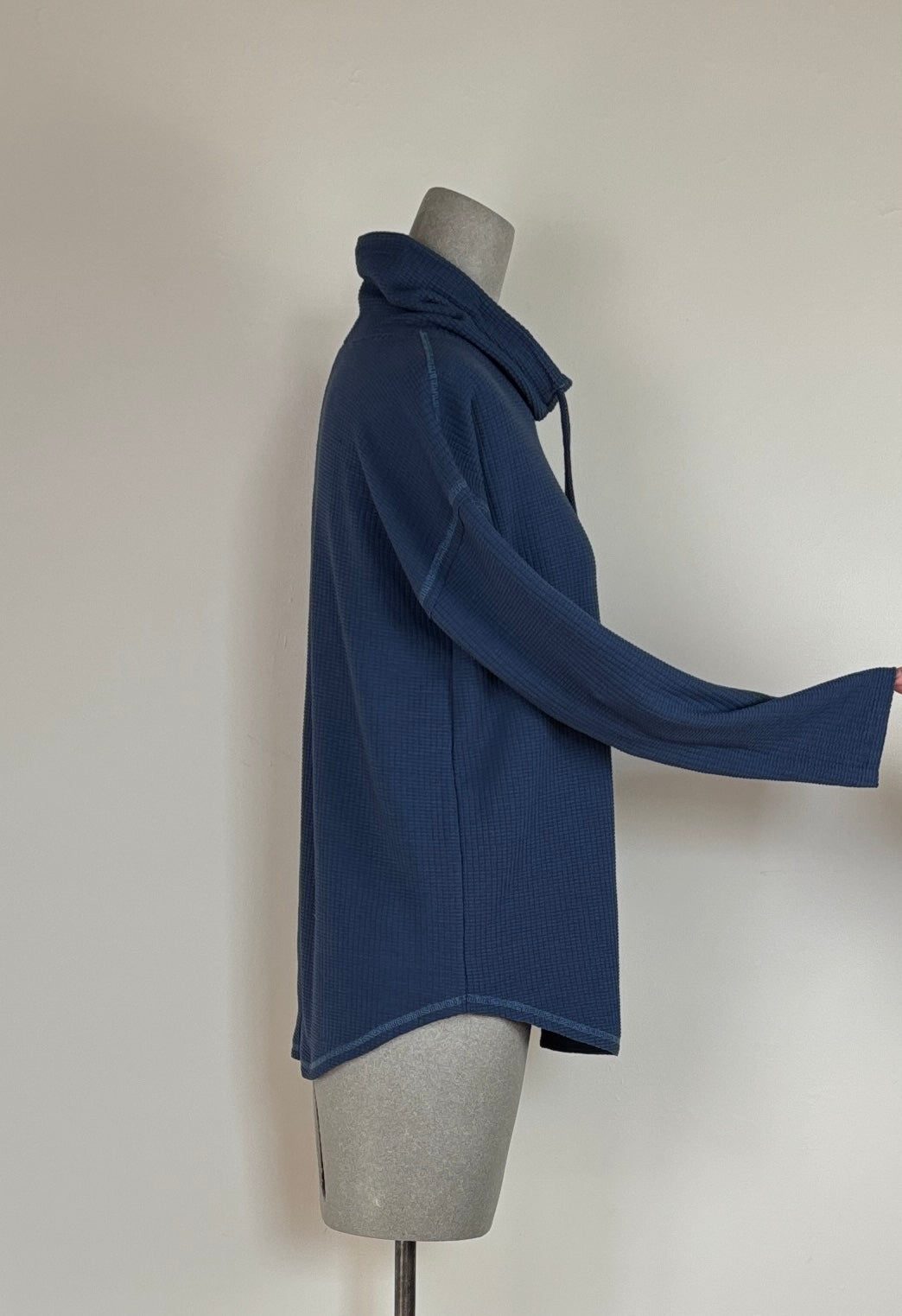 In the coveted textured waffle with a touch of stretch, this top has a loose, scrunchy mock neck with an adjustable drawcord. Designed with a longer length and rounded hem, the fit is easy and relaxed.