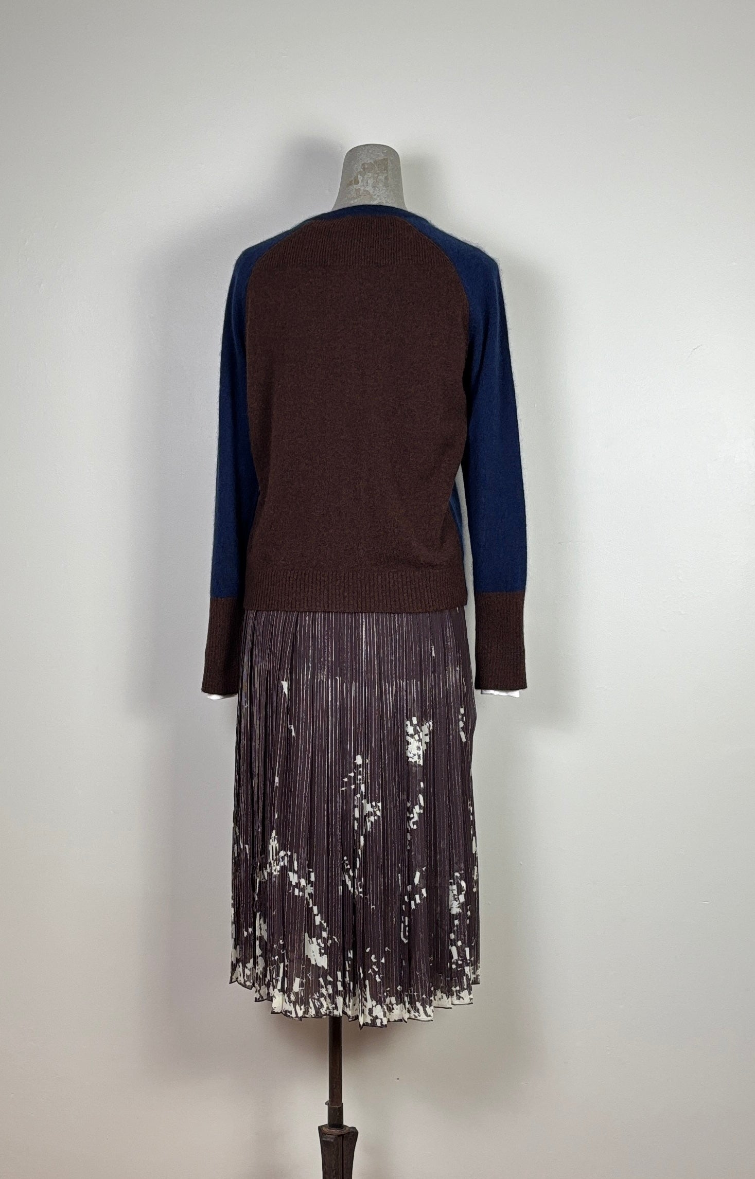 A lightweight cashmere and silk with a ribbed shoulder and back yolk details with generous ribbed sleeve cuffs, this sweater is straight through the body and hits at the mid hip. The front is a dark sapphire blue and the deep ribbed cuffs and back are brown.75% cashmere, 25% silkColor Sapphire ComboHand or delicate cycle machine wash in cold water (maintain cold temp!). Lay flat to dryMade in Nepal