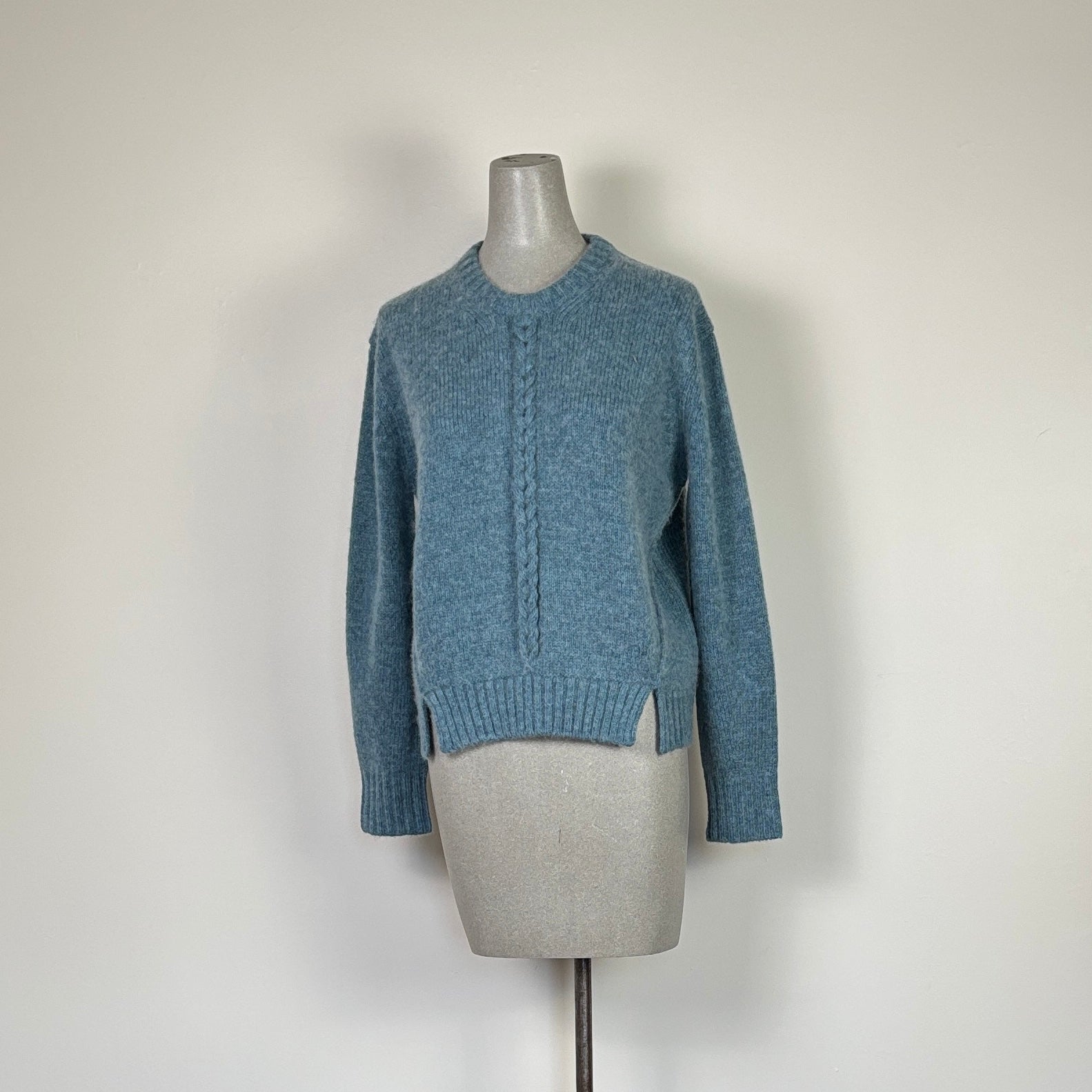 An oversized and cozy merino cashmere sweater with a cable braid detail down the front center. Forward reversed linked side seams that end in slit openings. Ribbed neck, cuffs, and hem. Fully fashioned sleeves.82% merino wool, 18% cashmereColor MineralEco dry clean onlyMade in Nepal in a small, family owned factory