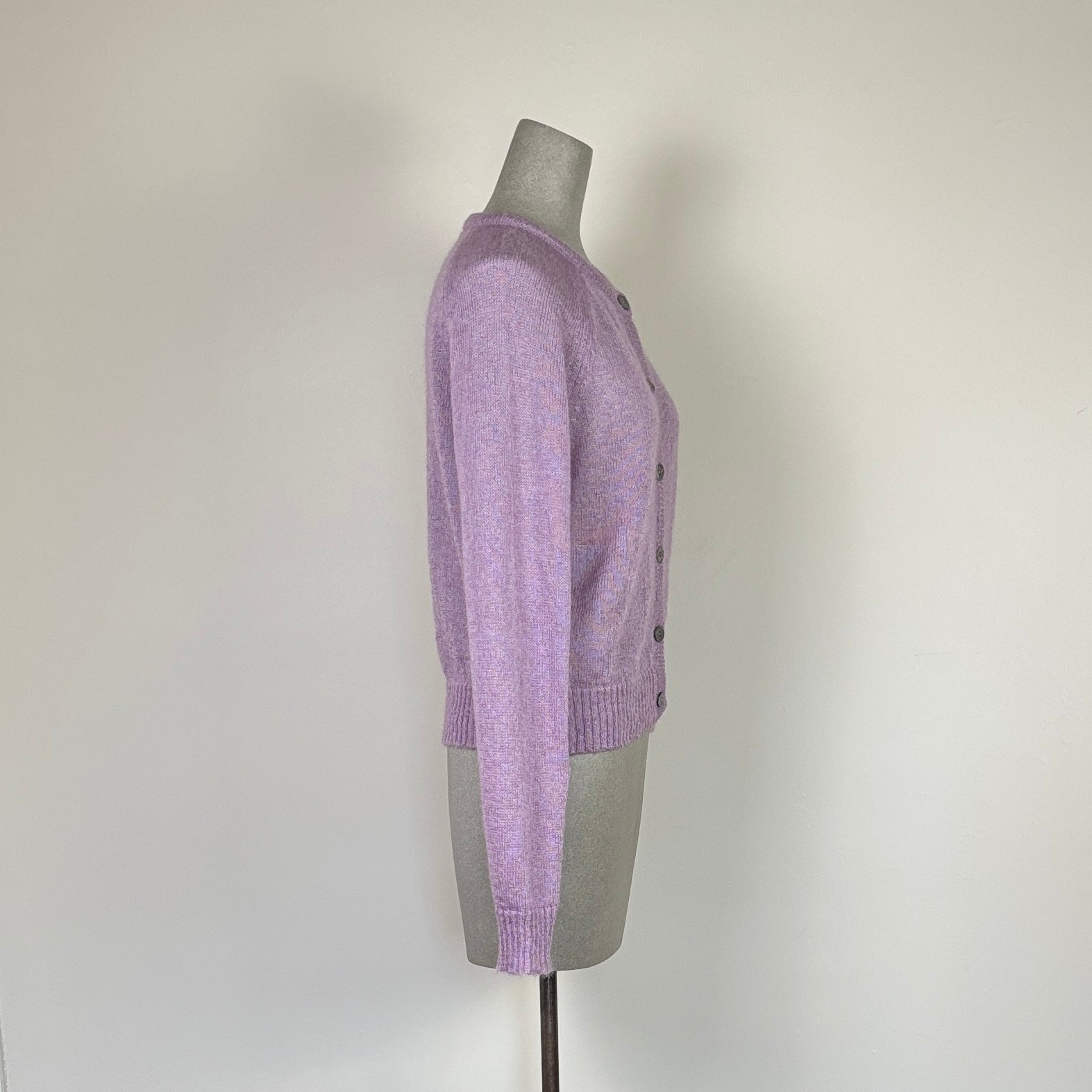 Cardigans-Yarn from italy / Knitted in Bulgaria-73% Super kid mohair RMS, 27% SilkThis cardigan has a loose, relaxed fit, dropped shoulders, and finely ribbed crewneck, cuffs, and hem. An airy knit brushed yarn made from a soft and lustrous blend of kid mohair and silk. Only mohair from carefully selected farms in South Africa and silk from China that is traceability certified. The spinning mill also follows the GOTS regulation of a low environmental impact production cycle. The yarn is hank dyed and brushed which makes it very lustrous, light and soft.73% super kid mohair RMS, 27% silk from ItalyColor LilacHand wash in cold water with mild detergent. Rinse in cold water. Block and lay flat to dry.Made in Bulgaria