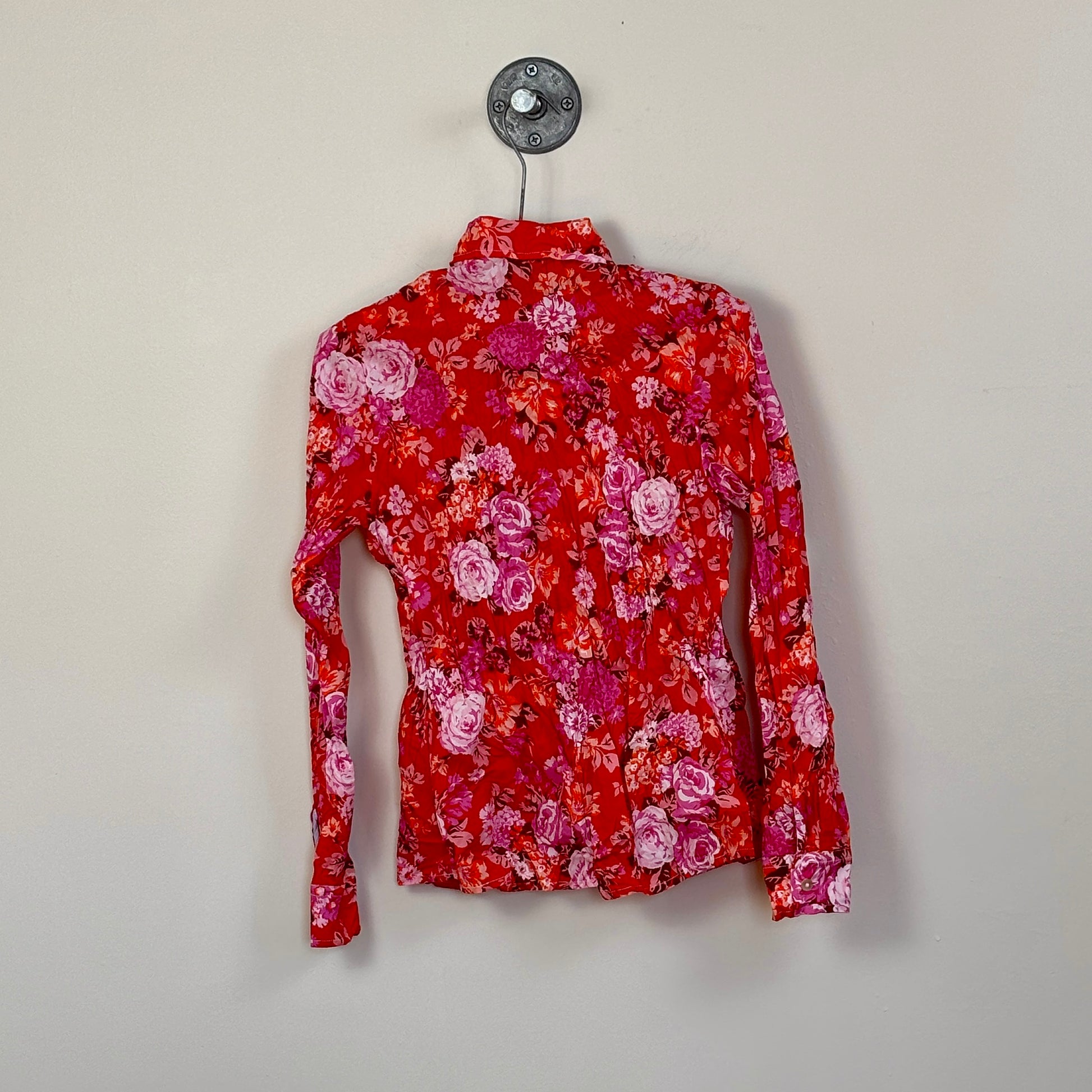 In a Liberty of London print, a classic button front shirt with collar and button cuffs. Twisted and crinkled for texture. May be pressed or steamed for a more relaxed fit.