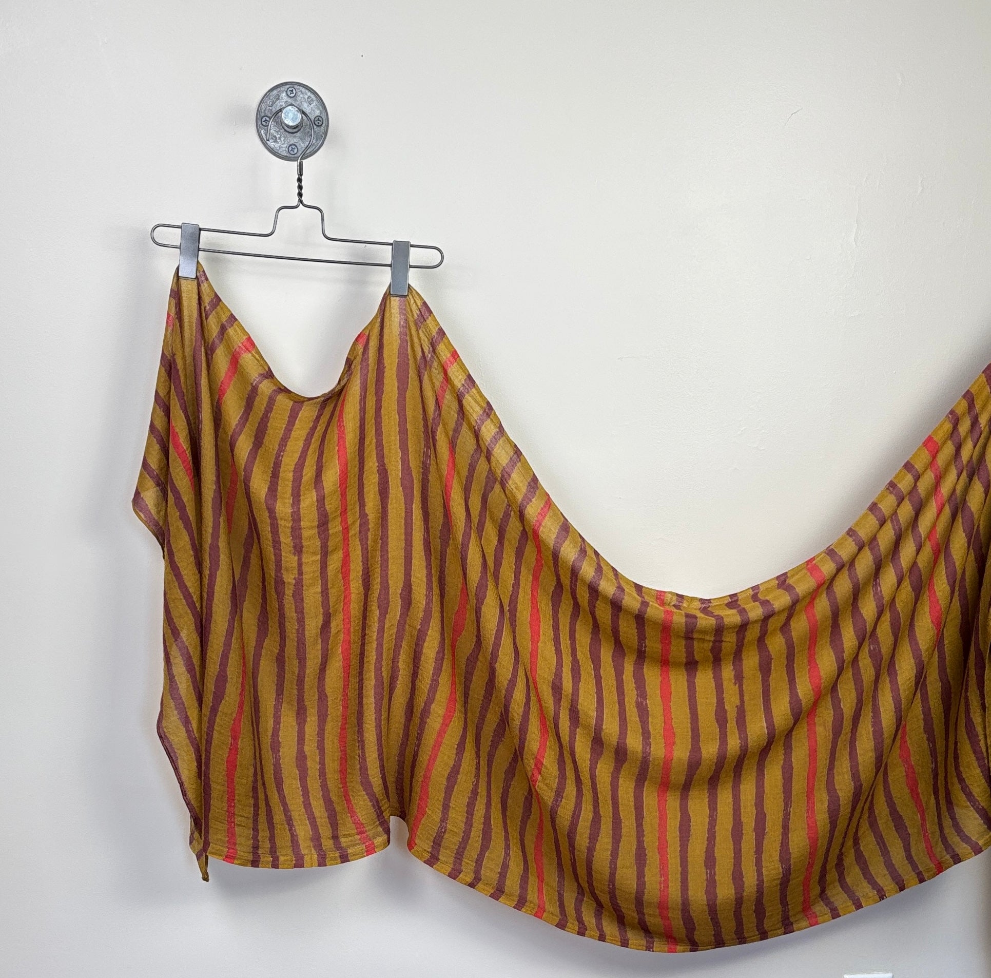 100% wool scarfColor Gold/Purple stripesDry clean recommendedMade in India29” x 83”