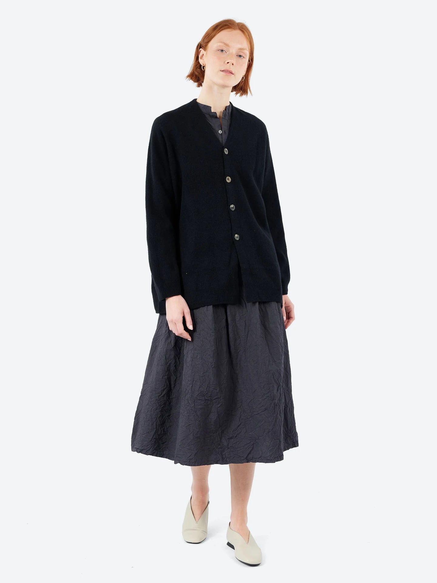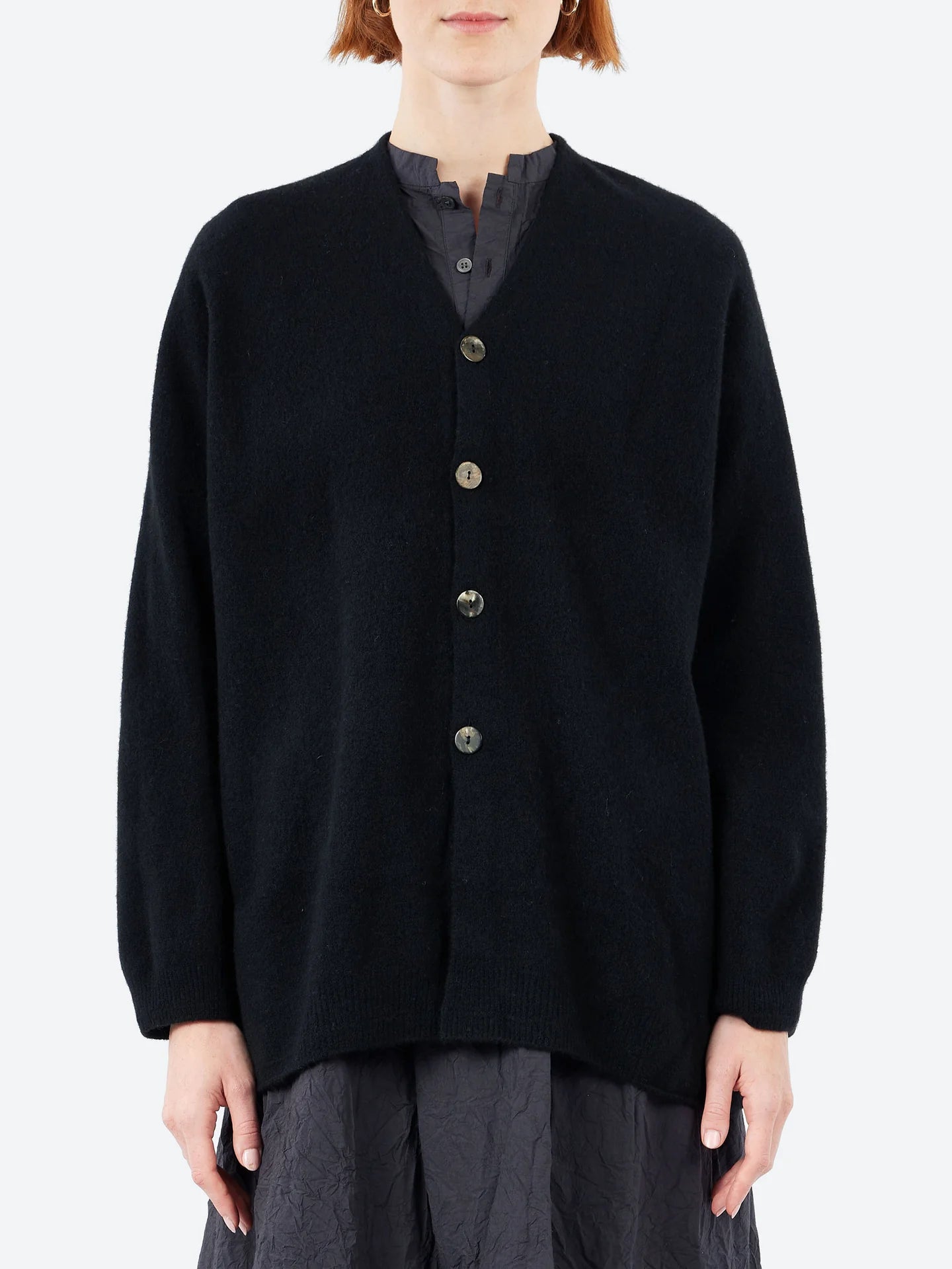 Crafted from fine wool, this lightweight knit cardigan has a refined drape and exceptional softness. Designed with a classic V-neckline and a relaxed silhouette, subtle ribbing at the cuffs, hem, and placket, tonal button front, dropped shoulders.100% woolColor BlackDry clean recommendedMade in Japan