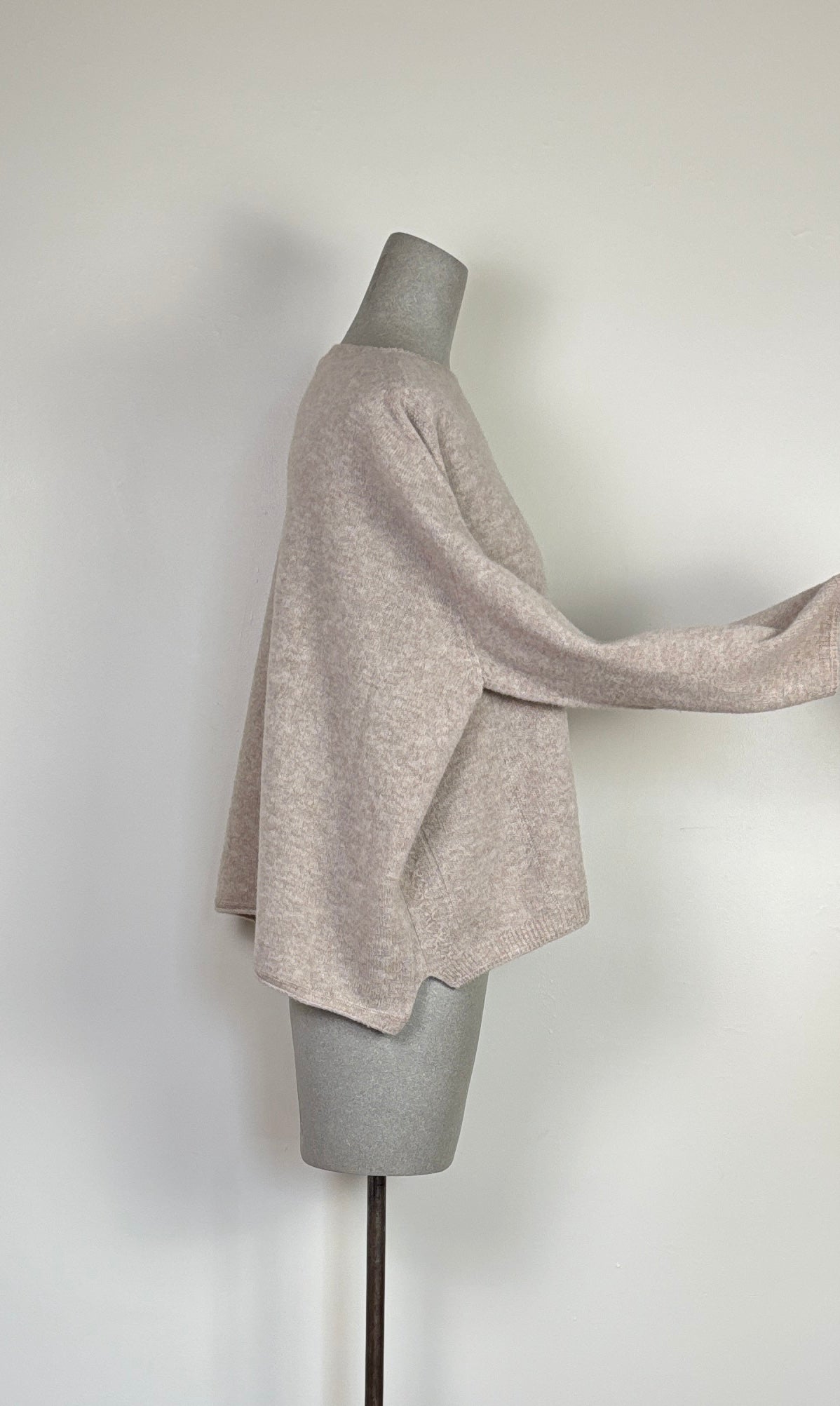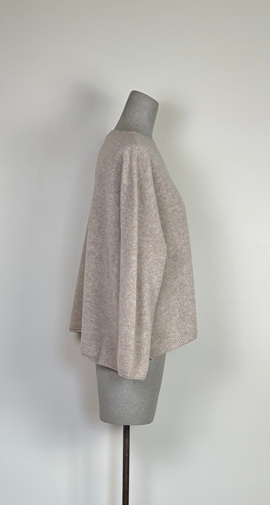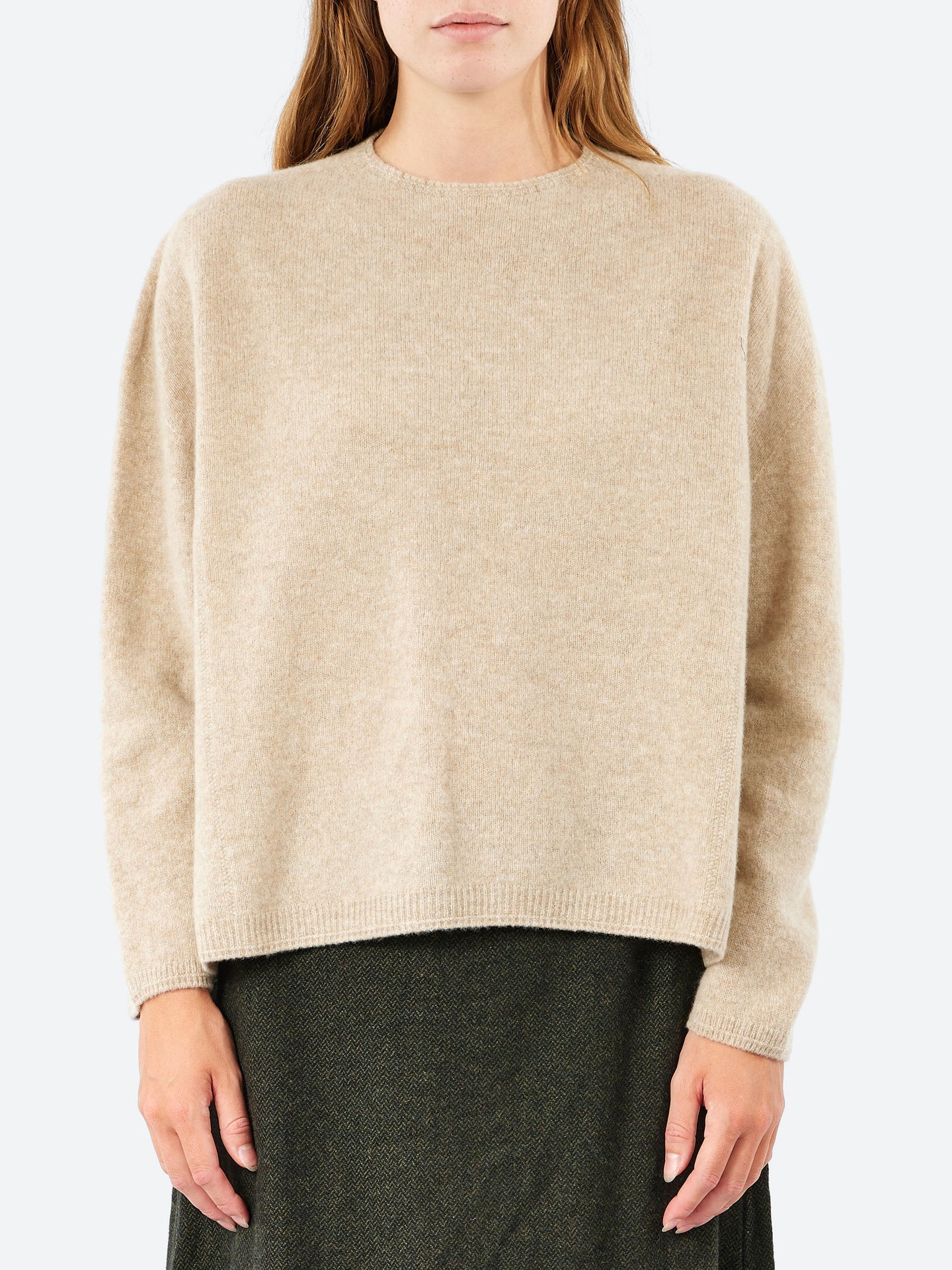 Crafted from fine wool, this lightweight knit offers exceptional softness, breathability, and a graceful drape that flatters every silhouette. Crew neckline, long sleeves, side slits, ribbed cuffs and hem. Relaxed fit.100% woolColor BeigeDry clean recommendedMade in Japan