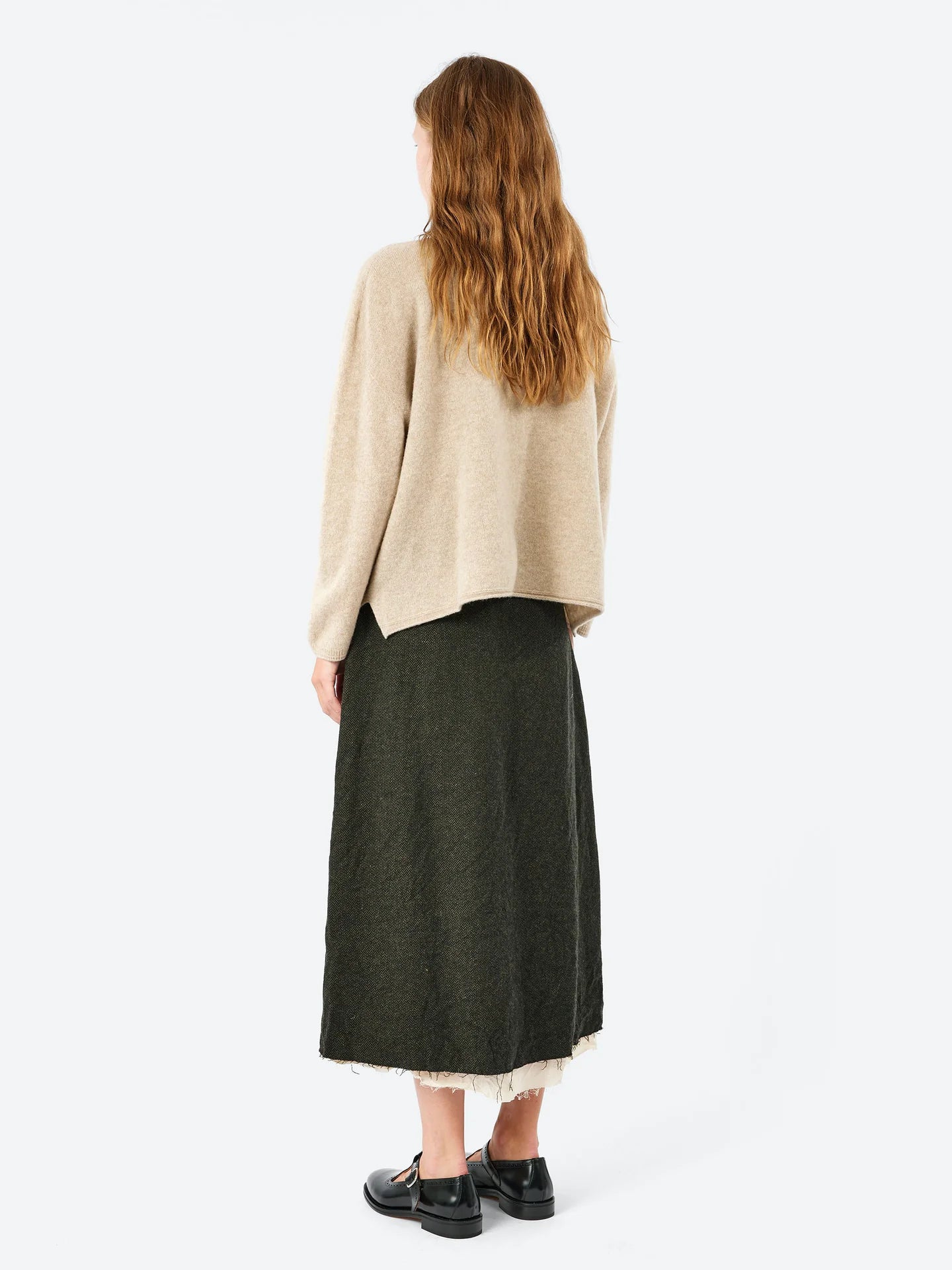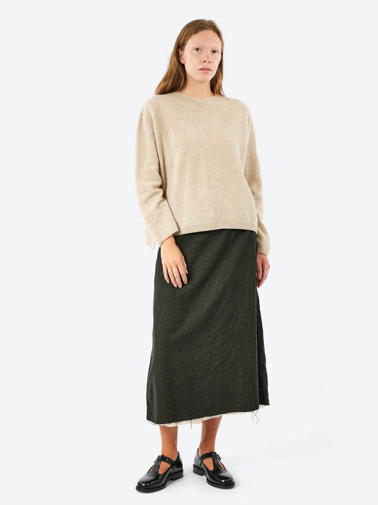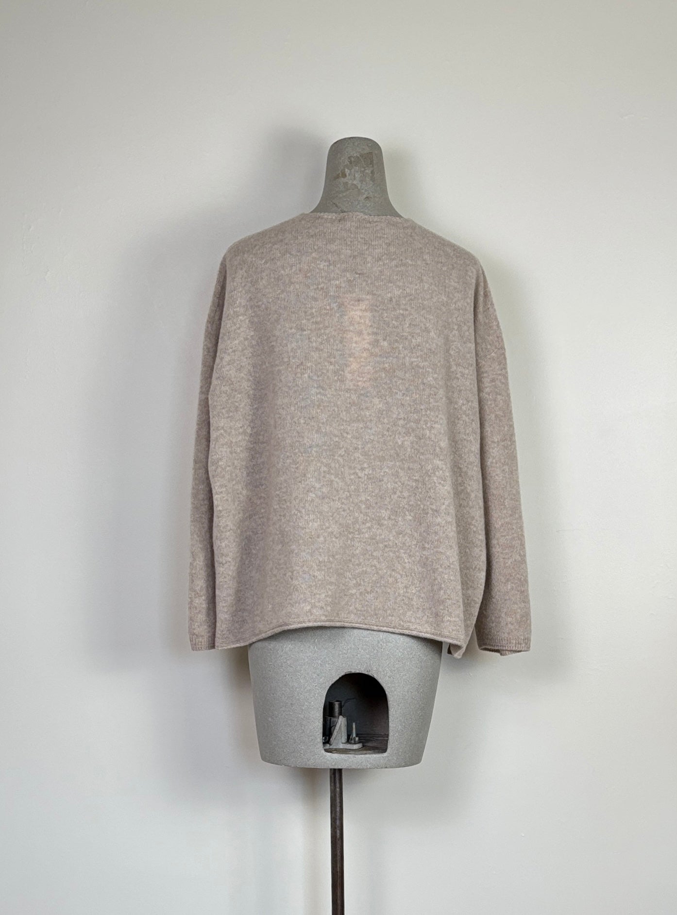 Crafted from fine wool, this lightweight knit offers exceptional softness, breathability, and a graceful drape that flatters every silhouette. Crew neckline, long sleeves, side slits, ribbed cuffs and hem. Relaxed fit.100% woolColor BeigeDry clean recommendedMade in Japan