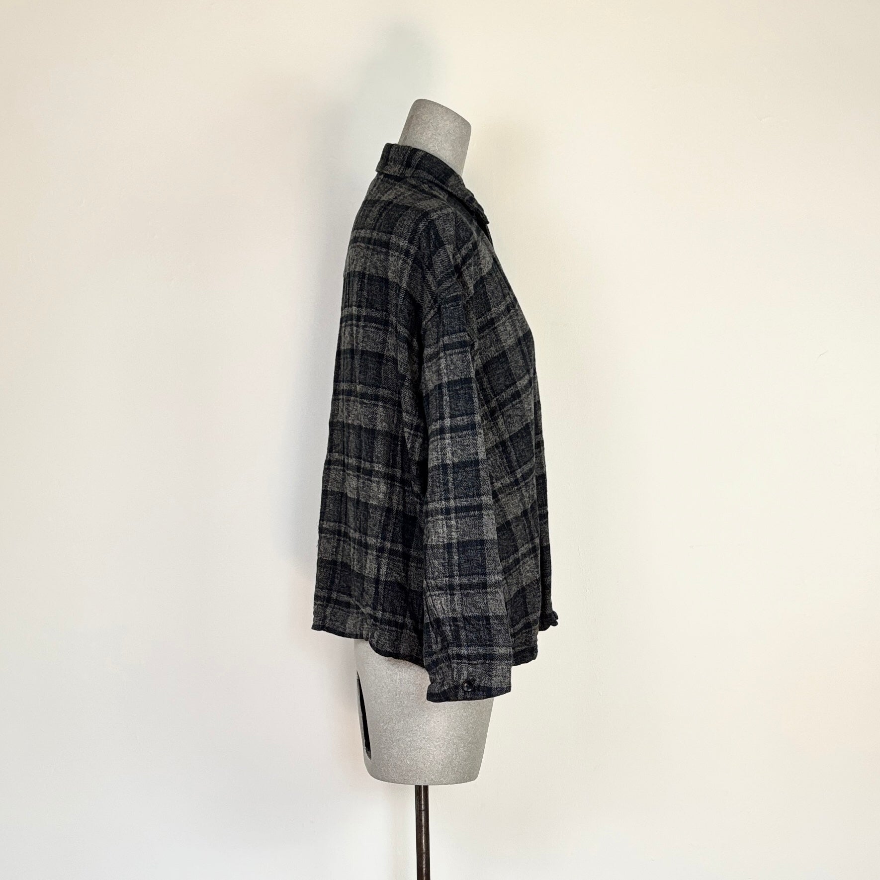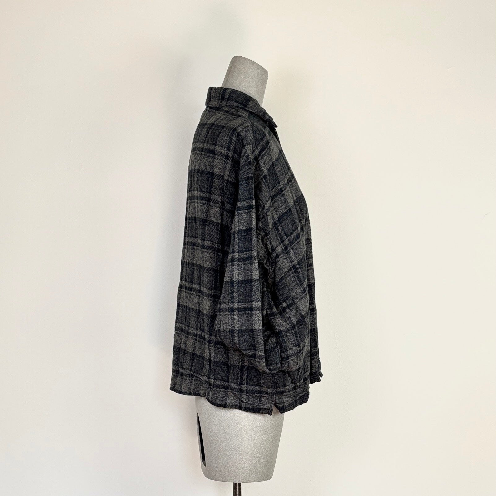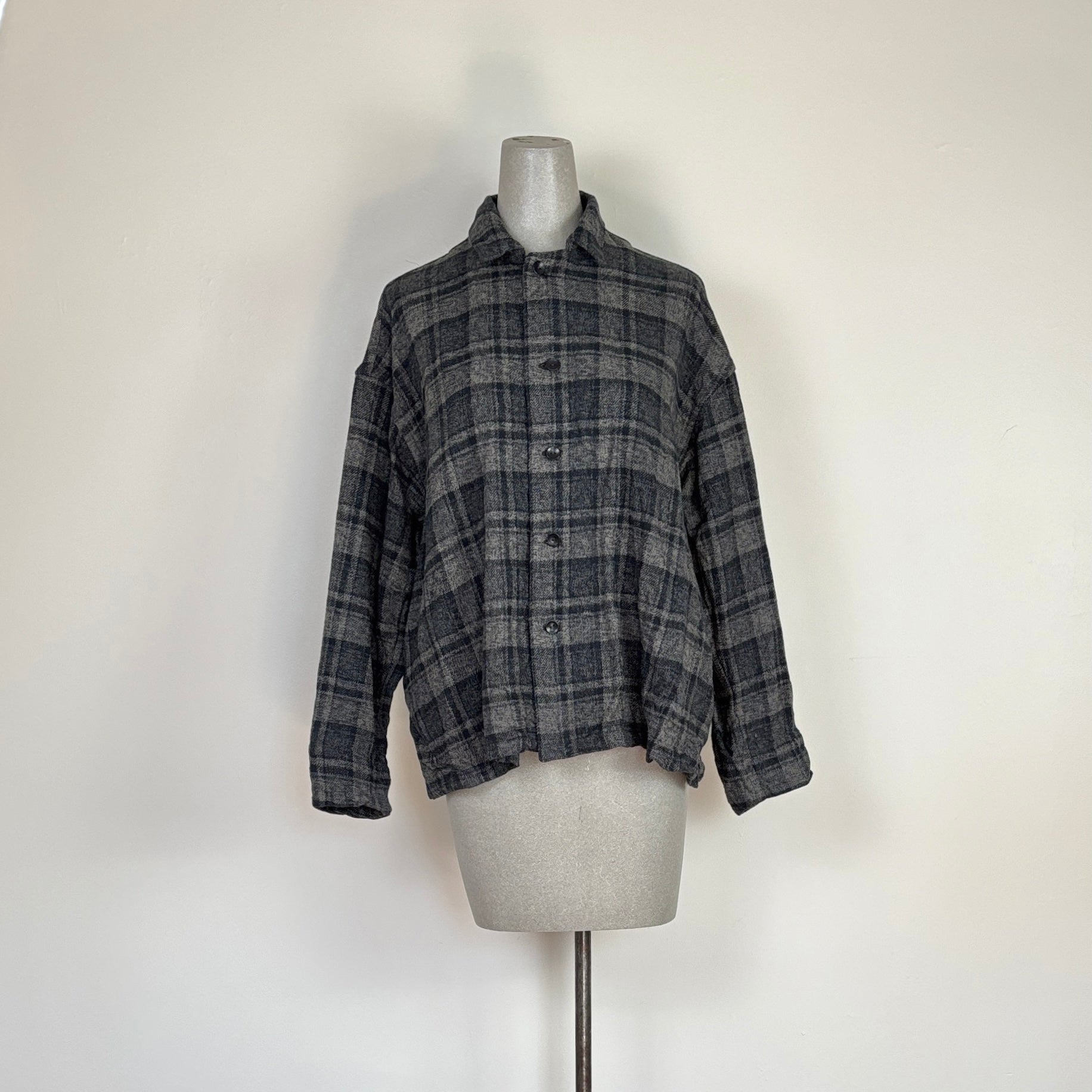 An oversized shirt jacket in a brushed cotton plaid. Camp collar, button front closure and side seam pockets.