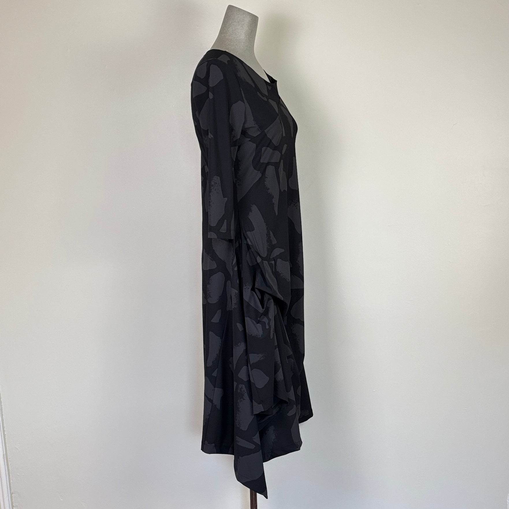 In breathable, washable, and wrinkle resistant jet jersey, a dress with 3/4 sleeves and a rounded neckline with twist detail. Off-center pin-tuck, drape detail, and side pockets. The mid length skirt has a fluid mobility and and asymmetrical hemline.72% breathable polyamide nylon, 28% lycraColor Smoke Palermo PrintGentle cycle machine wash in cold water. Hang or tumble dry low heat.Made in Italy