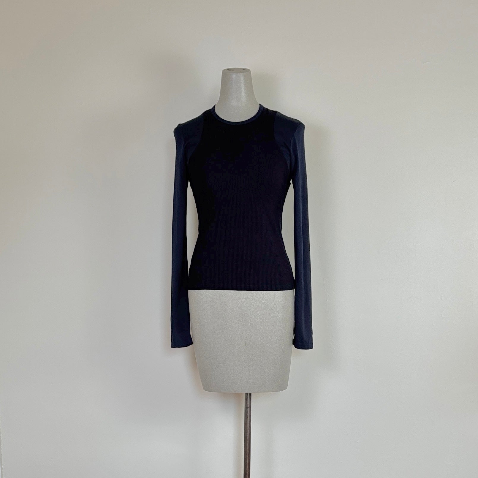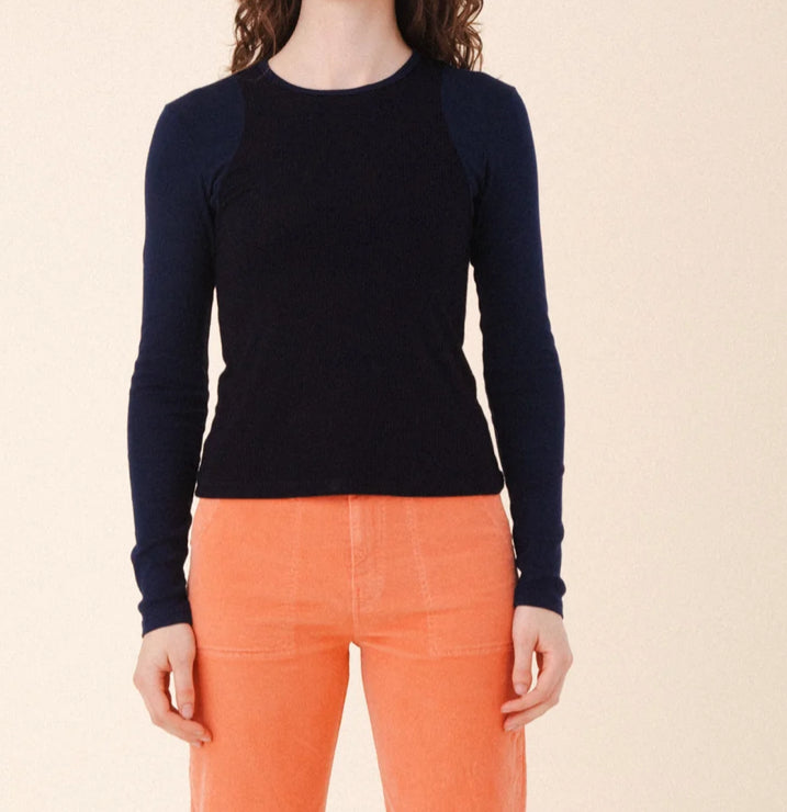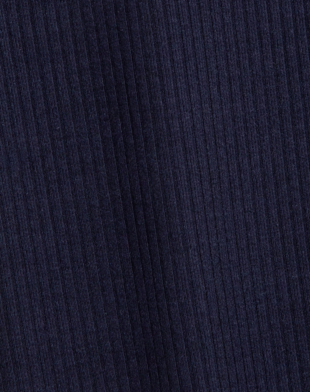 A lightweight long-sleeve layer with subtle ribbed texture. Made by combining organic baby-rib with silky-soft rayon spandex poor boy rib, this top features a crew neckline, long fitted sleeves, and a body skimming fit with stretch.Body 100% organic cotton, sleeve/shoulder 100% rayonColor MidnightCold water machine wash on gentle cycle. Lay flat or tumble dry low heat.Made in Seattle, USA