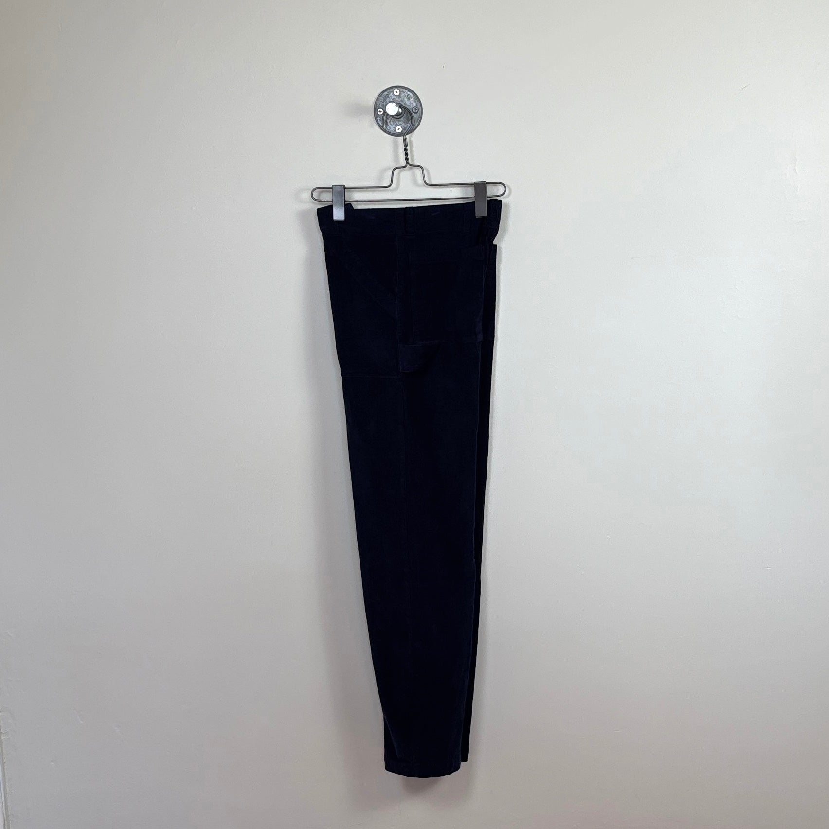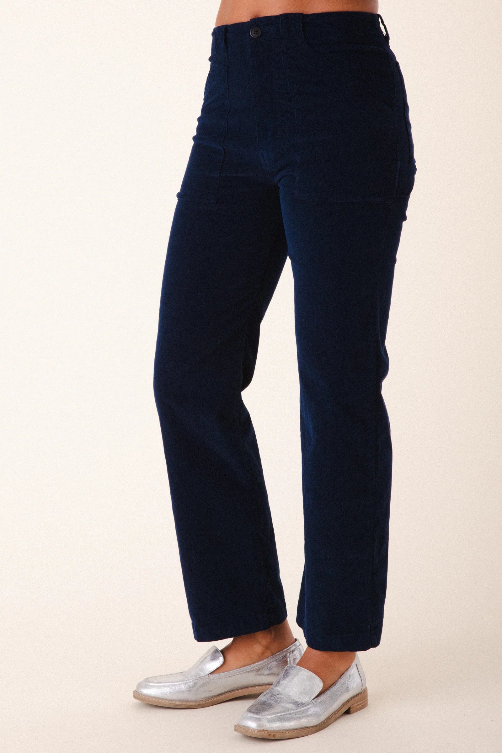 This pant features an extremely high-rise and a slightly engineered outer seam for a more flattering fit than traditional workwear. Composed of a rich, velvety stretch corduroy for extreme comfort. Zip and button closure, full length 30” inseam to wear cuffed or puddled, utility pocket and hammer loop, spacious back patch pockets.97% cotton, 3% spandex (high-stretch textile will give half size with wear)Color MidnightCold water machine wash on a gentle cycle. Lay flat or low heat tumble dryMade in Seattle, U.S.A.