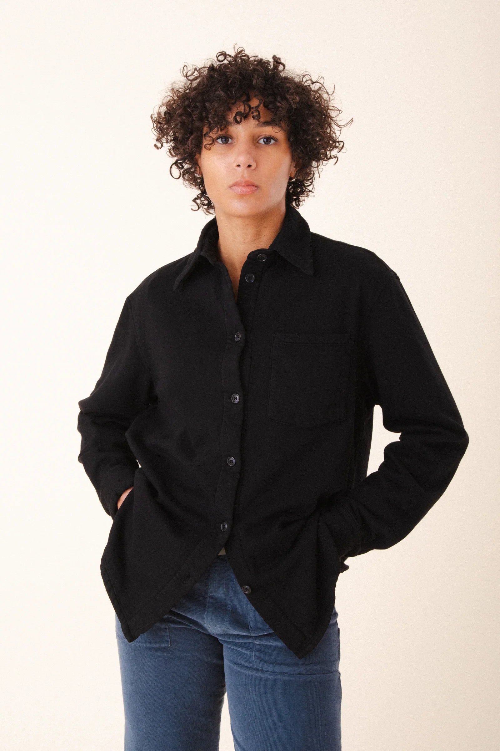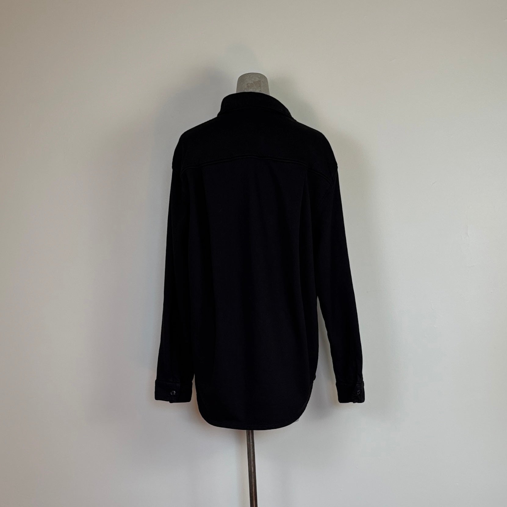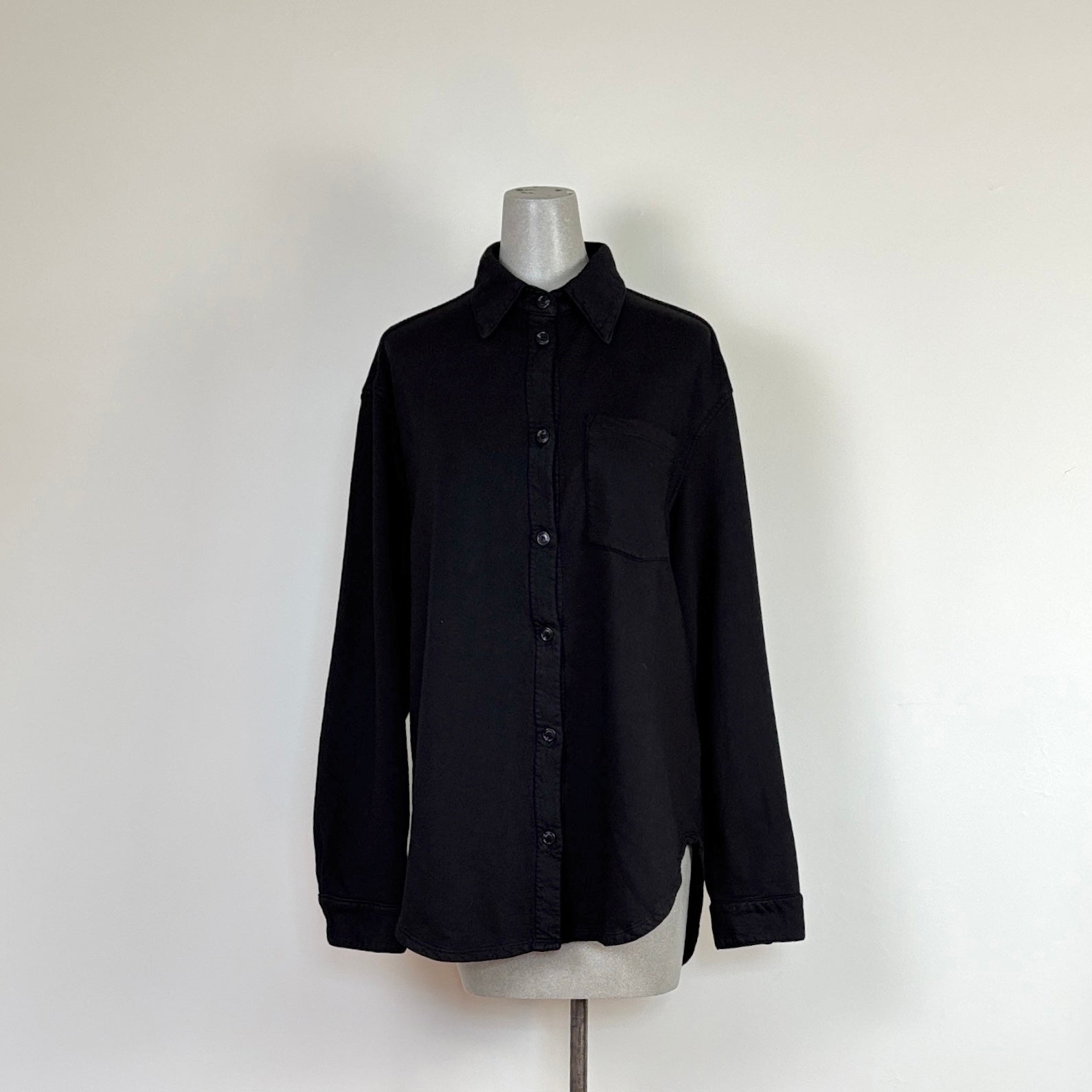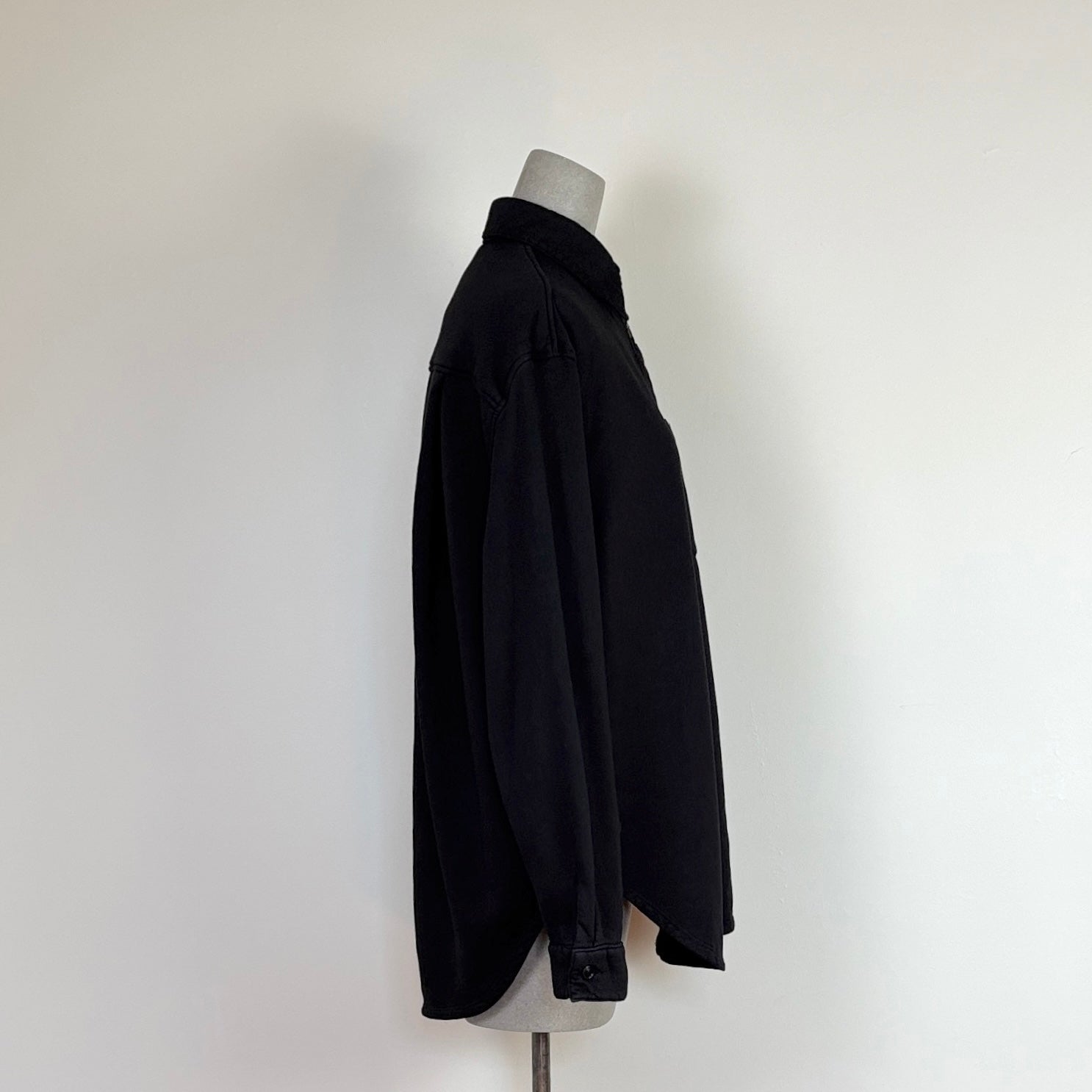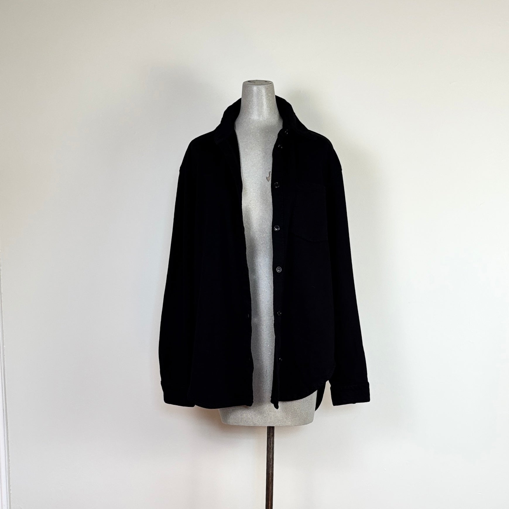 The softest fleece shirt in an unconventional textile is a Prairie hallmark of their design methodology. A boxy knit shirt, composed of Organic Cotton Fleece that has been over-dyed for softness and tonality. A button-front shirt with a high collar and deep back pleating, left breast pocket and side vents.100% organic cotton grown in Texas and knit in South CarolinaColor BlackCold water machine wash on gentle cycle. Lay flat or short tumble dry on low heat.Made in Seattle, U.S.A.
