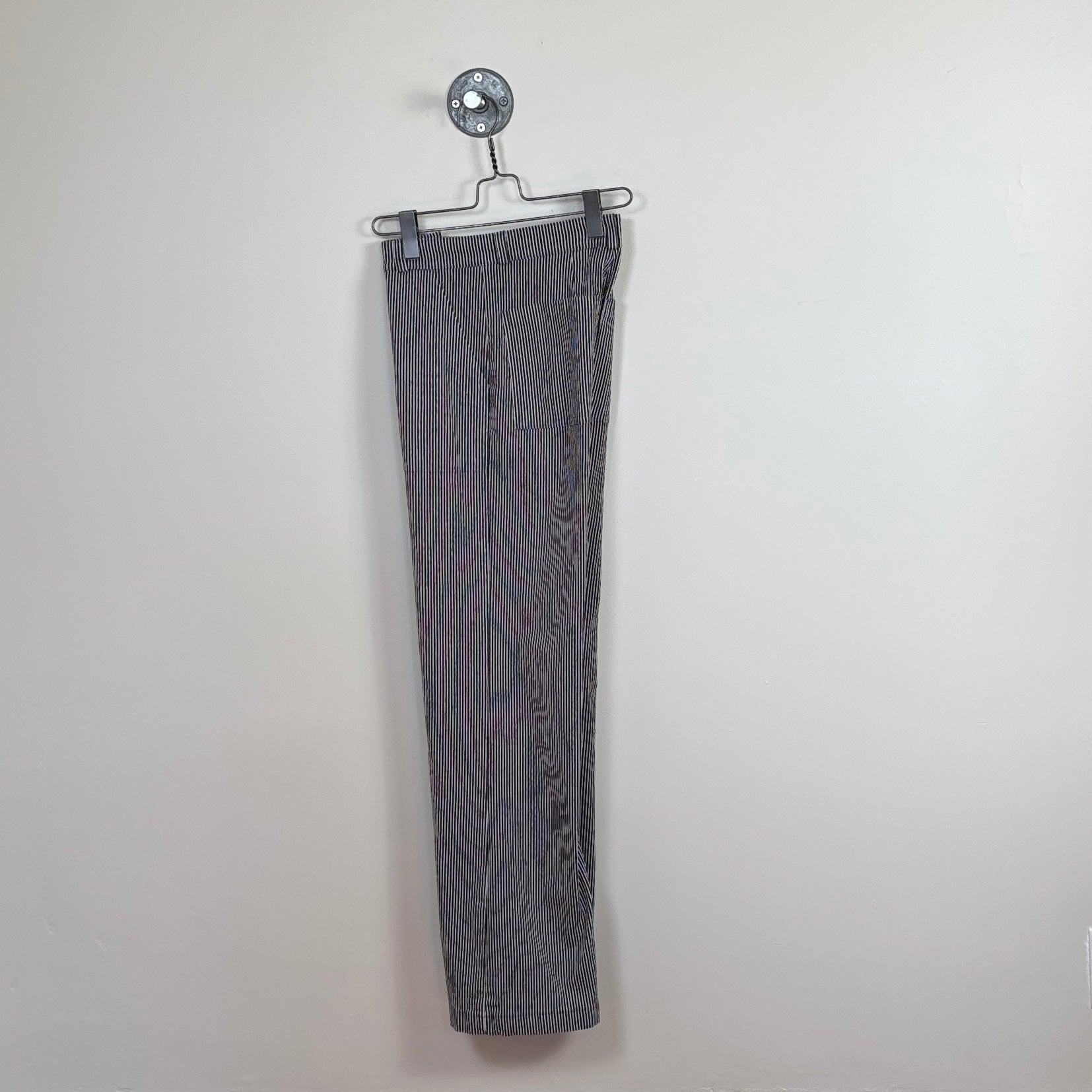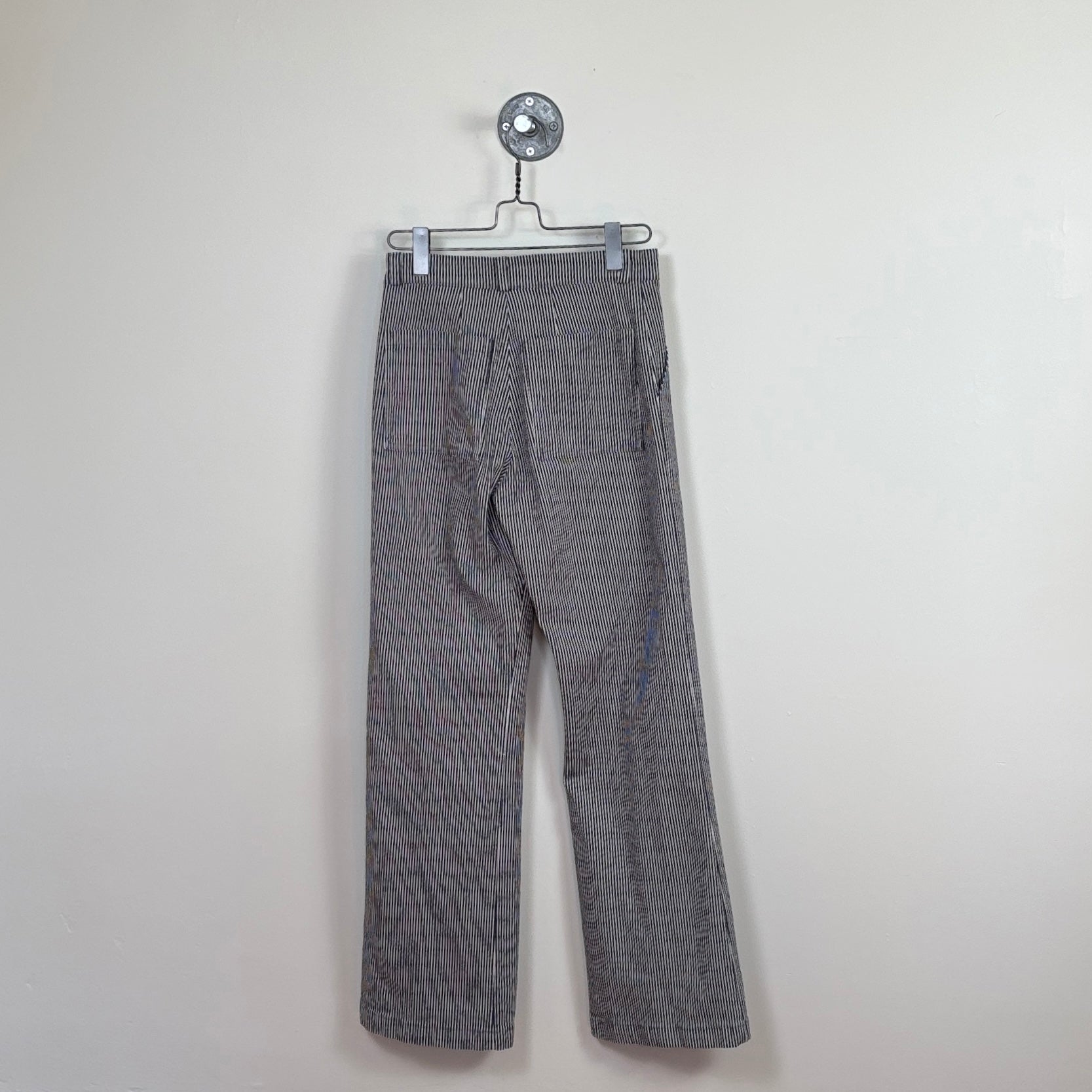 A high-rise utility pant in a heavyweight stretch textile that retains its shape while conforming to your body. Incredibly comfortable and industrious. A mostly fitted leg straightens below the knee. These pants are pre-shrunk and will retain their shape. High-rise zip and button closure with belt loops. 31” inseam. Secured front pockets with an angled opening. Large back patch pockets98% Cotton 2% SpandexColor Oyster StripeCold water machine wash on gentle cycle. Hang or tumble low heat.Made in Seattle, U.S.A.