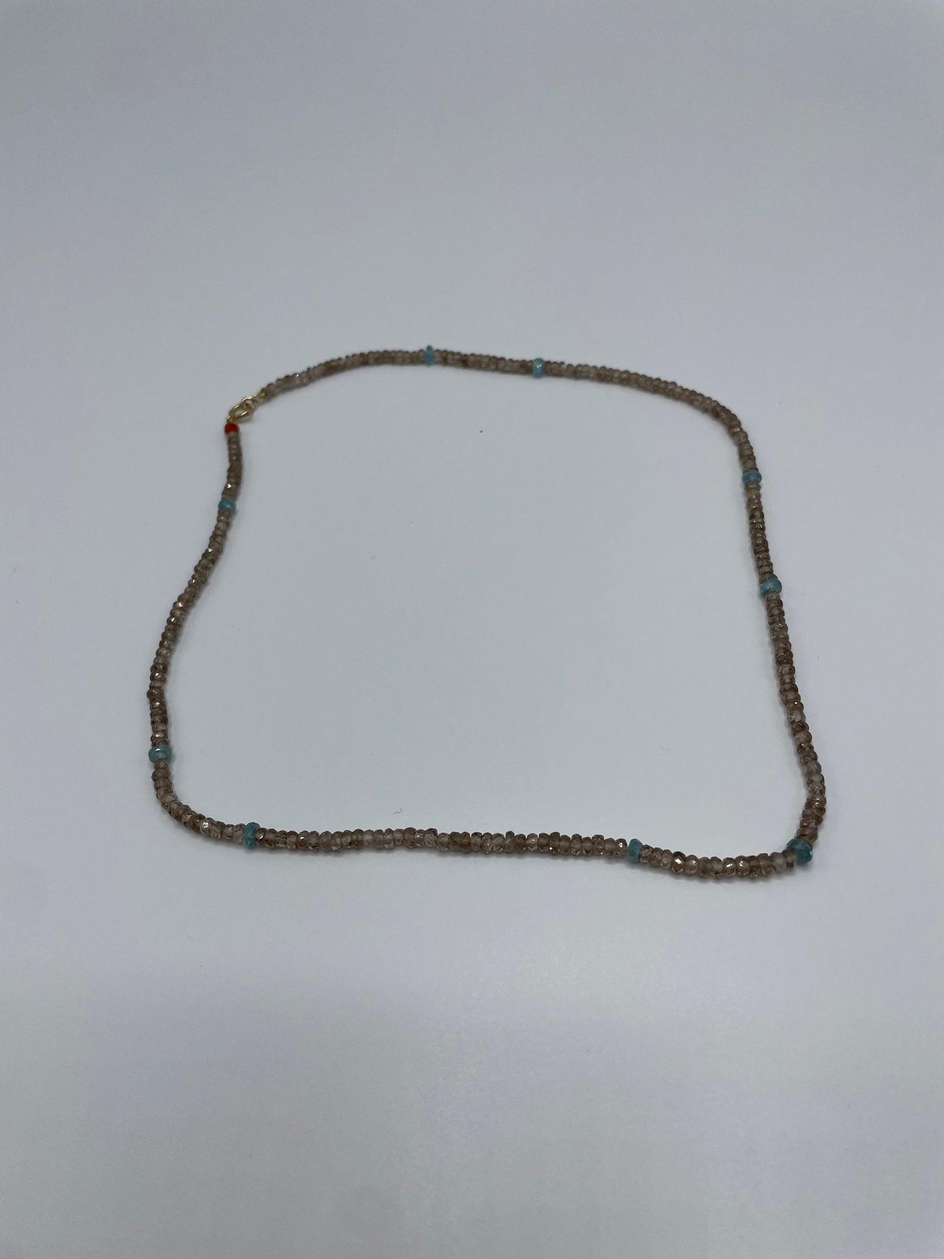 A necklace of natural colored faceted zircons with randomly spaced blue zircons + a carnelian accent bead and 14K gold spring ring clasp. Measures 17.5”