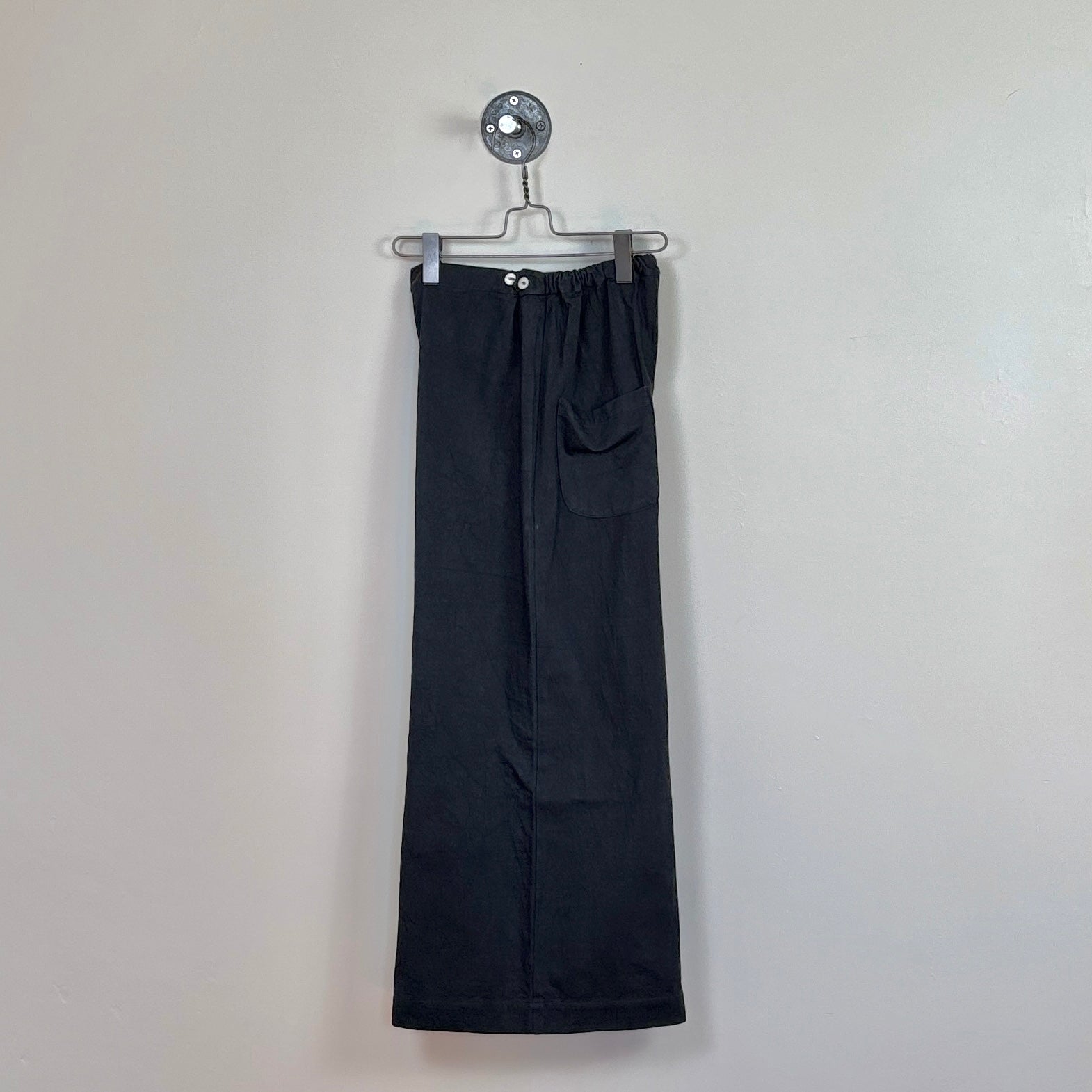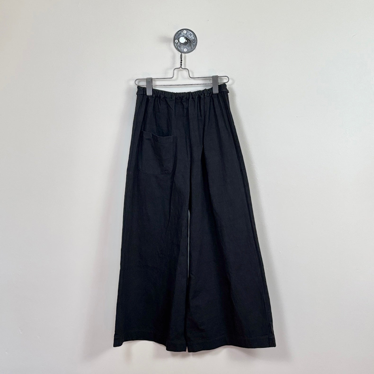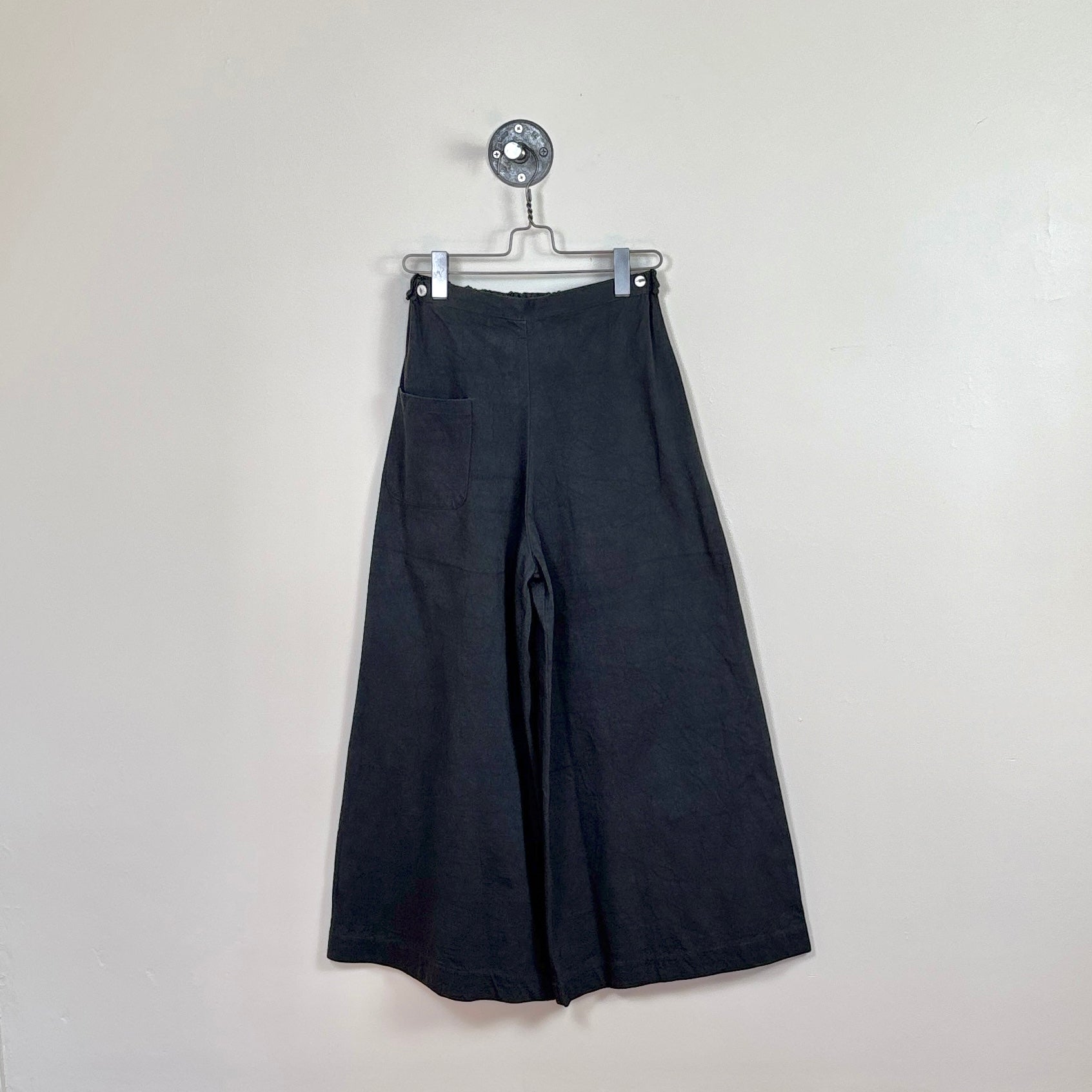 A wide leg pant with one patch pocket on the front and one on the back. The back of the waistband is elasticated with buttoned cinchers on the side of waistband making the waist adjustable