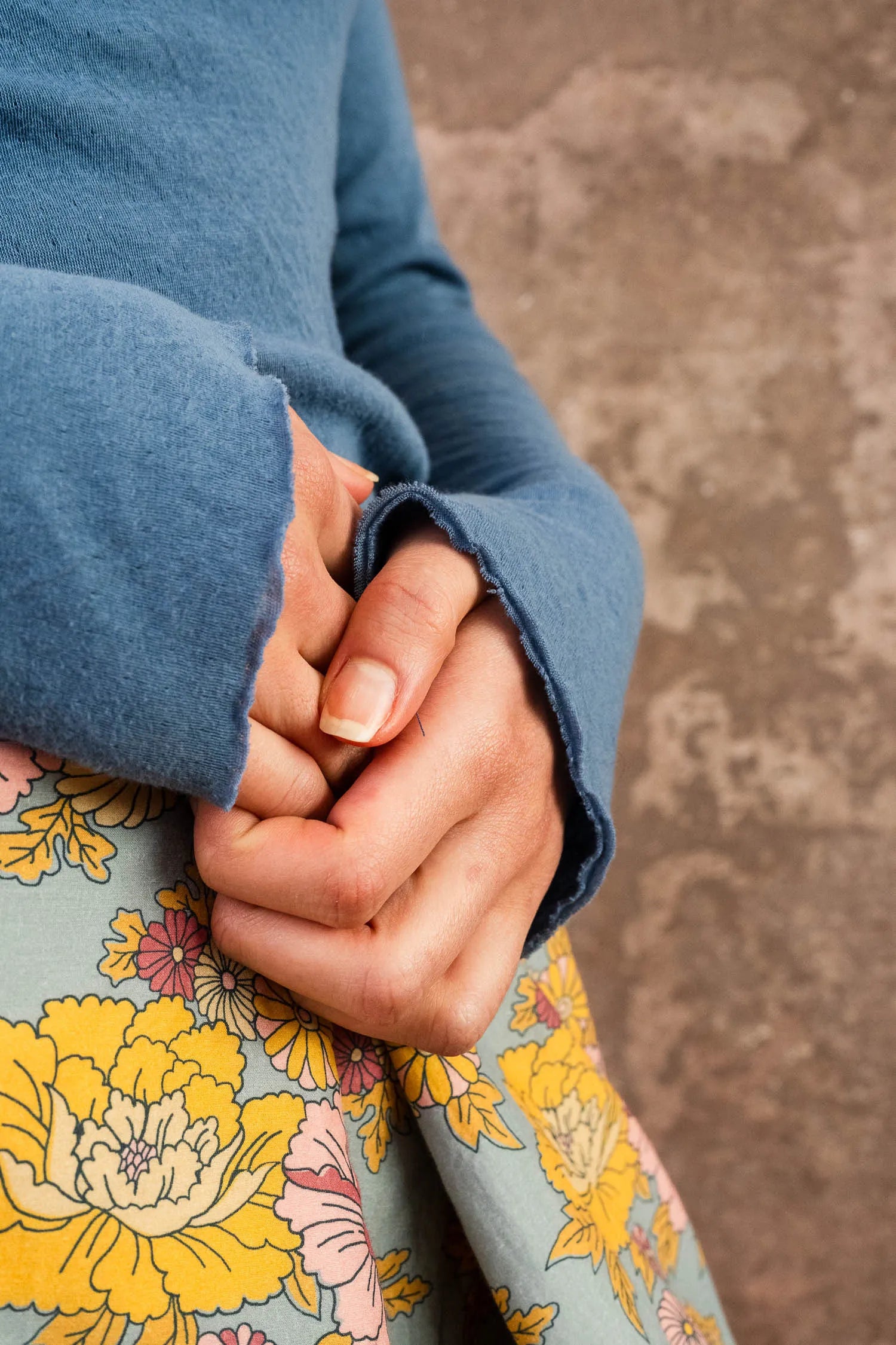 A cotton long sleeve tee with a round neck, seam down the centre back and raw edges at the neck, cuff and hem. Made in a soft double layer cotton jersey from Japan.