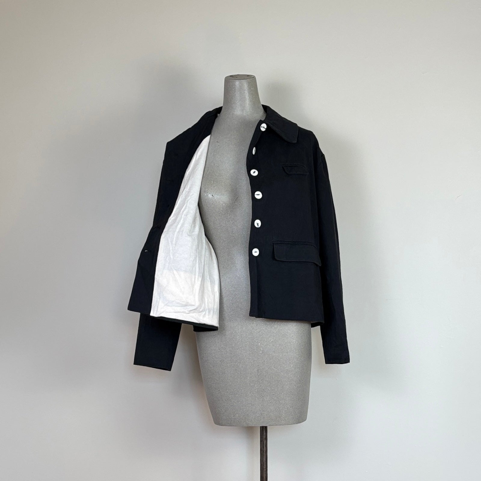 A cotton twill jacket with welt flap pockets, painted wooden buttons, wrist length sleeves, and lined with a crisp cotton fabric.100% cotton, Japanese twillColor BlackCold water machine wash on a gentle cycle. Line dry.Hand made, one by one by artisans Vietnam