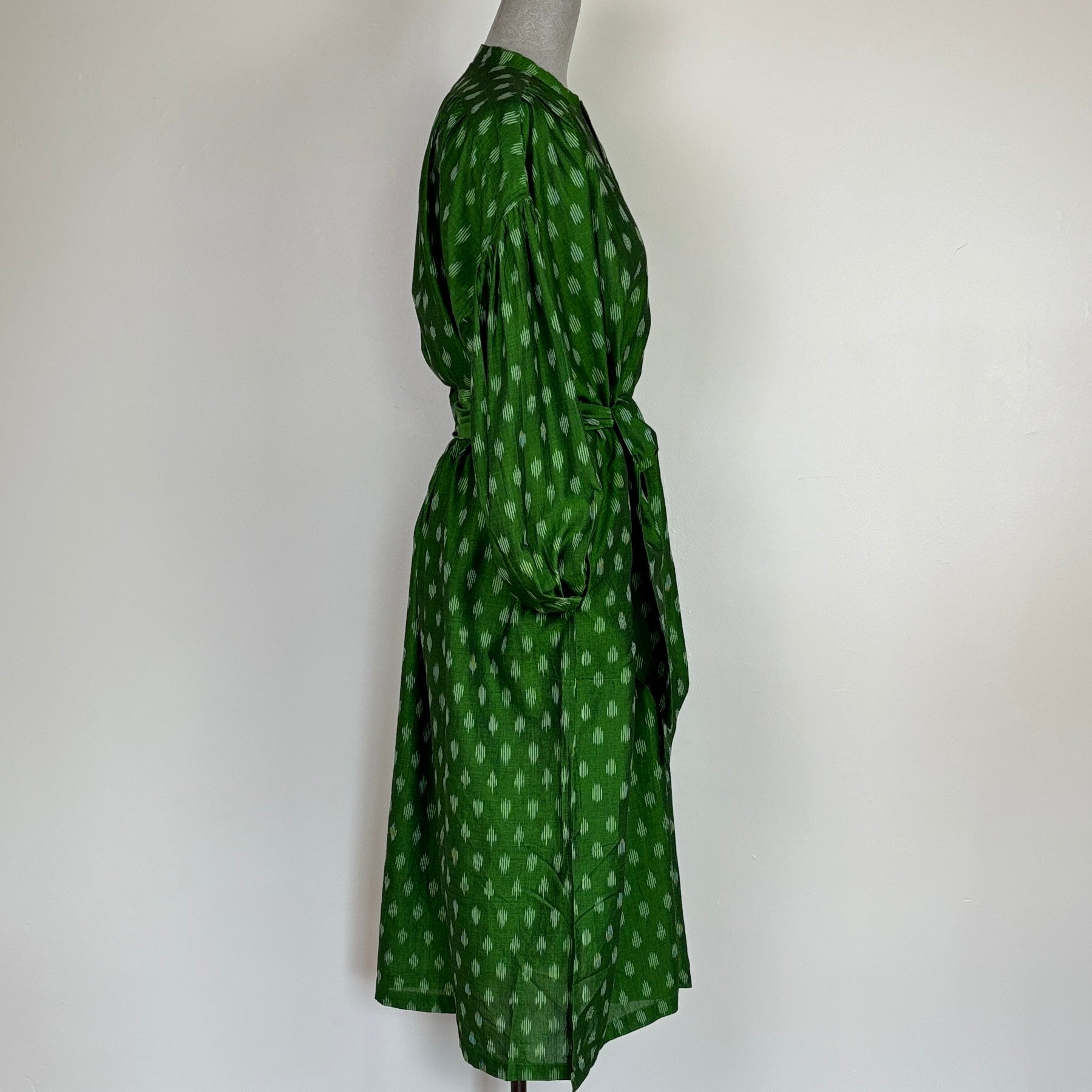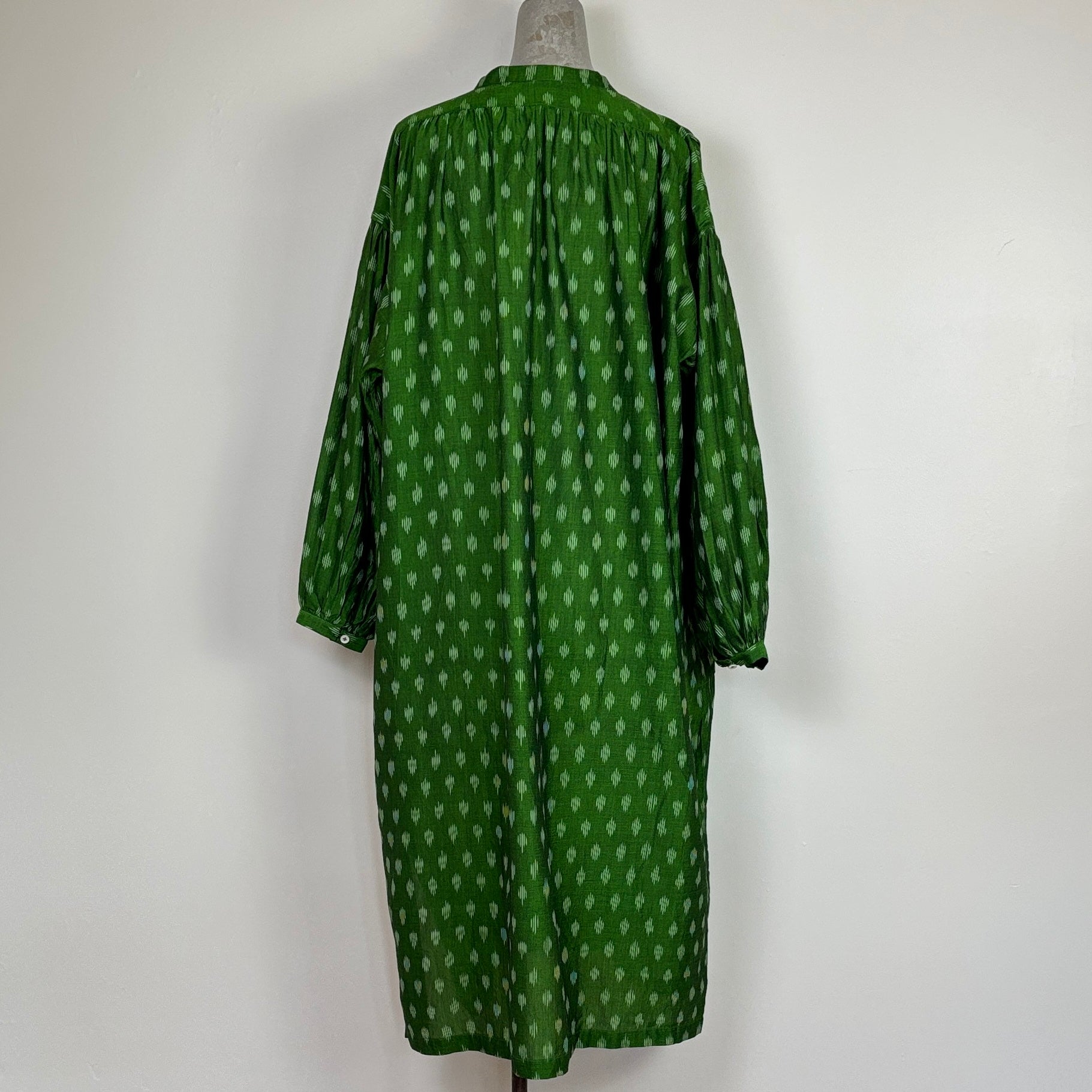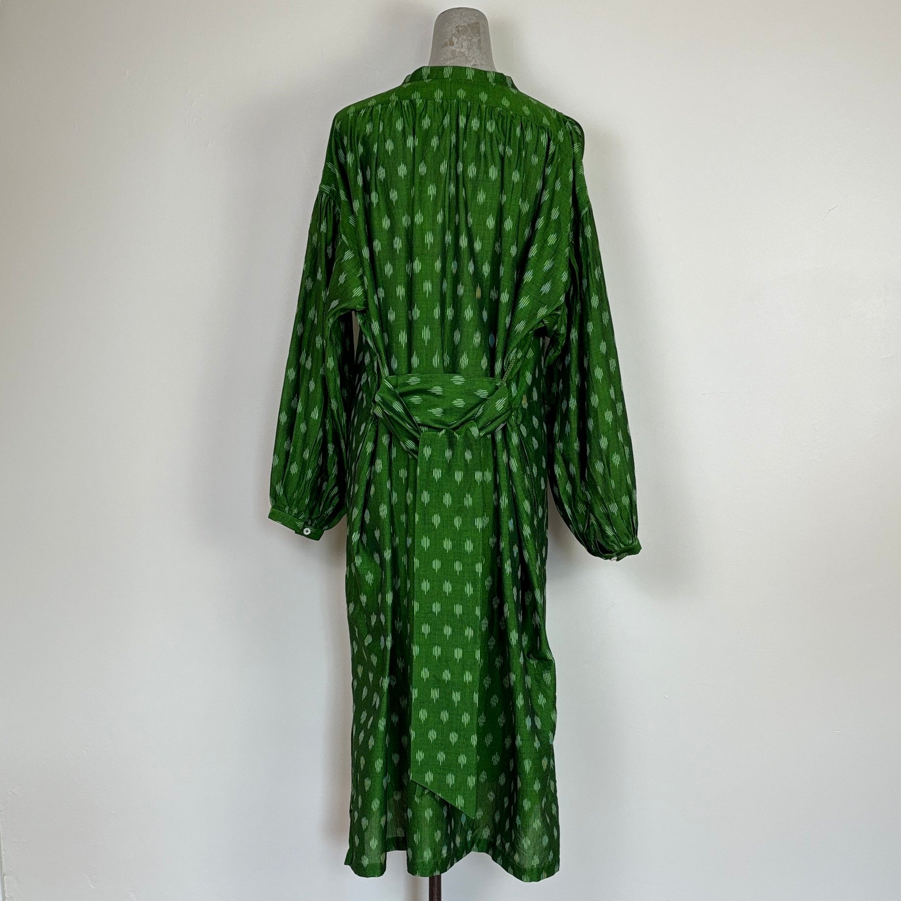 A mid-long dress with a button front popover placket, gathered sleeves, vintage underarm gusset, side vent, and gathered back. Comes with a wide self belt. Generous fit.
