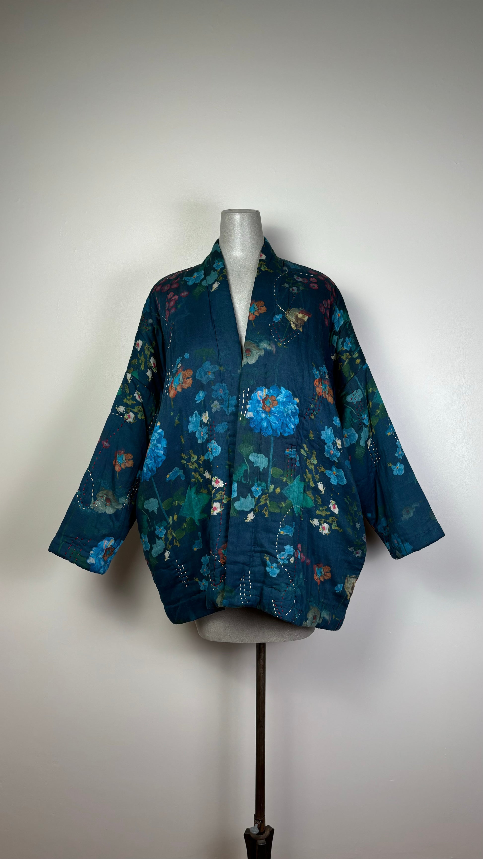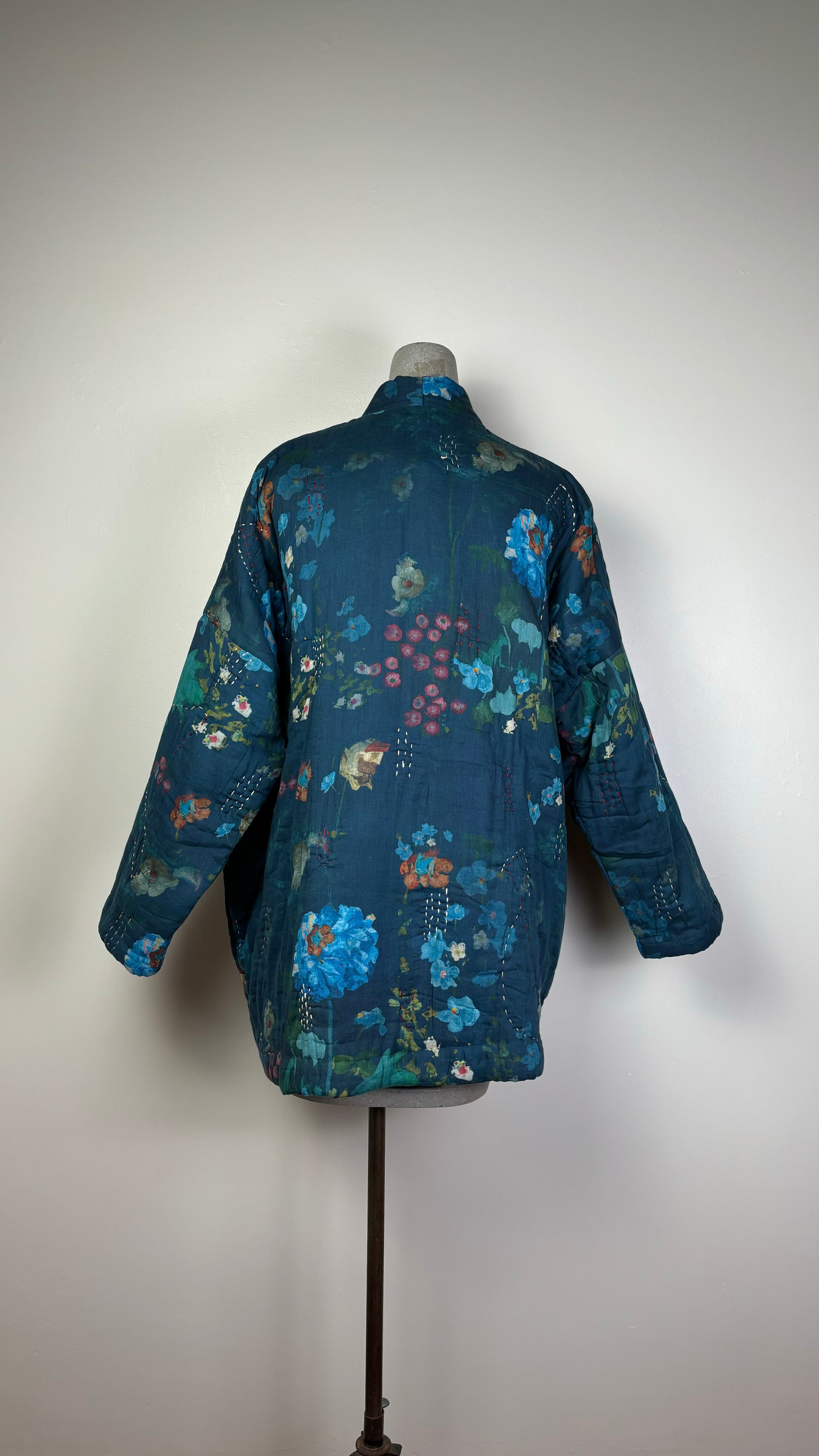 A long jacket/coat in a floral printed and quilted cotton. Exterior features running stitch embroidery, side seam pockets, shawl collar, drop shoulder, a no button front. Interior fabric has a subtle grid pattern with a tiny gold dot. Fit is relaxed but not oversized.