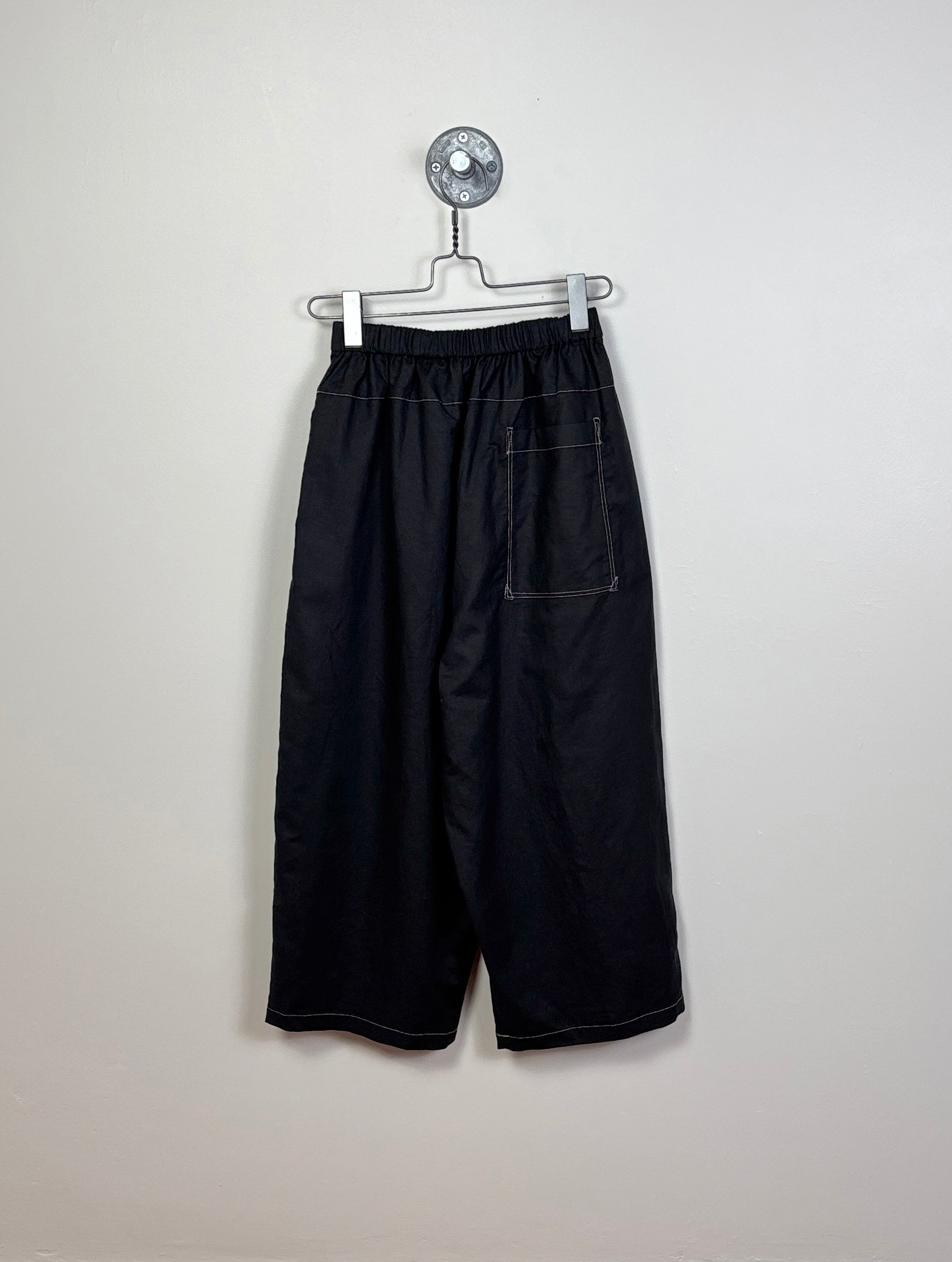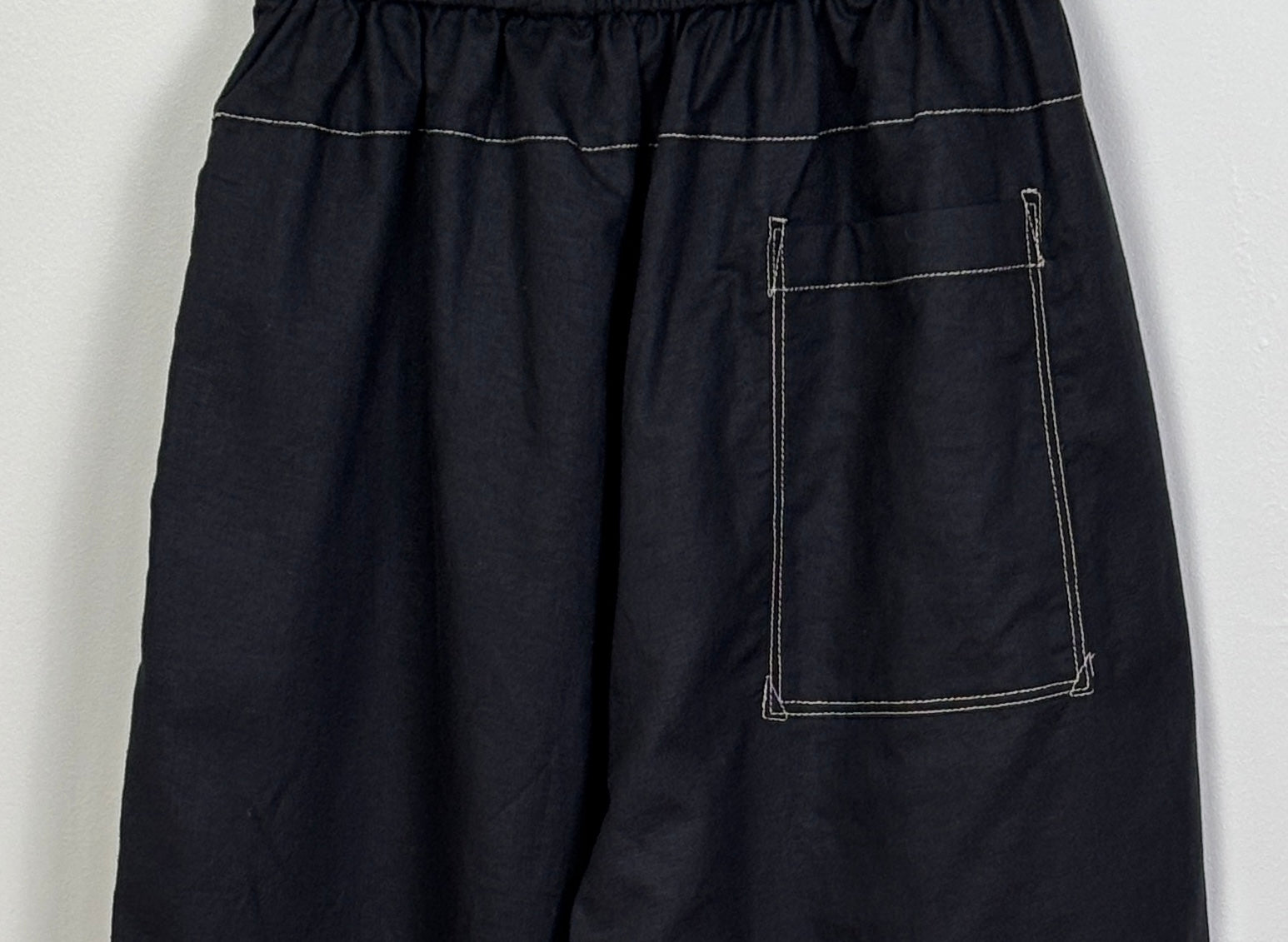 In the linen/cotton dyed sheeting fabrication, a pull on pant with an elasticated waistband, side seam pockets, and a wide cropped leg that tapers gently at the hem. One deep pack patch pocket and natural topstitching at most seams. Fit of pant is meant to be full through hip and thigh.